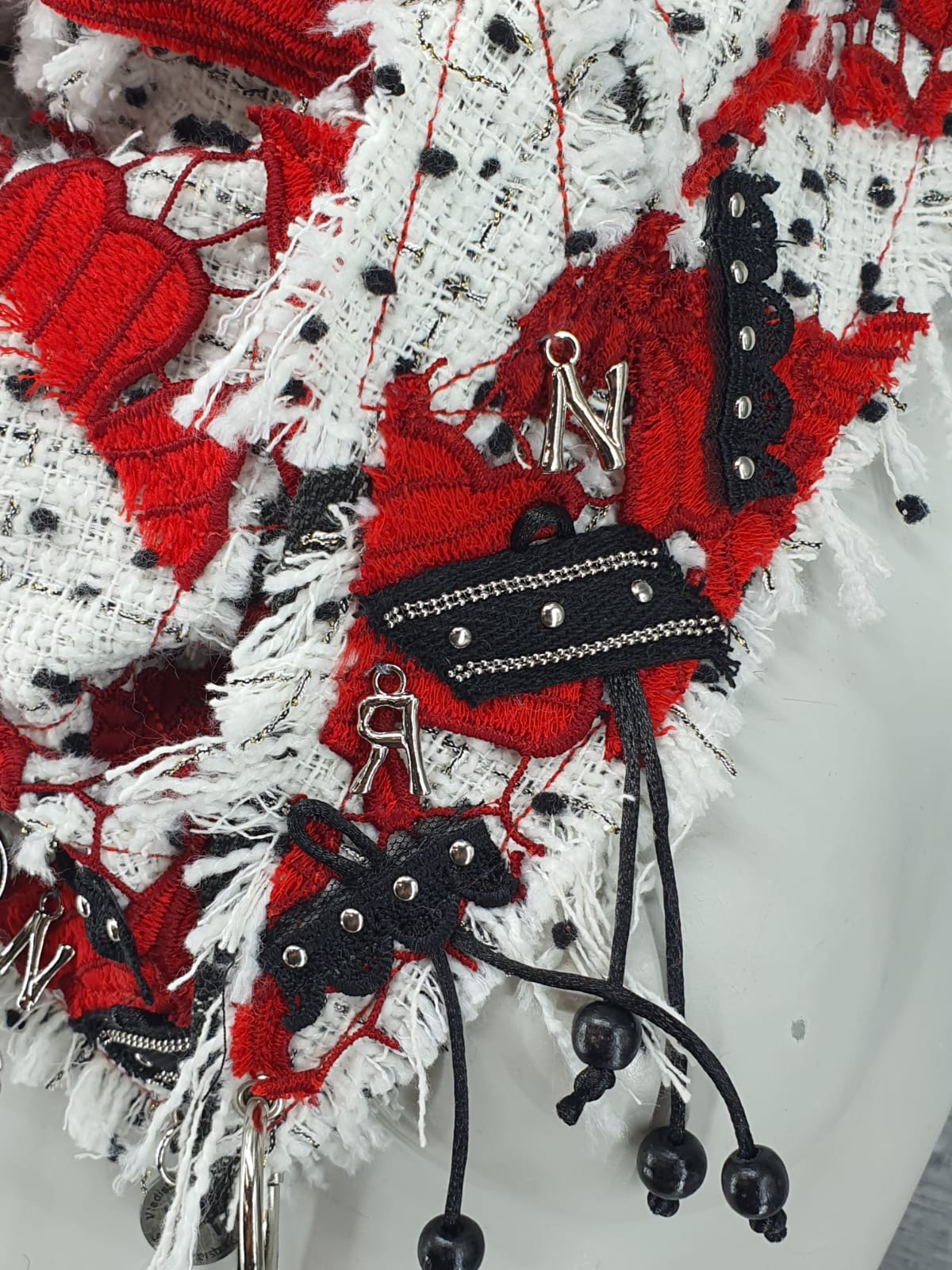 Шарф из белой ткани "шанель" на серой основе в клетку, декорирован красным кружевом, лентами, буквами и деревянными бусинами на шнуре. Подарите себе праздник!