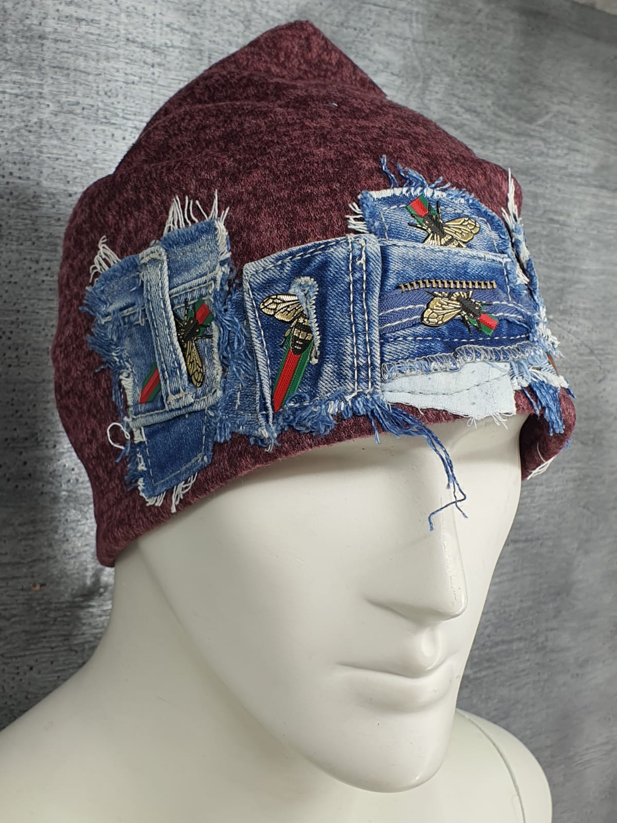 Шапка из бордового трикотажа с голубыми джинсами и наклейками.