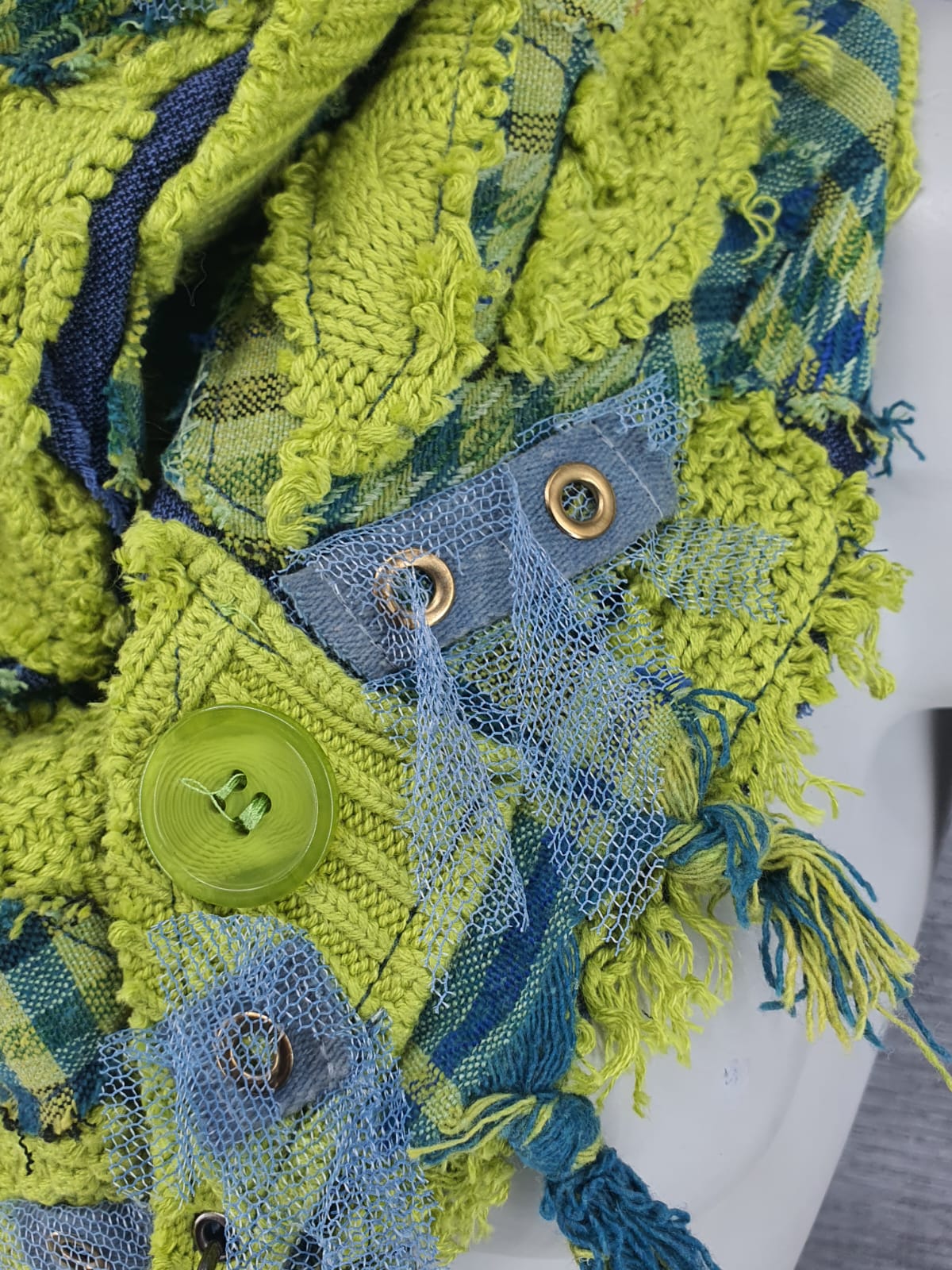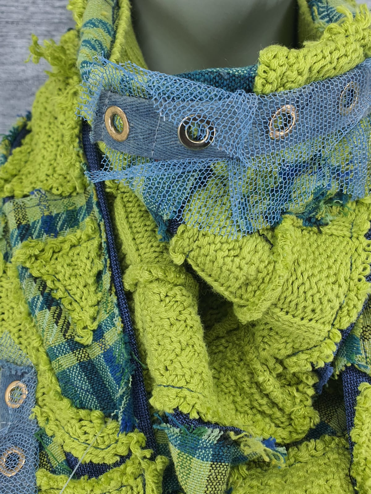 Шарф в салатовых цветах из свитера и арафатки на синей основе, декорирован лентой с люверсами и сеткой. Заяви о себе по новому!