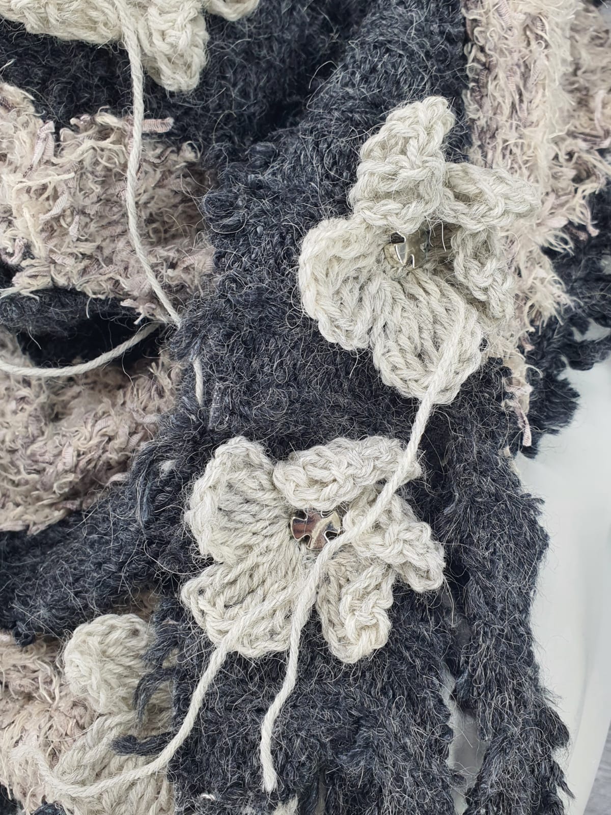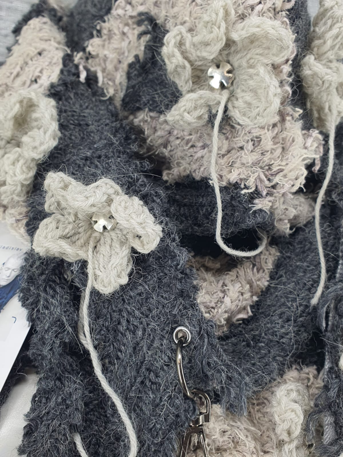 Шарф из серых джемперов на серой клетчатой основе, декорирован вязаными цветами. Так тепло и уютно!