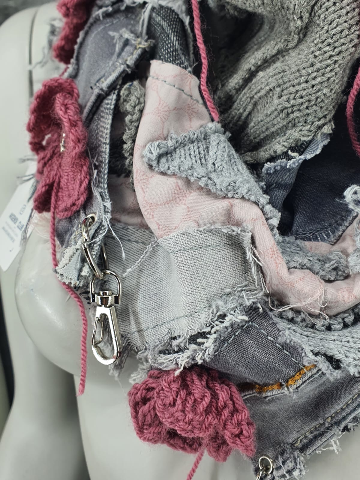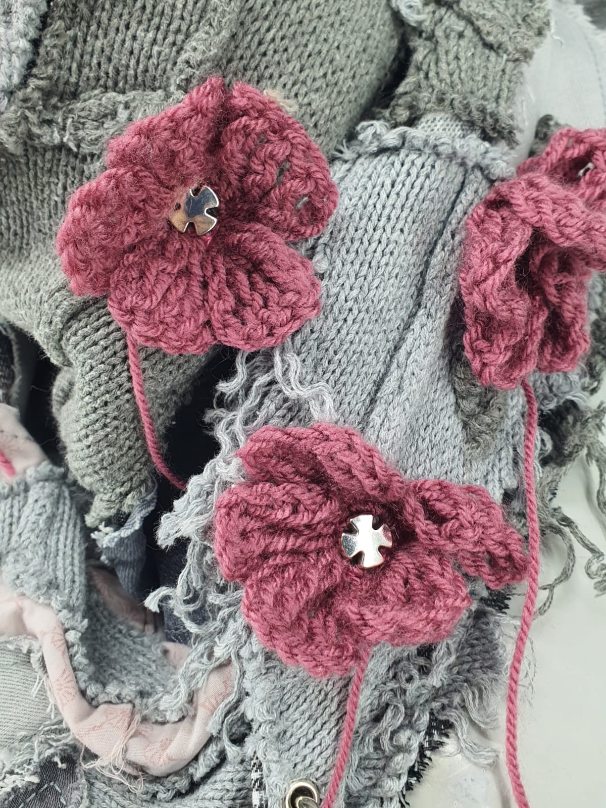 Шарф из серых джемперов и джинсов на серой клетчатой основе, декорирован вязаными цветами. Так тепло и уютно!