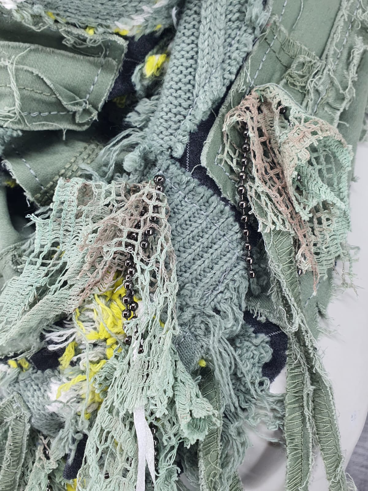 Шарф из свитера и джинсов в салатовых оттенках на серой основе, декорирован цепочками с винтажным кружевом.