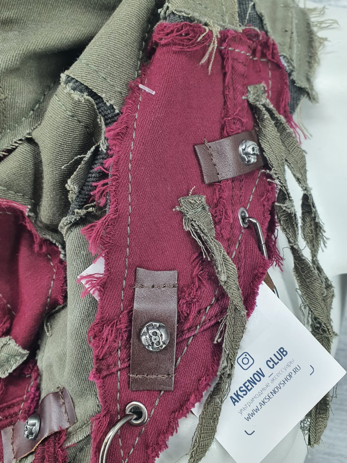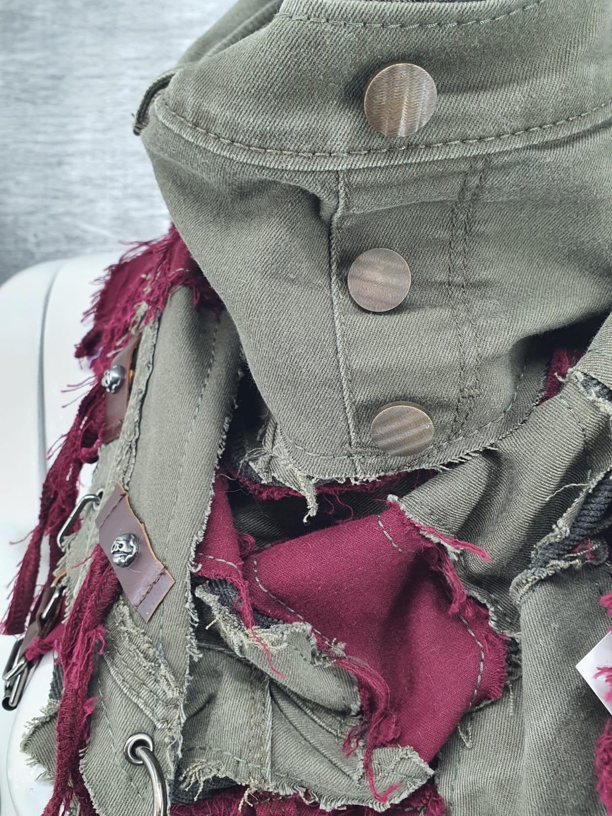 Шарф из зелёных и бордовых джинсов на тёмно зелёной микровельветовой основе, декорирован кожаными нашивками и подвесами. Взгляни на мир по новому!