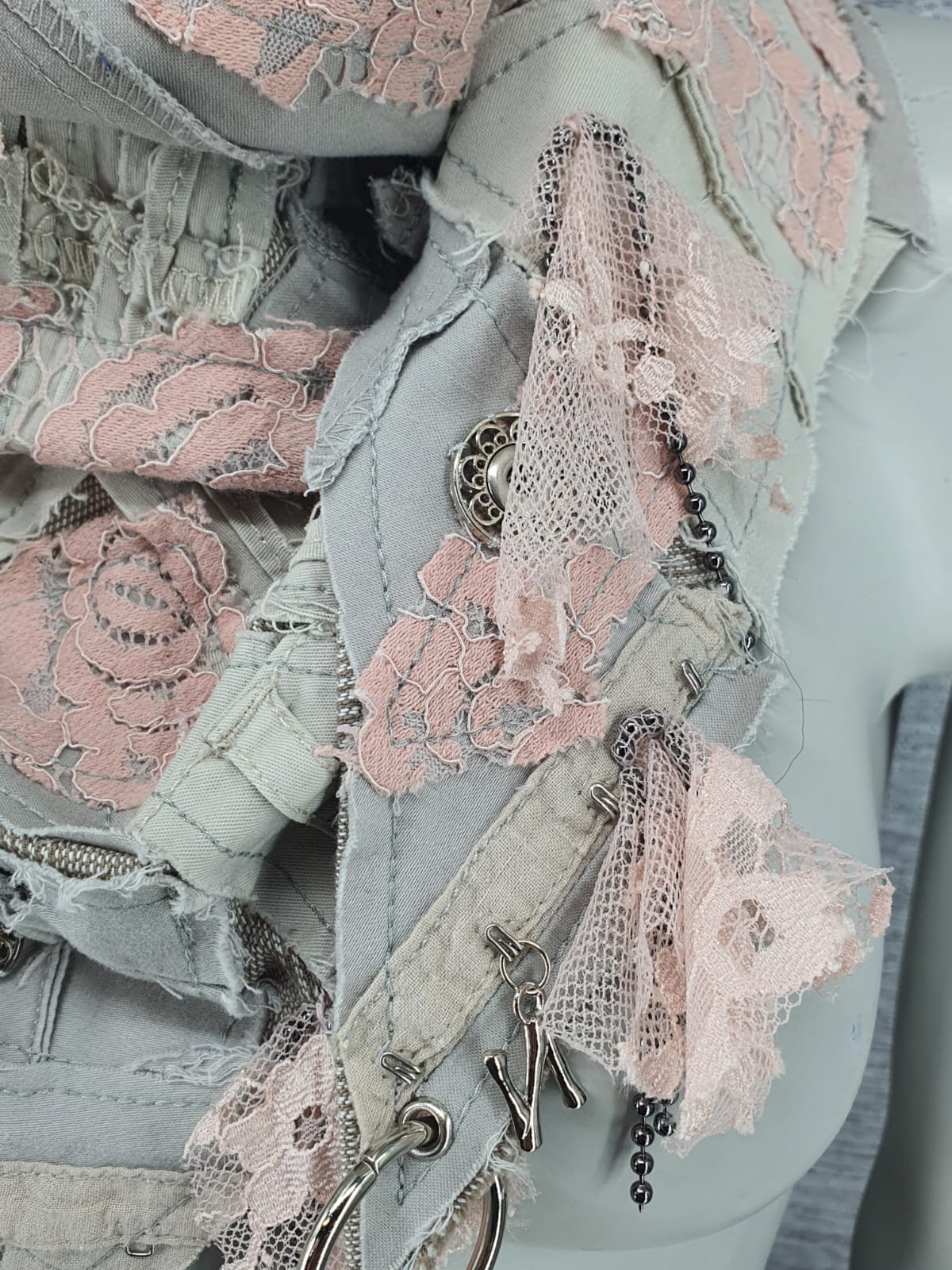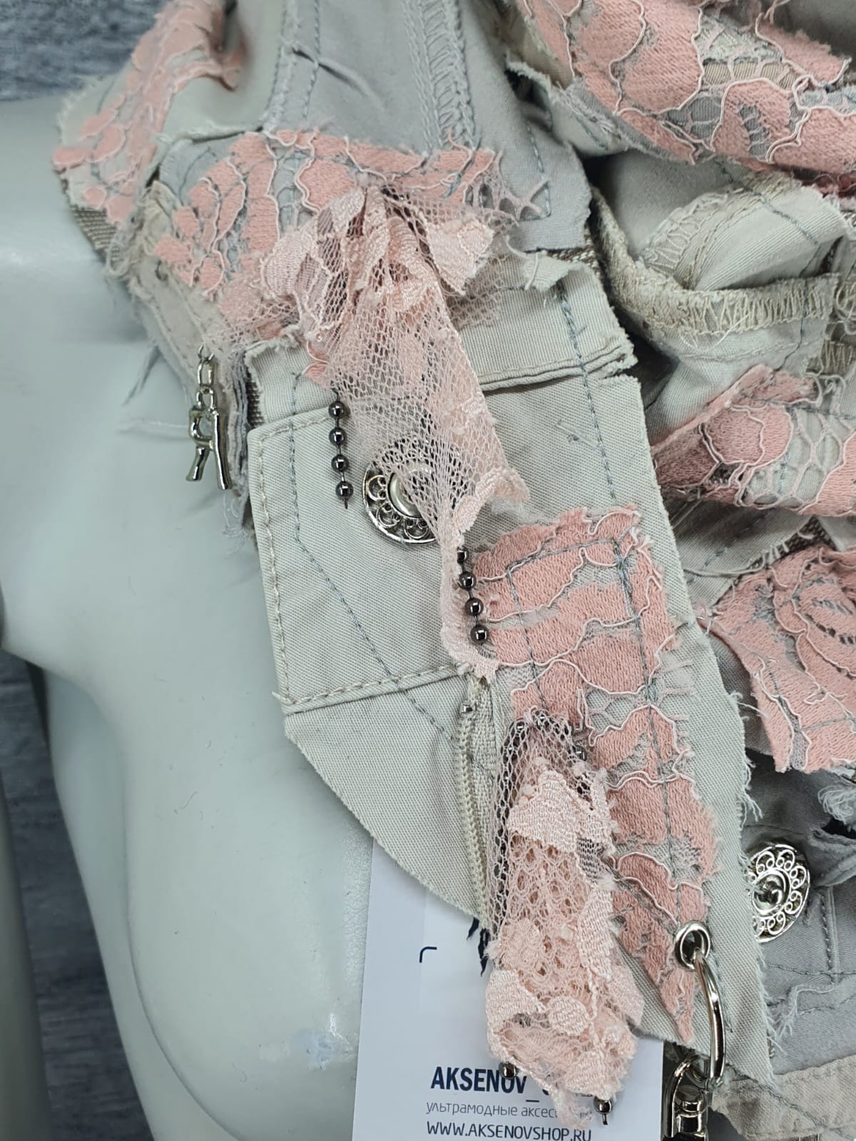 Шарф из лёгких хлопковых джинсов на бежевой основе, декорирован цепочками в кружеве, кнопками и буквами. Ваш имидж с налётом романтики.