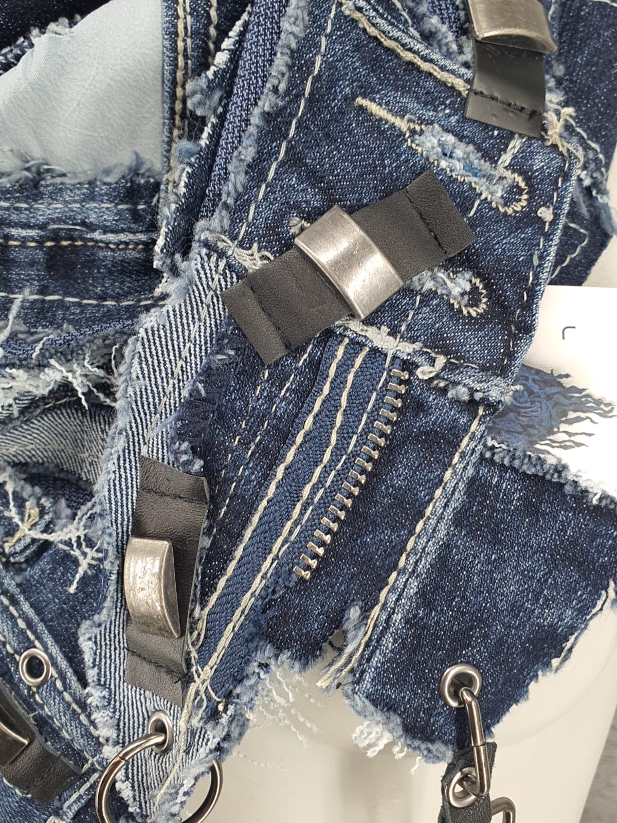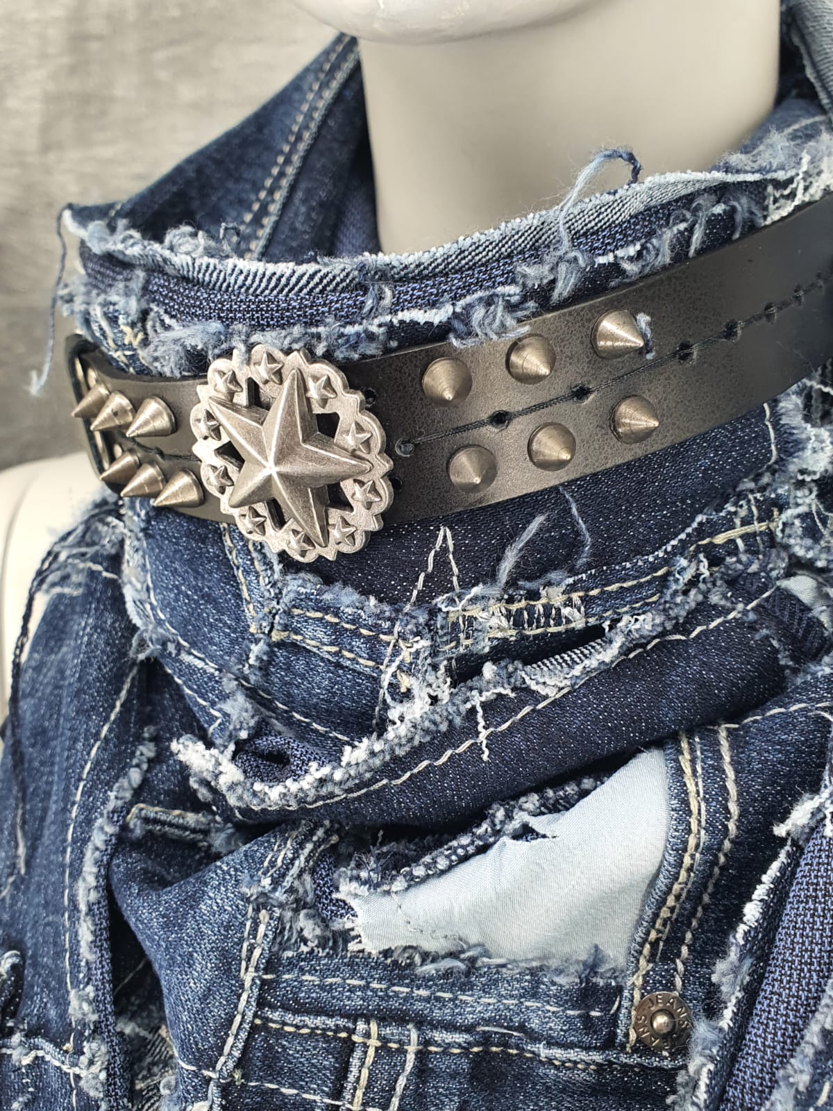 Шарф из джинсов на синей основе, декорирован кожаным браслетом , нашивками и подвесами. Хороший подарок для брутальных мужчин!