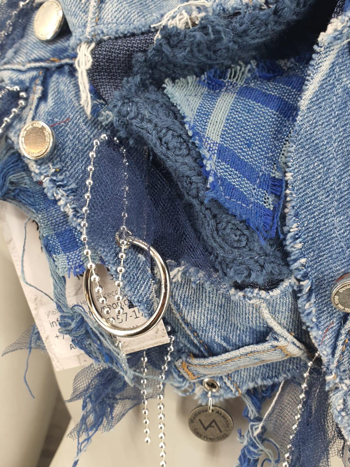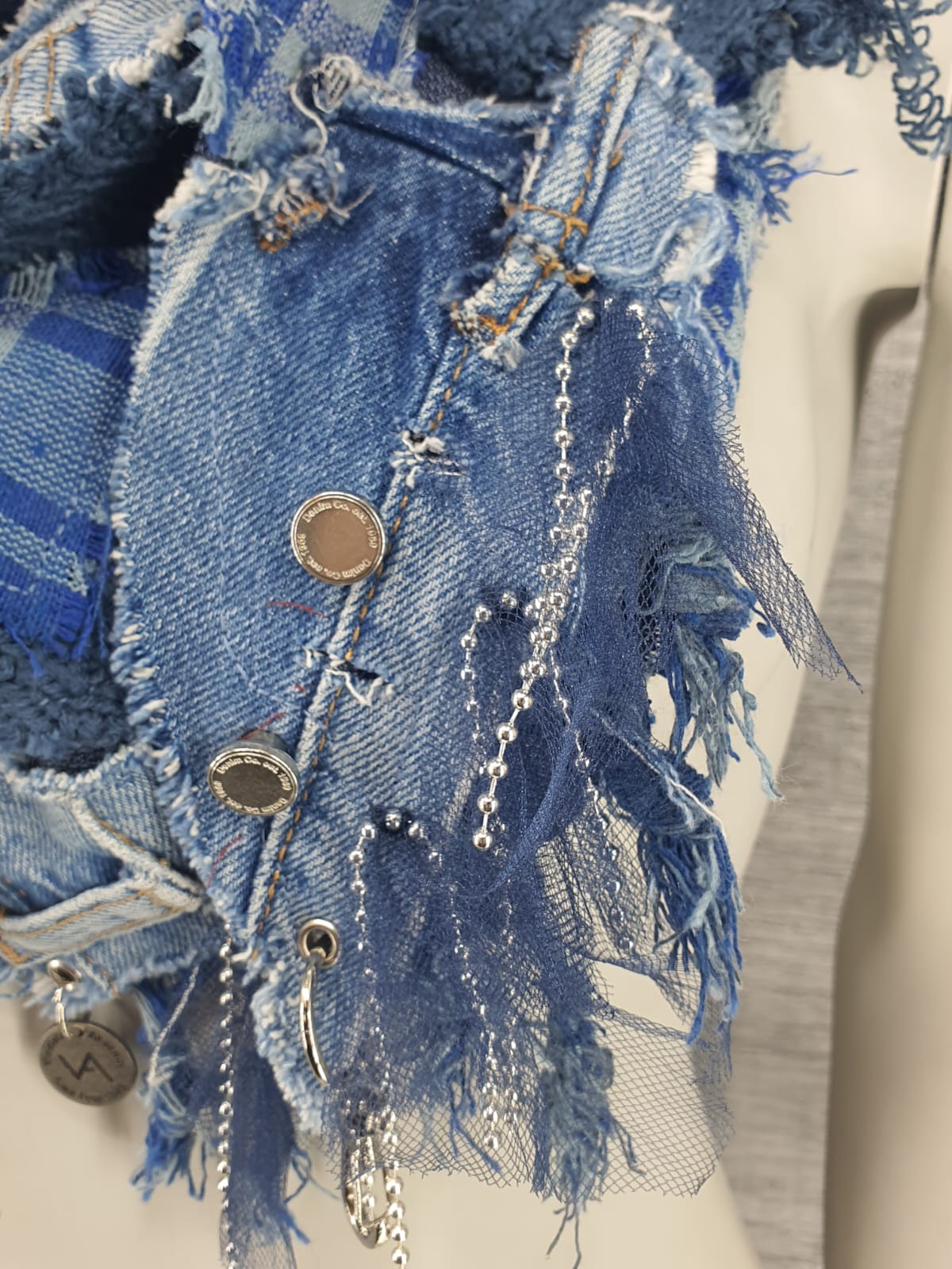 Шарф из свитера, арафатки и джинсов на синей основе, декорирован цепочками с сеткой. Вам обязательно нужен такой шарф! Он придаст вашему образу непосредственности и новизны.