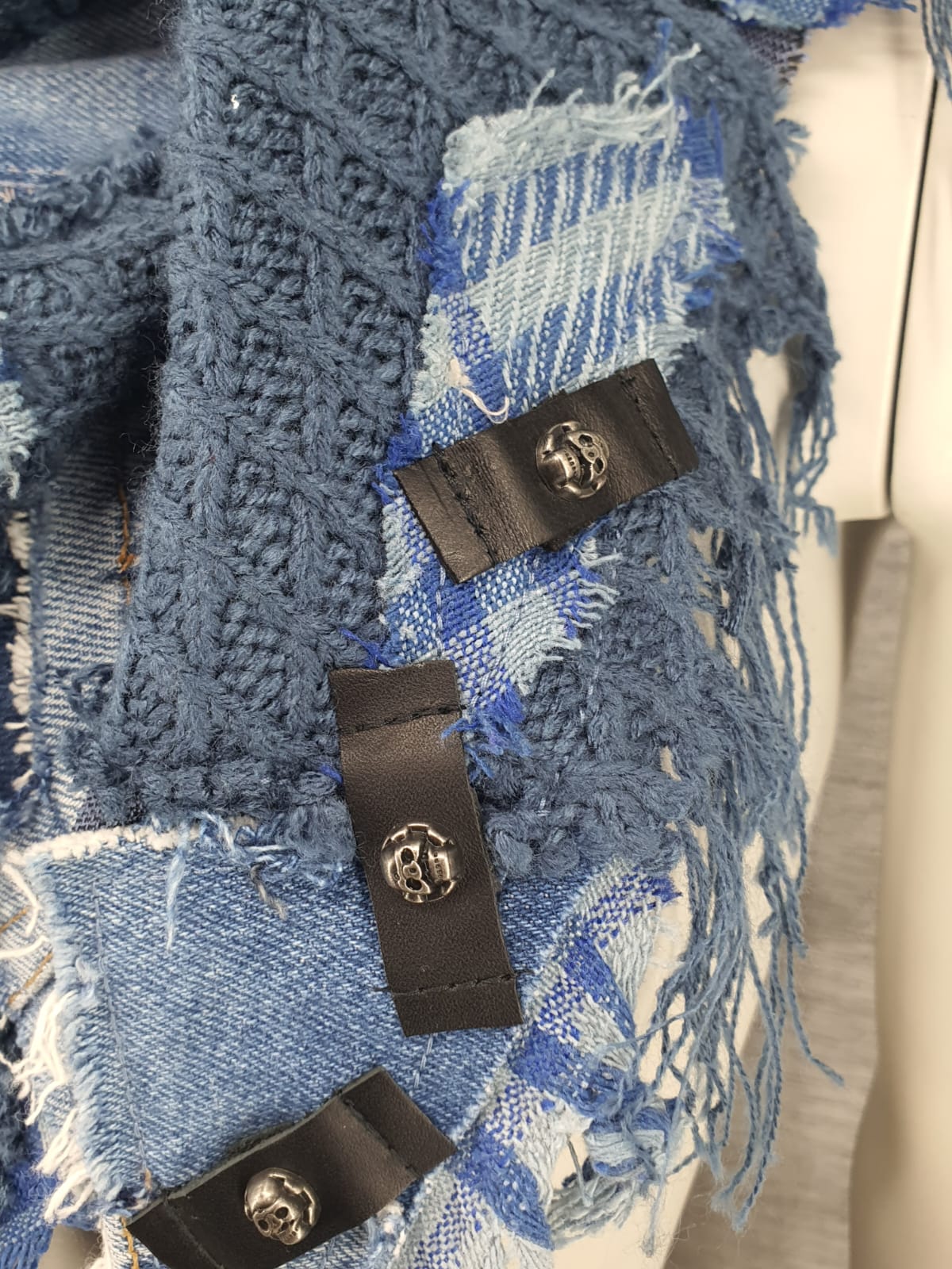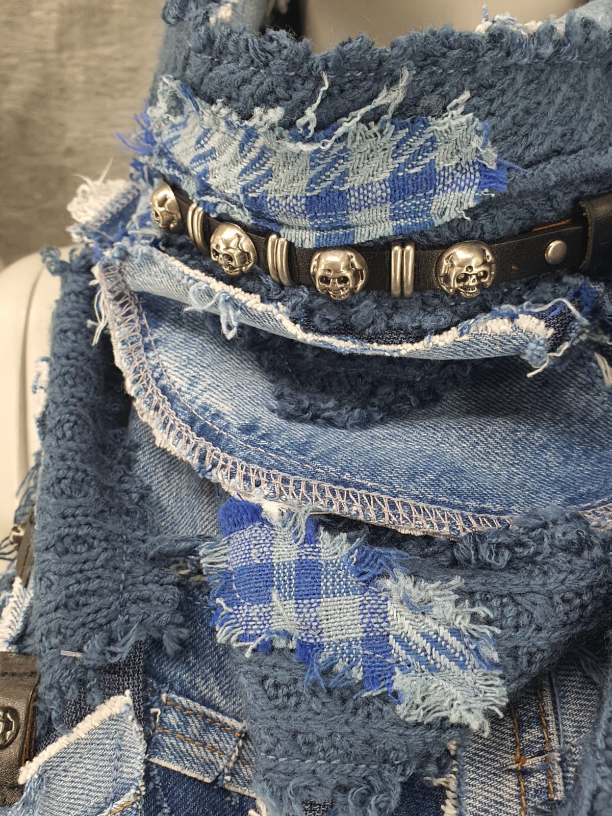 Шарф из свитера, арафатки и джинсов на синей основе. Декорирован кожаным чёрным браслетом и нашивками и черепами. Вам обязательно нужен такой шарф! Он придаст вашему образу харакрера и новизны.