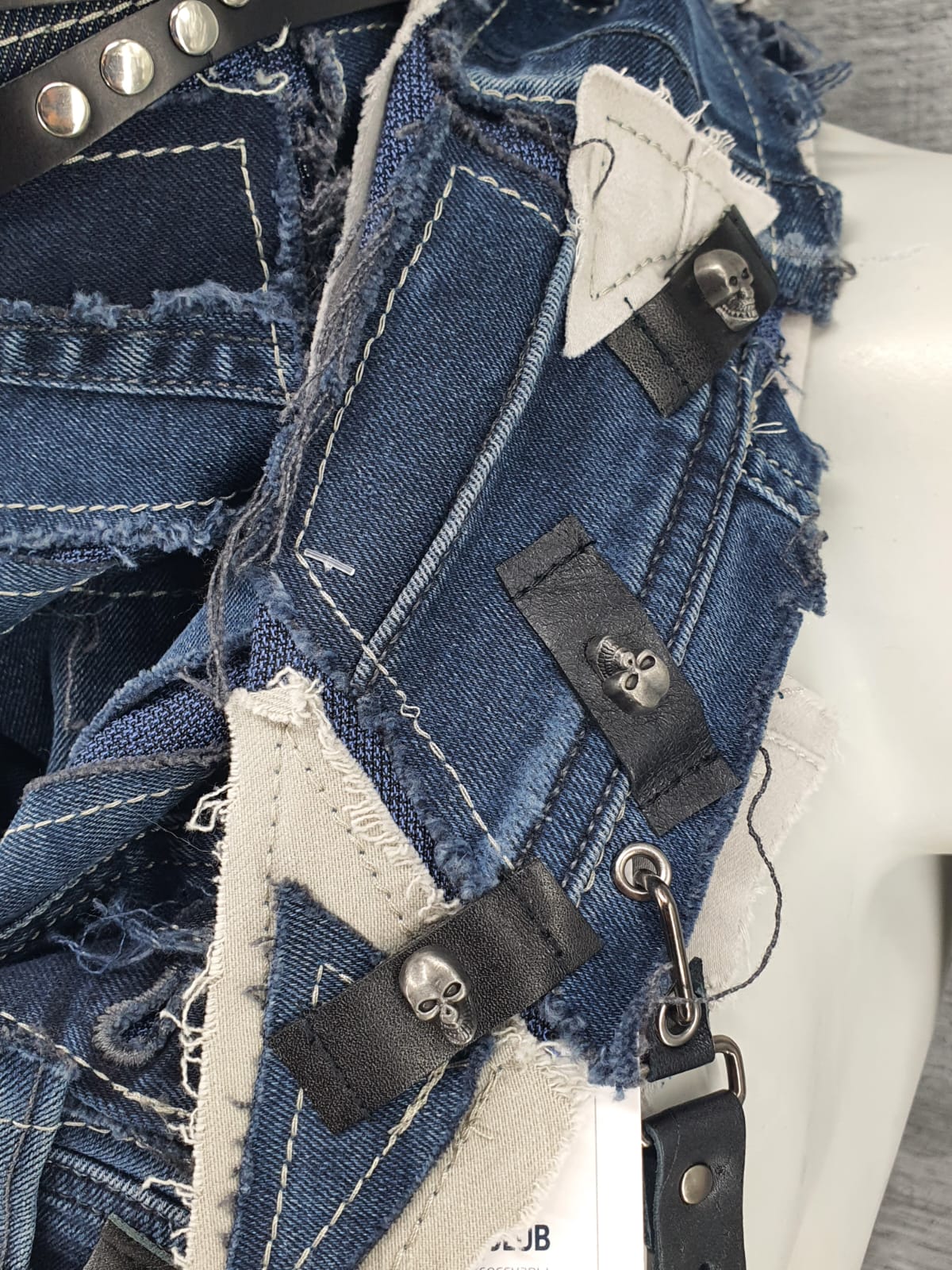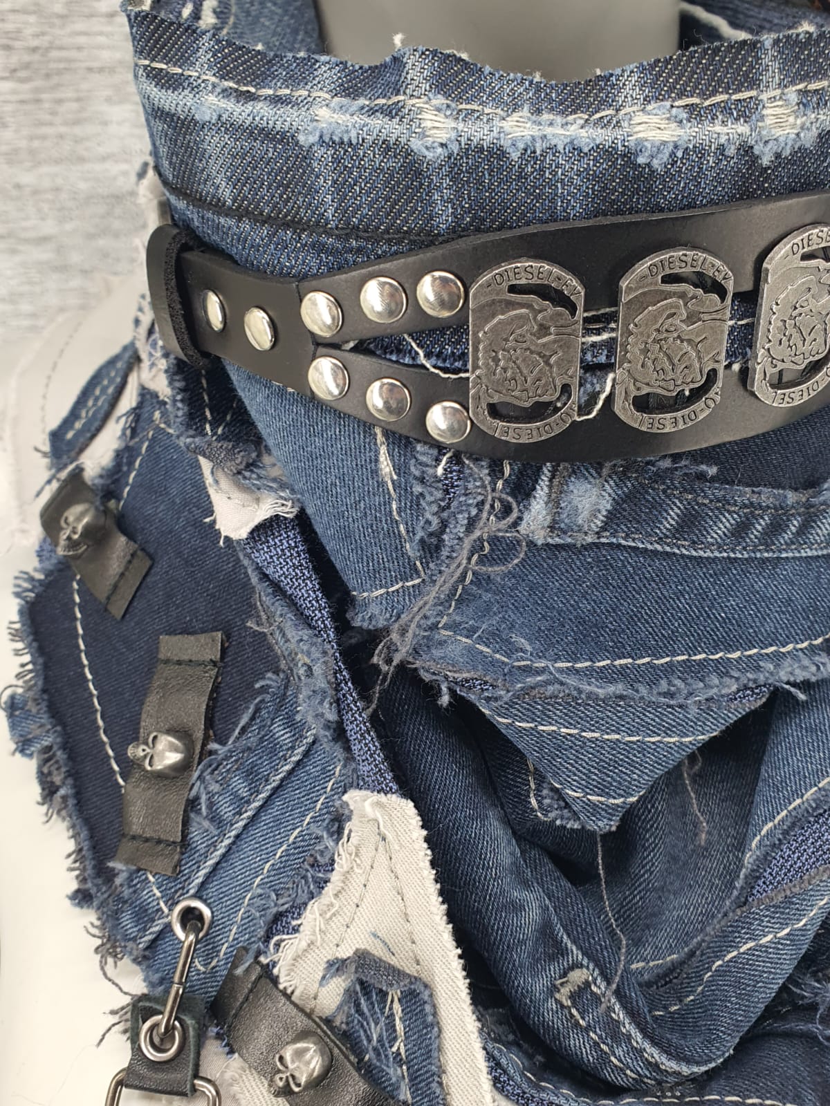 Шарф из синих и светлых джинсов на мягкой льняной основе, декорирован кожаным браслетом, нвшивками и подвесами. Для парней с характером и смелых девчат.