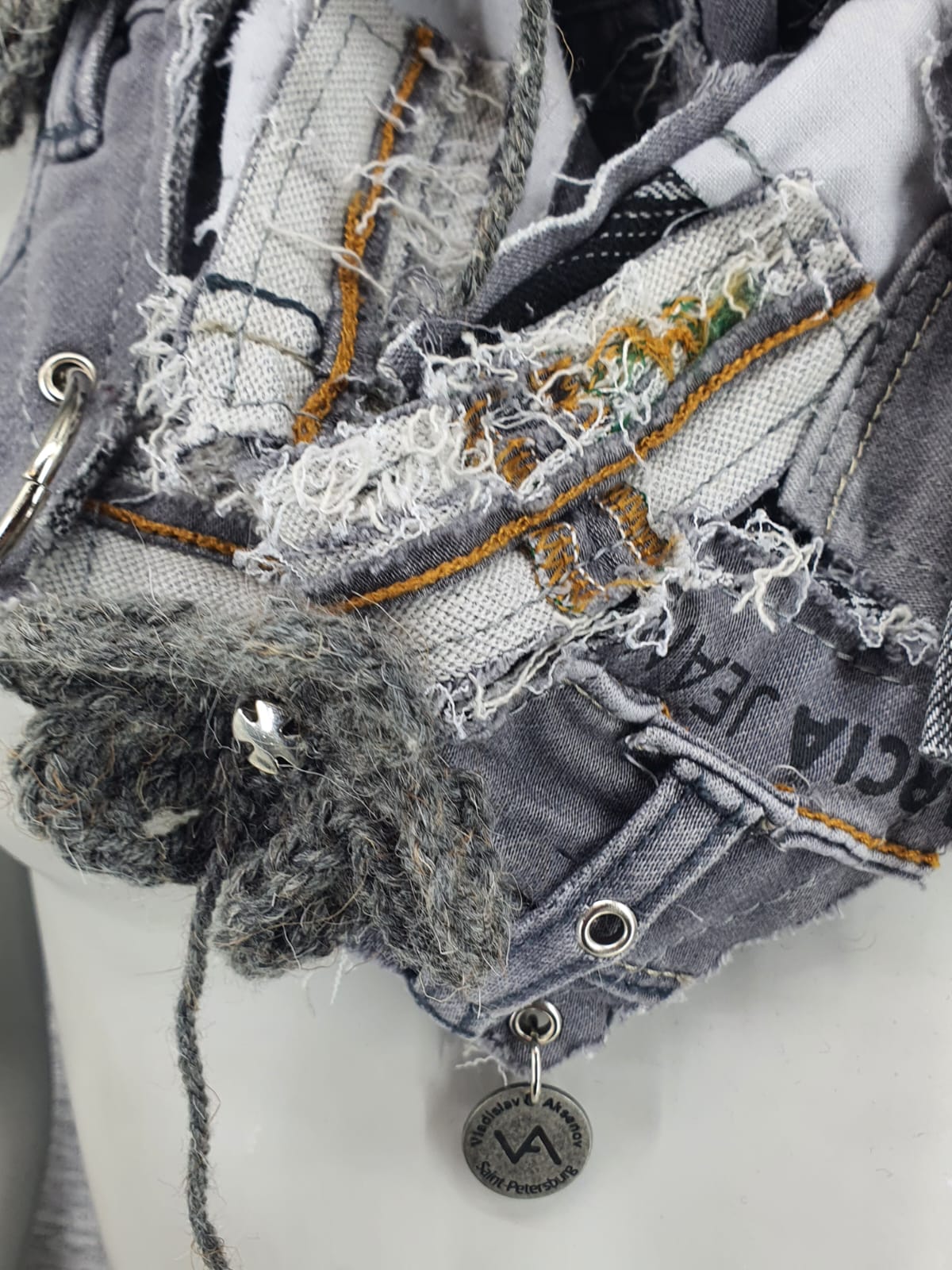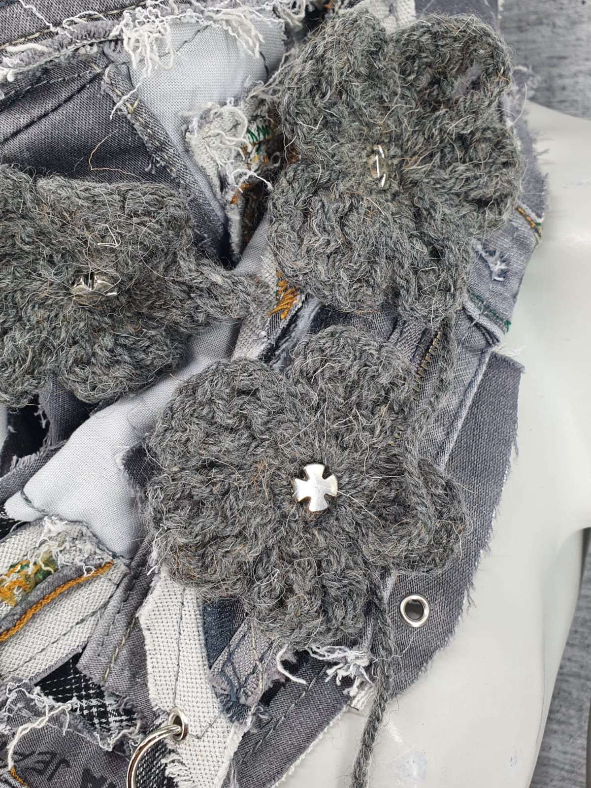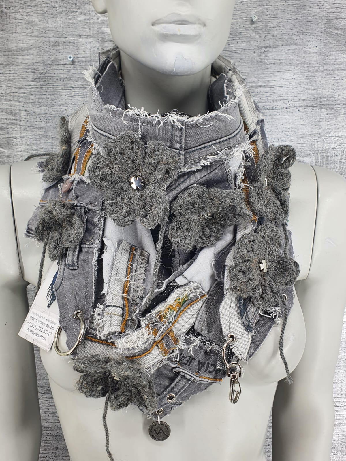 Шарф из серых джинсов на основе в клетку, декорирован вязаными цветами.