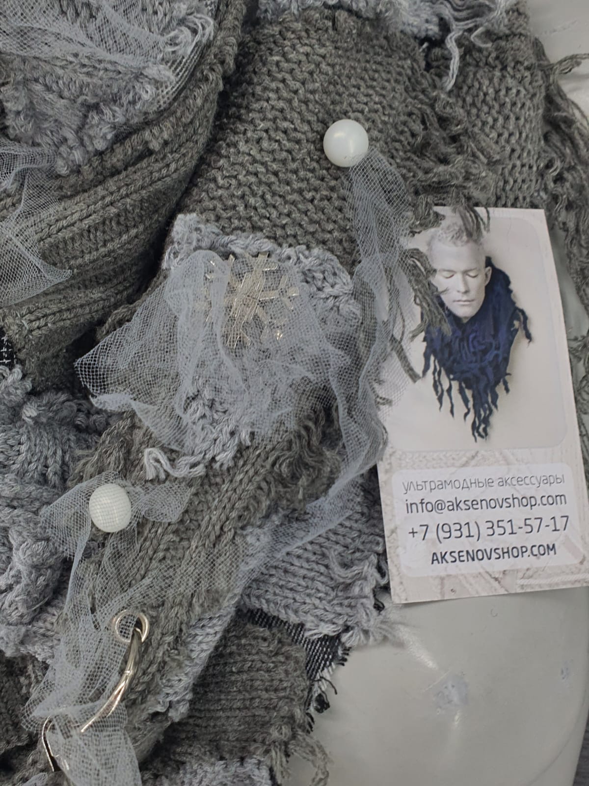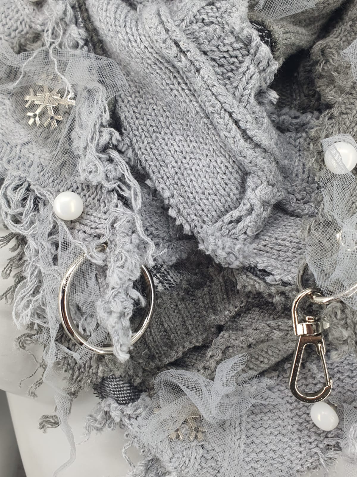 Шарф из серых джемперов разного оттенка на клетчатой основе, декорирован бусинами, снежинками и сеткой.