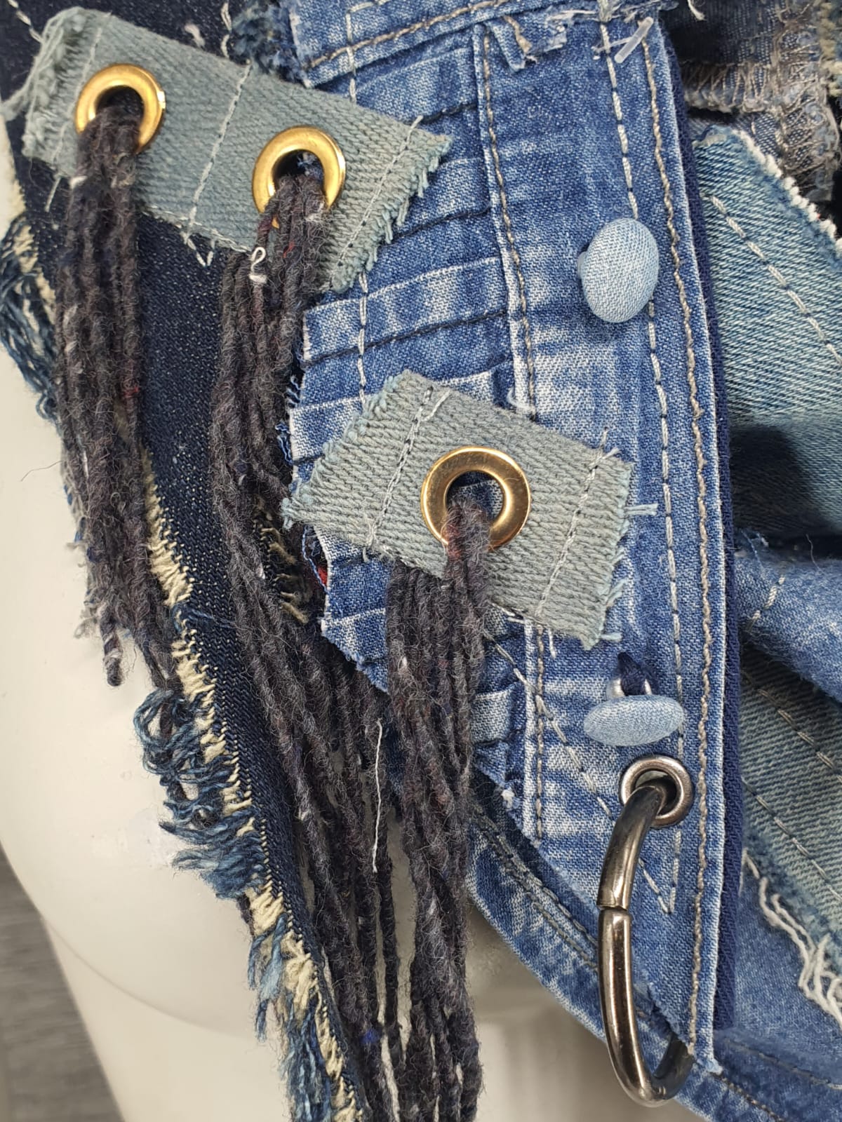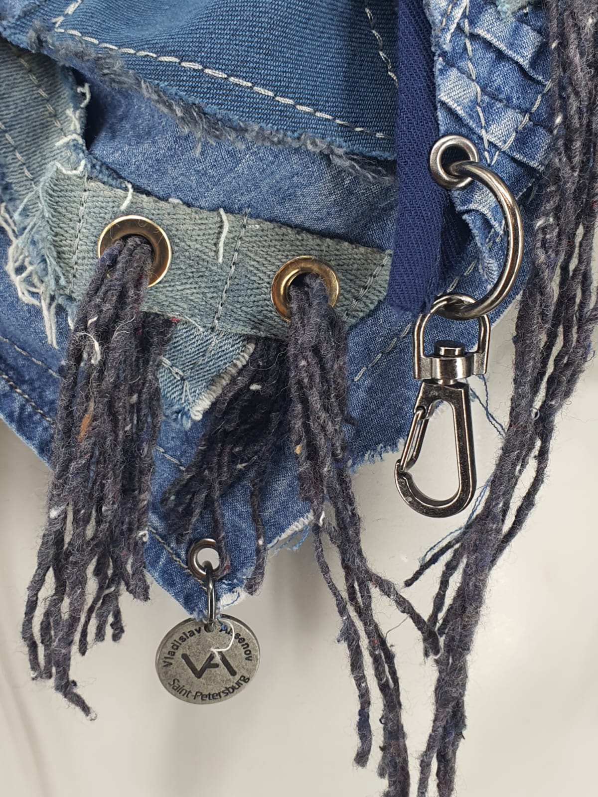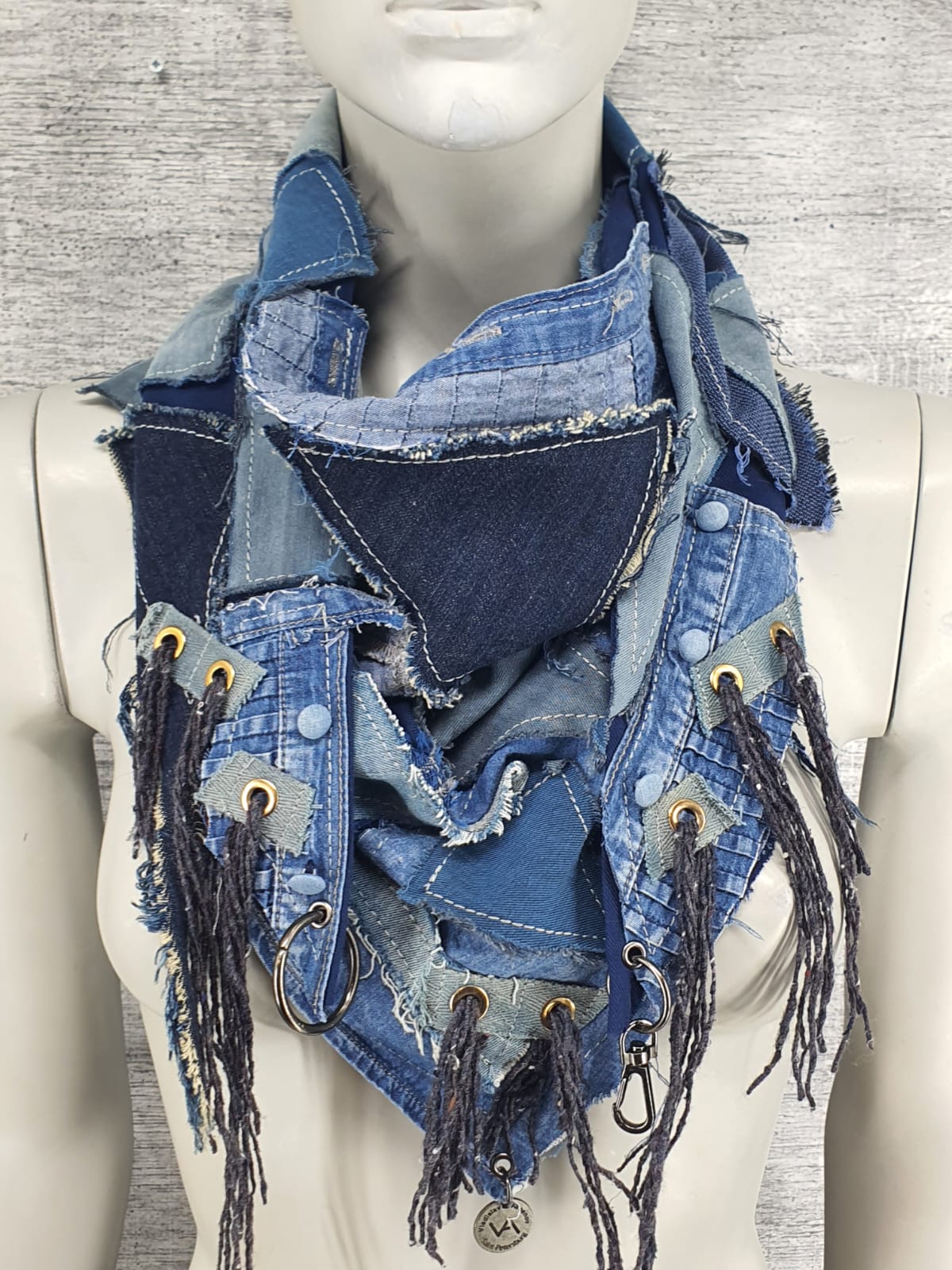 Шарф из разных джинсов и арафатки на синей основе, декорирован лентой с люверсами и пряжей. Отражение твоего характера.