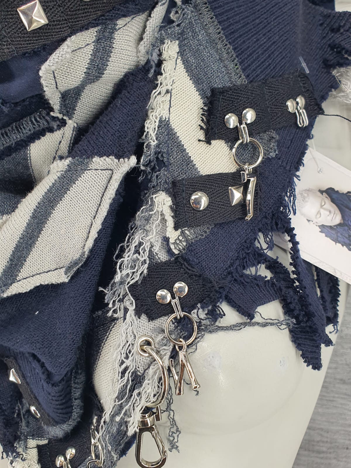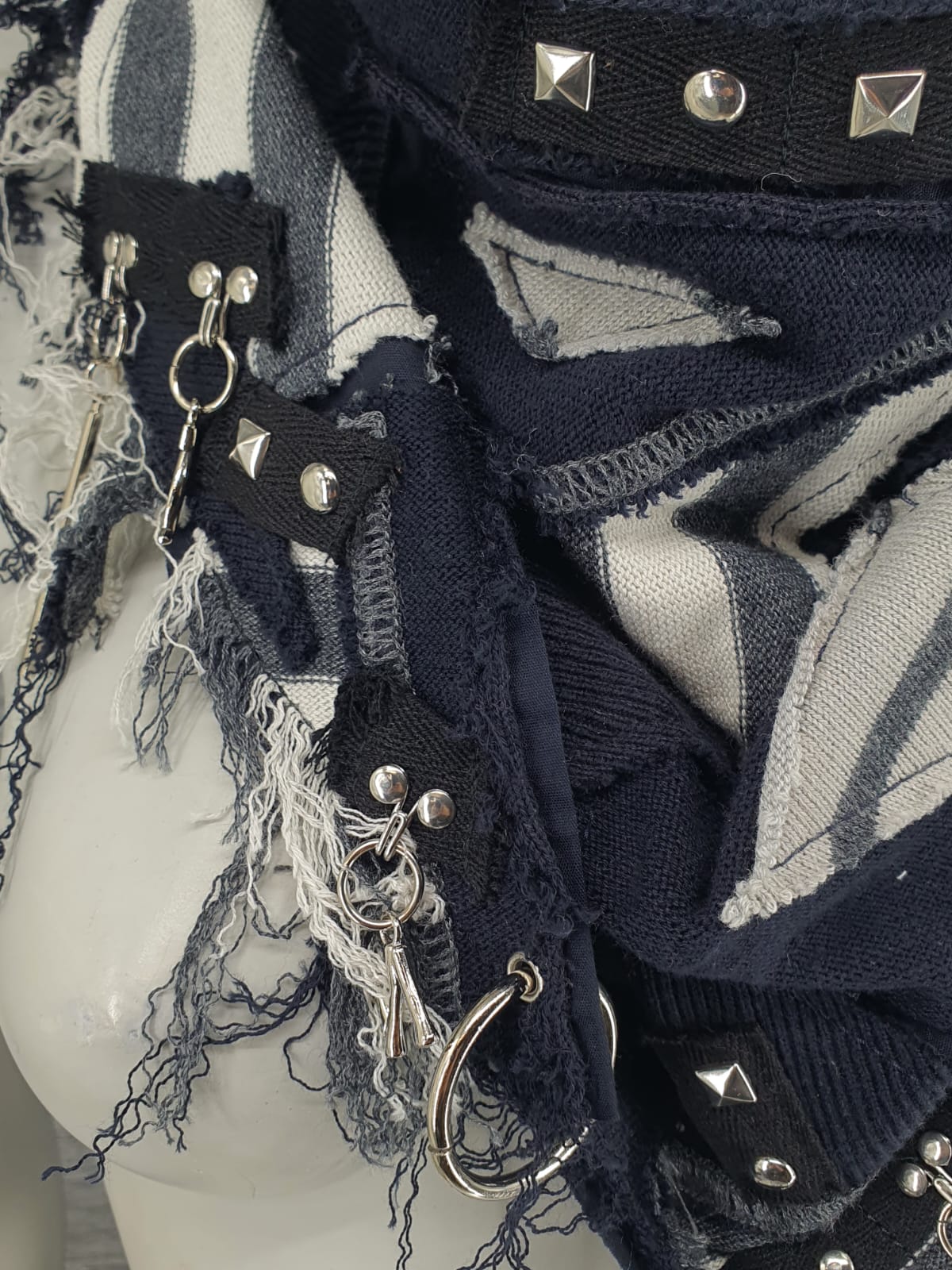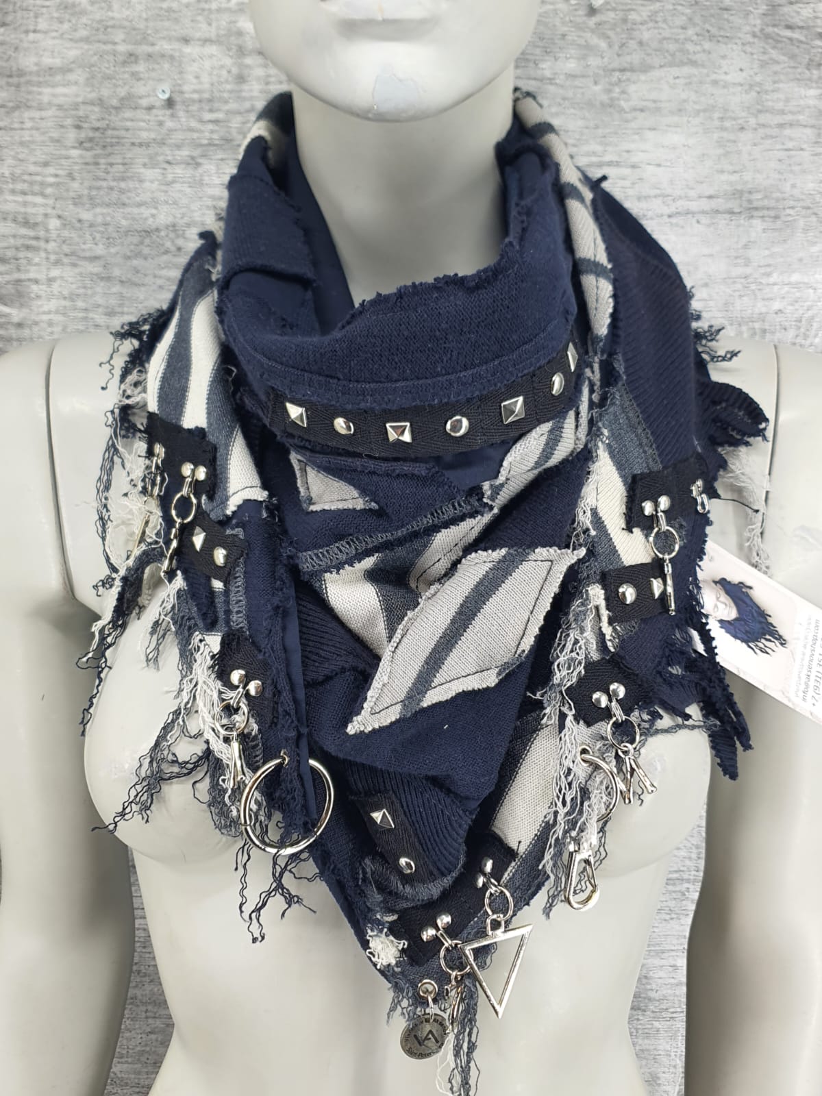 Шарф из джемпера на синей хлопковой основе, декорирован чёрной лентой с металлическими элементами и подвесами.