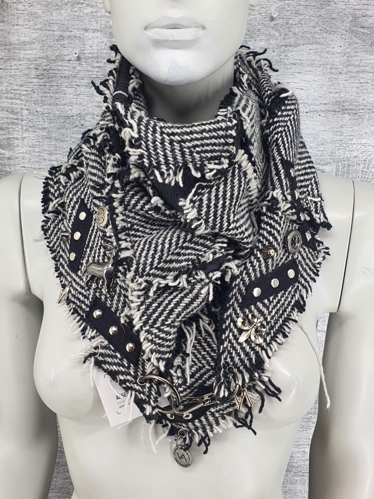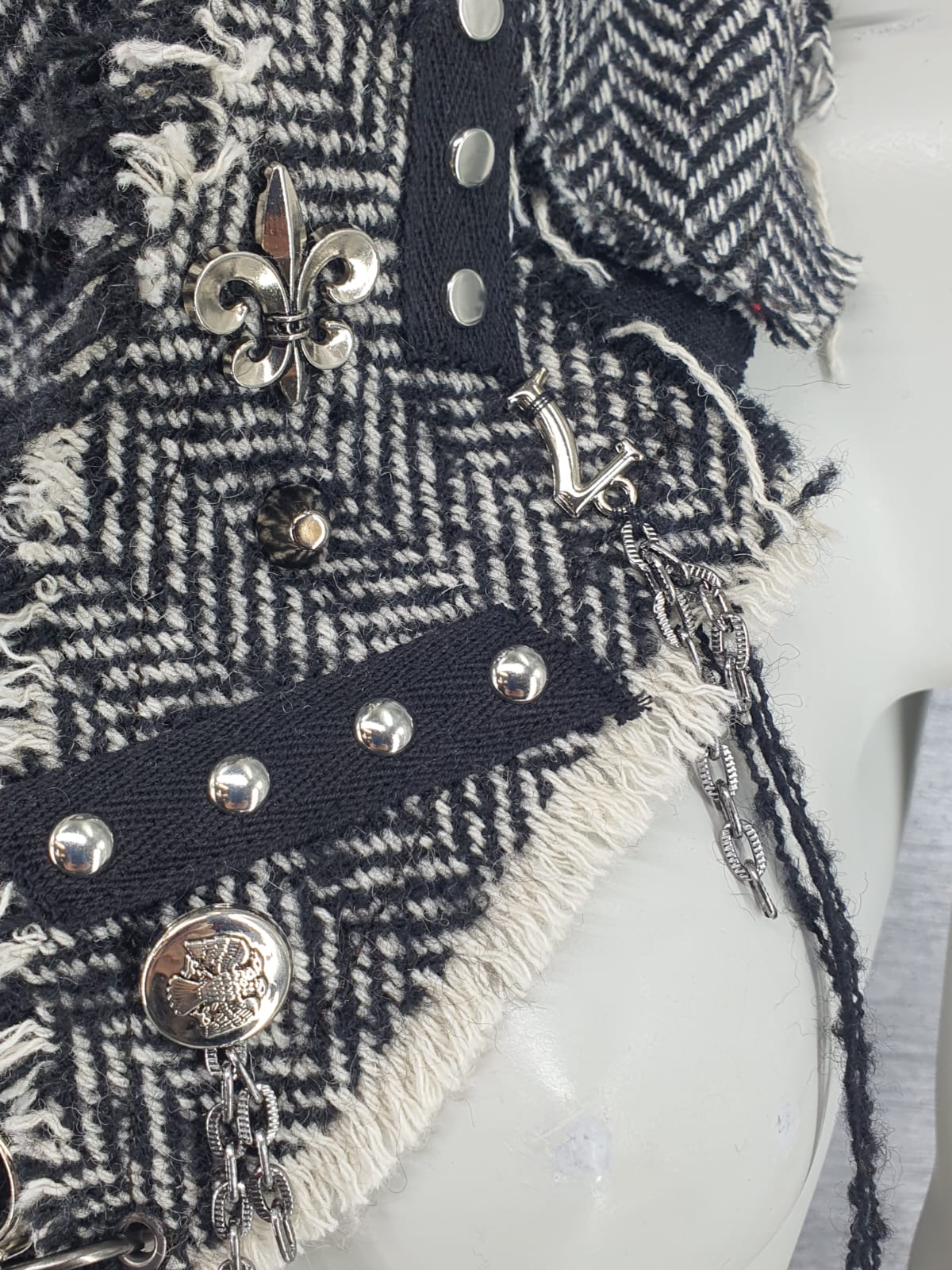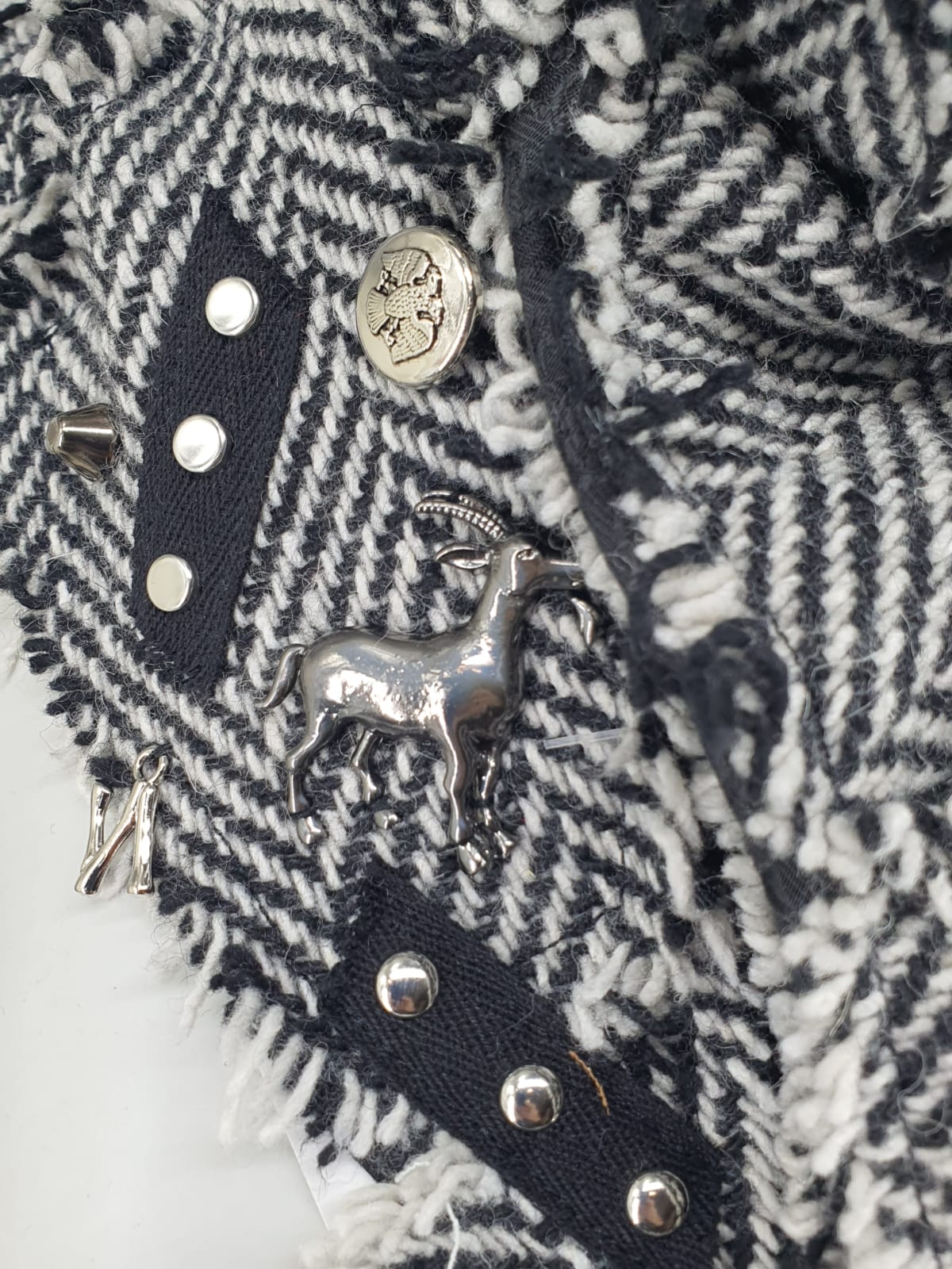 Шарф из серой шерстяной ткани в ёлочку на чёрной хлопковой основе, декорирован лентой, металлическими элементами и симпатичнной козой.