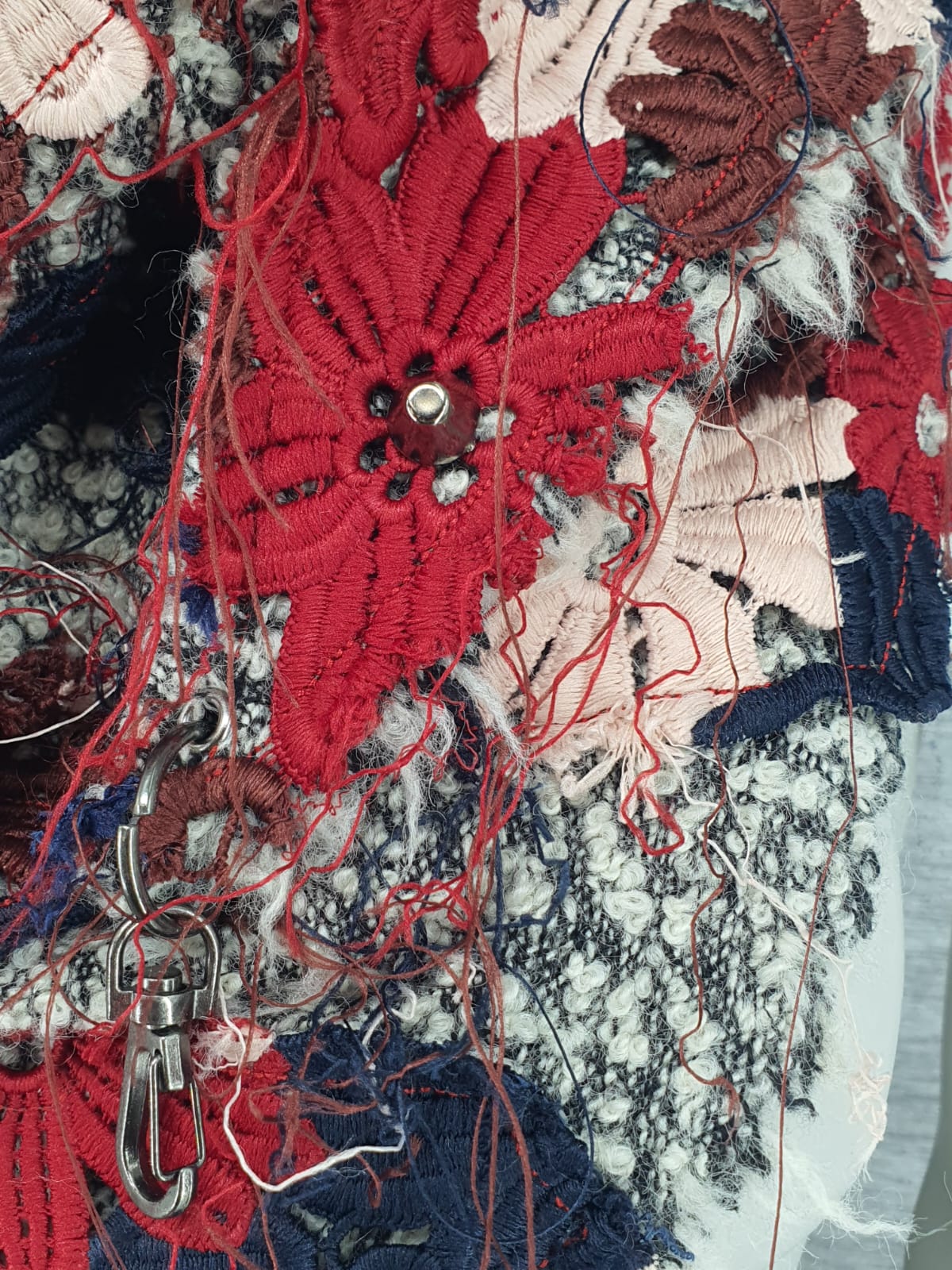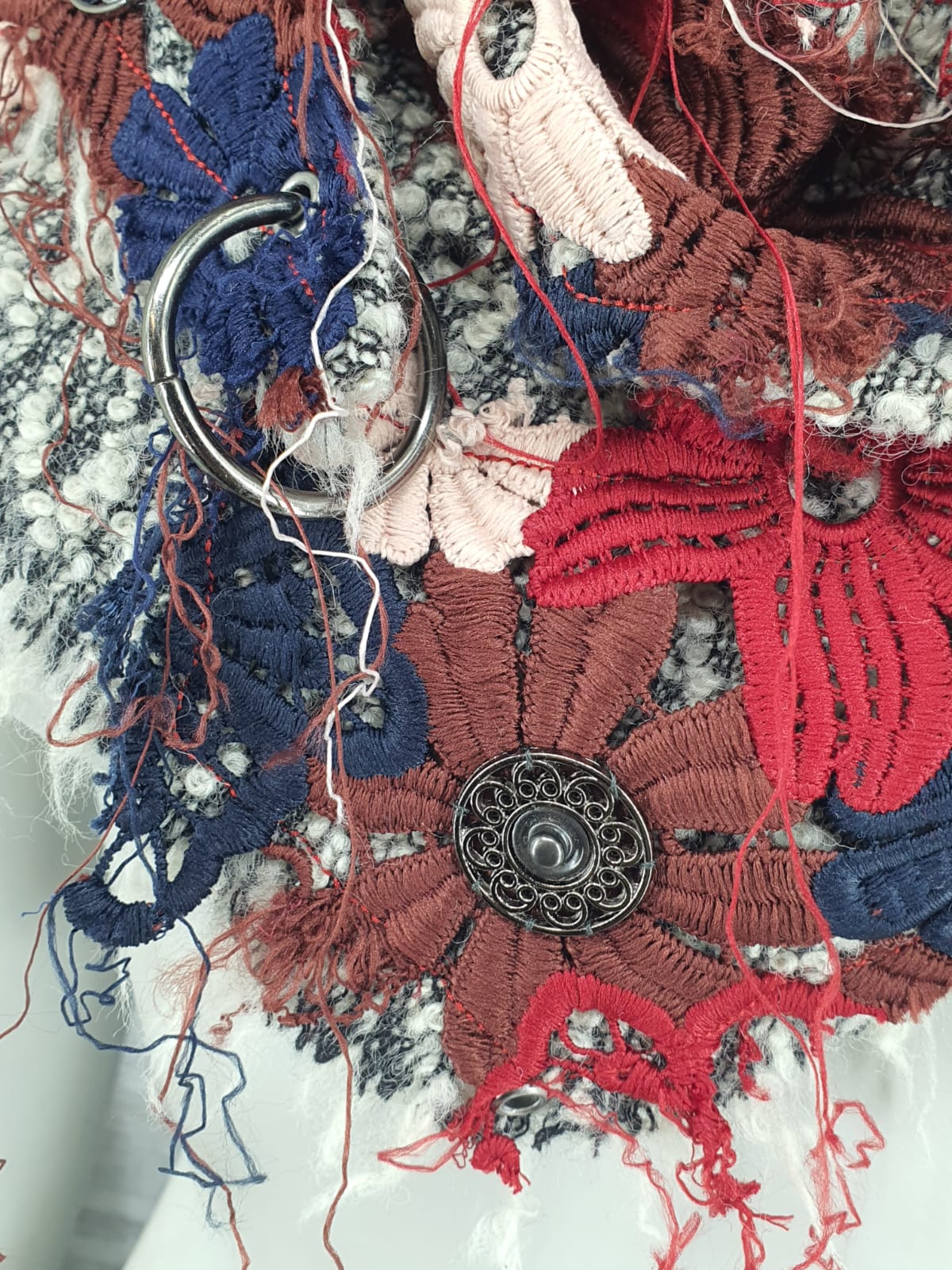 Шарф на серой шерстяной ткани, декорирован кружевом и металлическими элементами. Тепло и ярко!