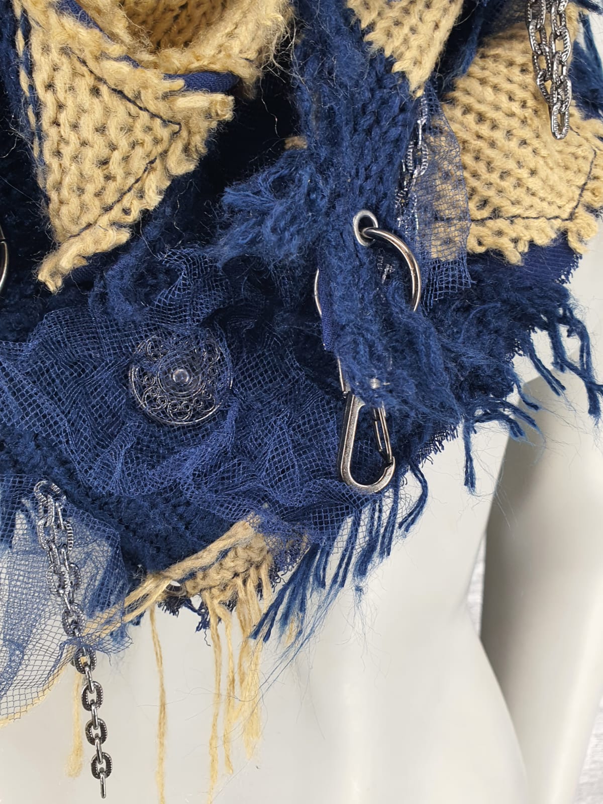 Шарф из сине-бежевого джемпера на синей хлопковой основе, декорирован цепочками, кнопками и сеткой. Практично и романтично!