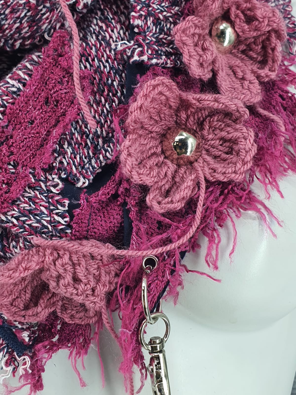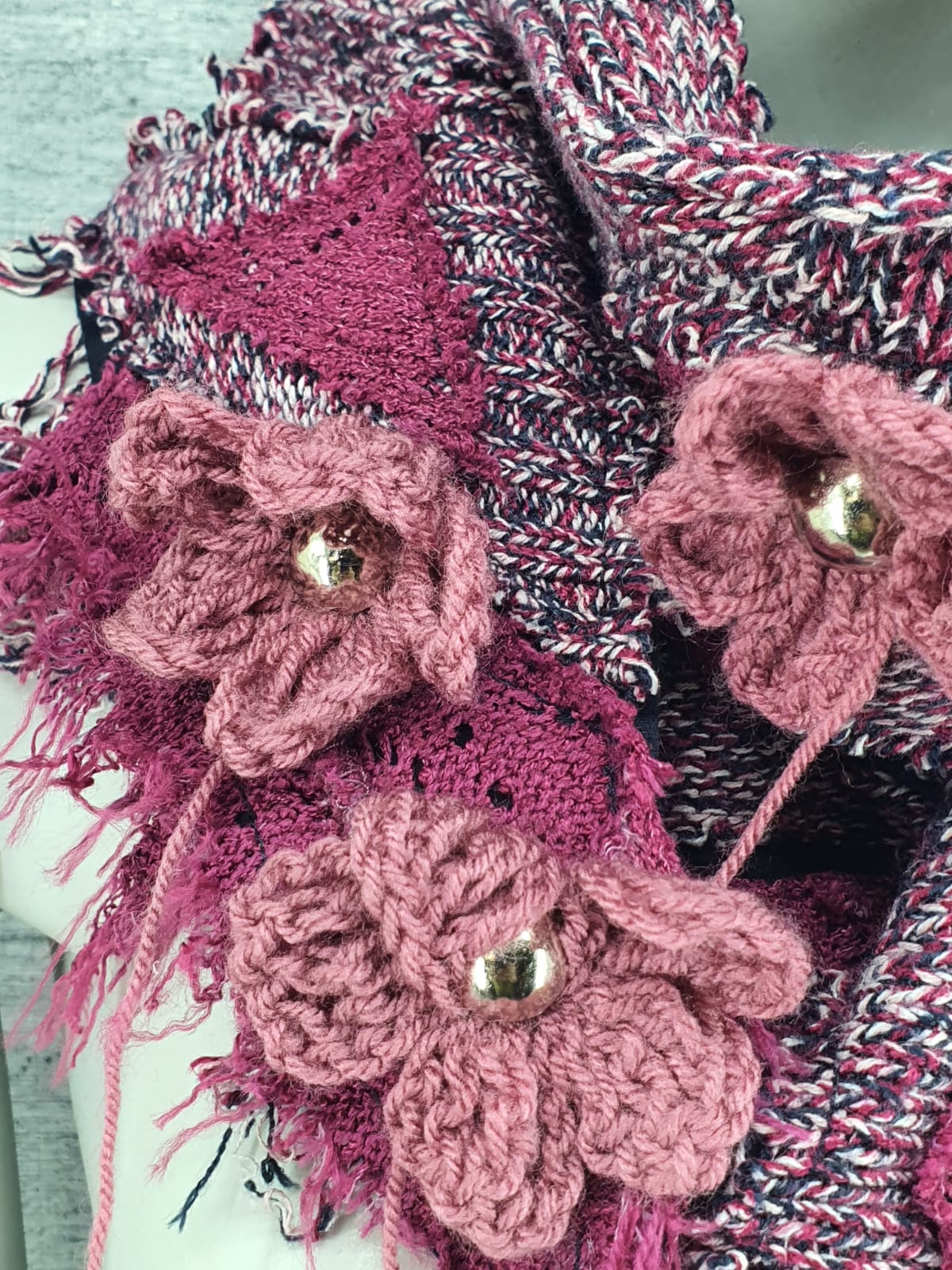Шарф из джемперов на хлопковой основе, декорирован вязаными цветами и металличкскими пуговицами.