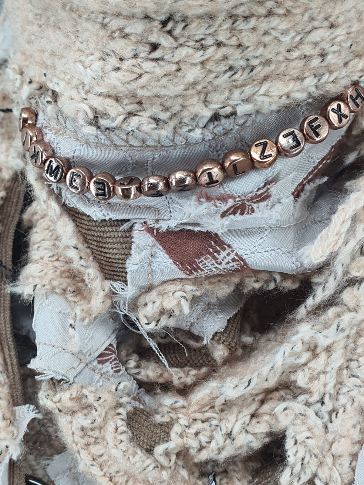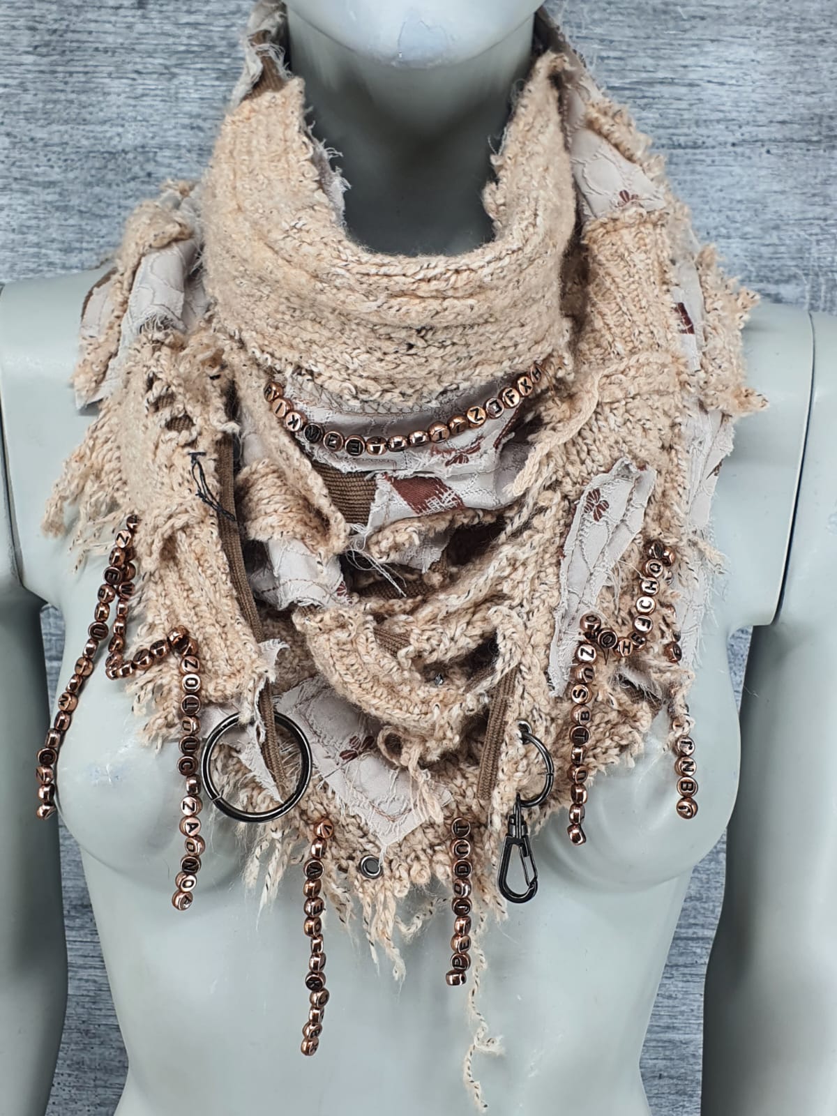 Шарф из бежевого свитера и платья на основе из микро вельвета, декорирован цепочкой из бусин с буквами. Немного нежности и загадки в свой образ.