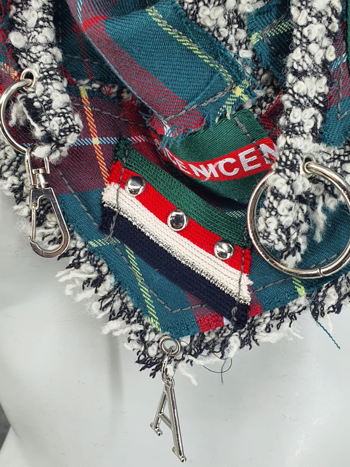 Шарф из ткани в клетку на тёплой шерстяной основе, декорирован различной лентой.