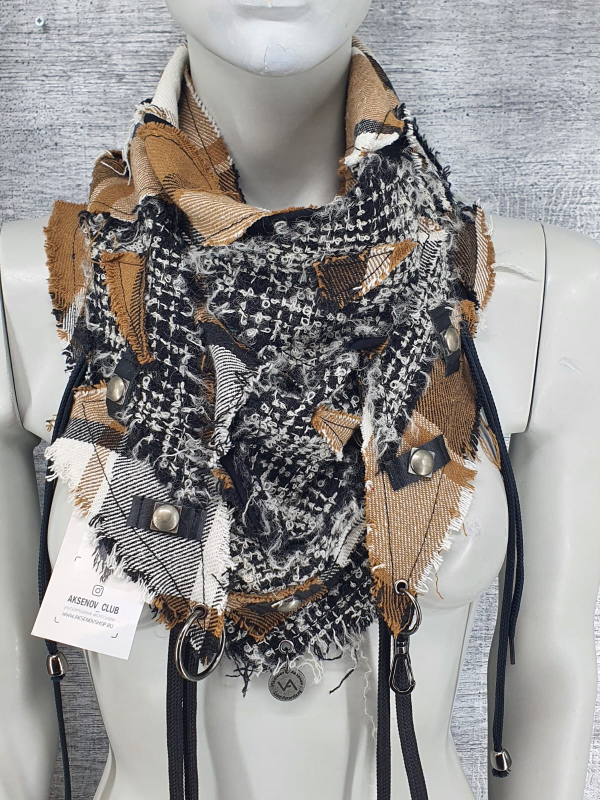 Шарф из ткани в клетку и букле на чёрной хлопковой основе, декорирован кожаными нашивками и шнурами. Прекрасный подарок для любителей путешевствовать!