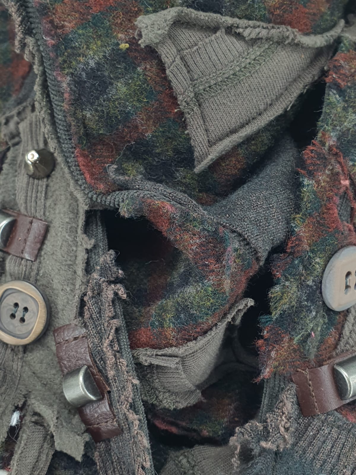 Шарф из вещей в коричнево-зелёных оттенках на основе из микровельвета, декорирован пуговицами и нашивками.