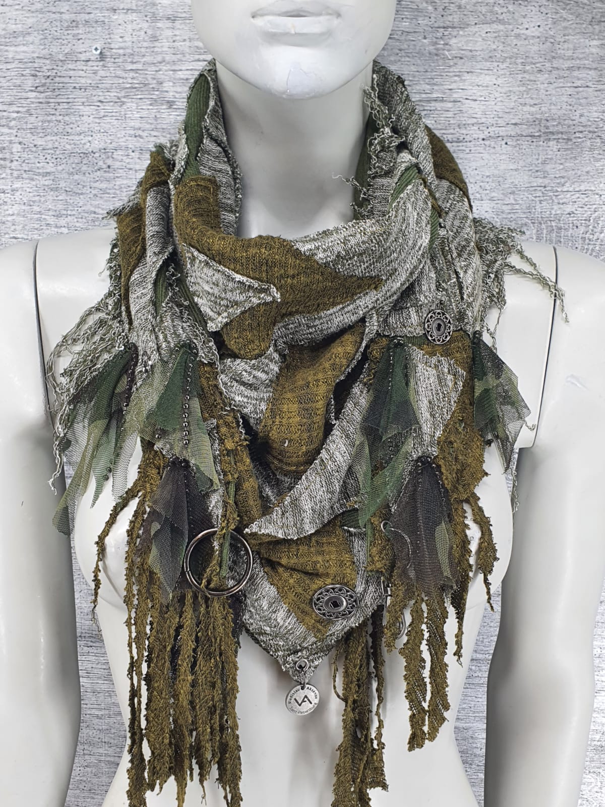 Шарф из джемперов в зелёных оттенках на основе из зелёного микровельвета, декорирован кнопками и цепочками в сетке.