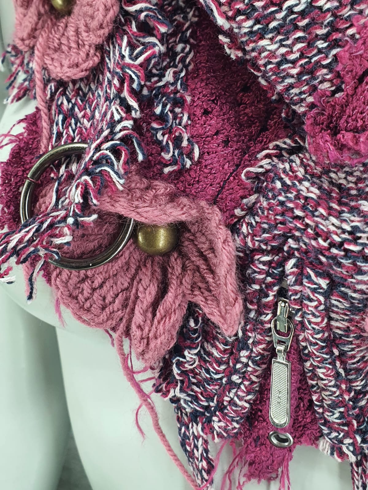 Шарф из джемперов на хлопковой синей основе, декорирован вязаными цветами и металличкскими пуговицами.