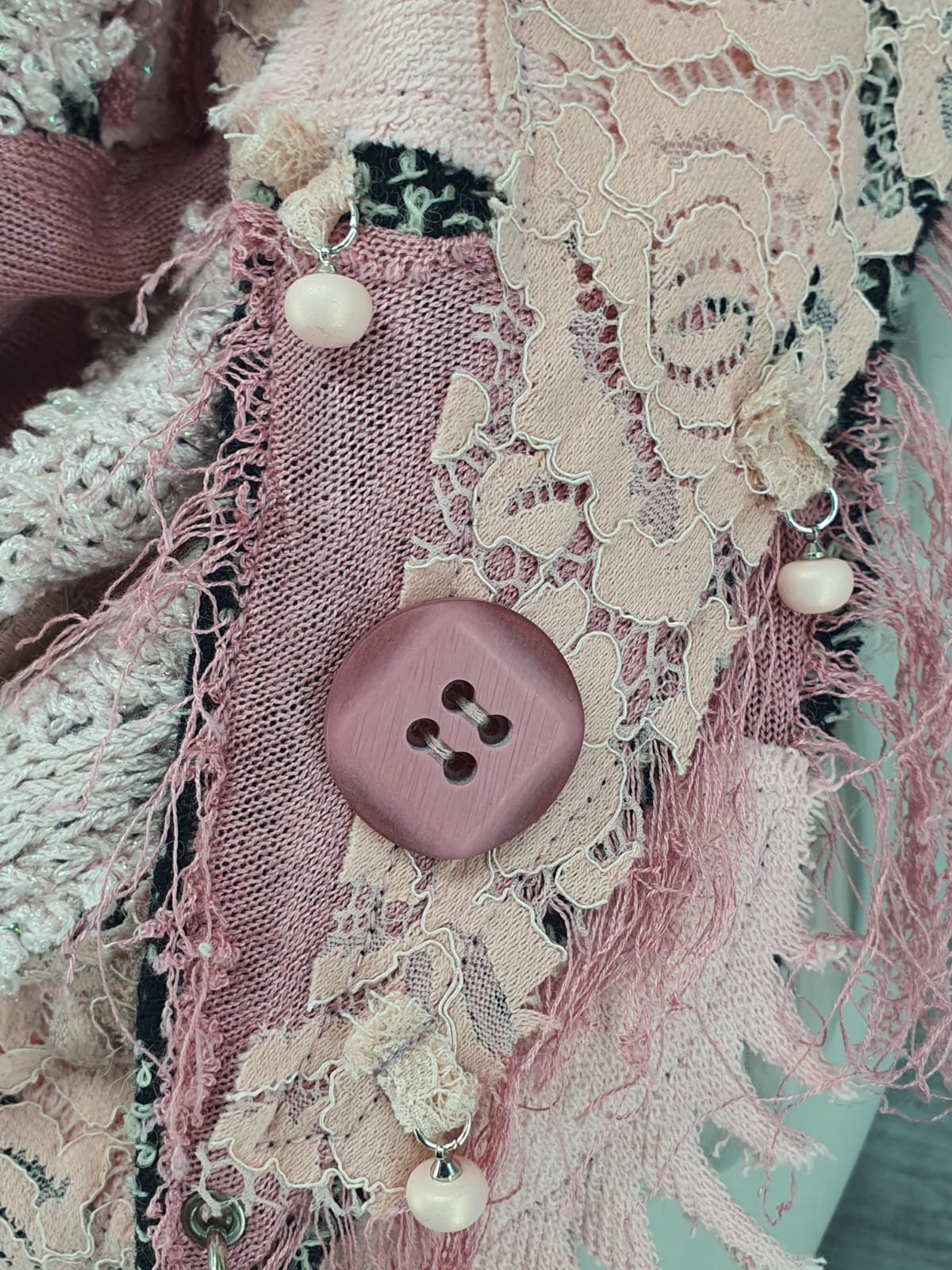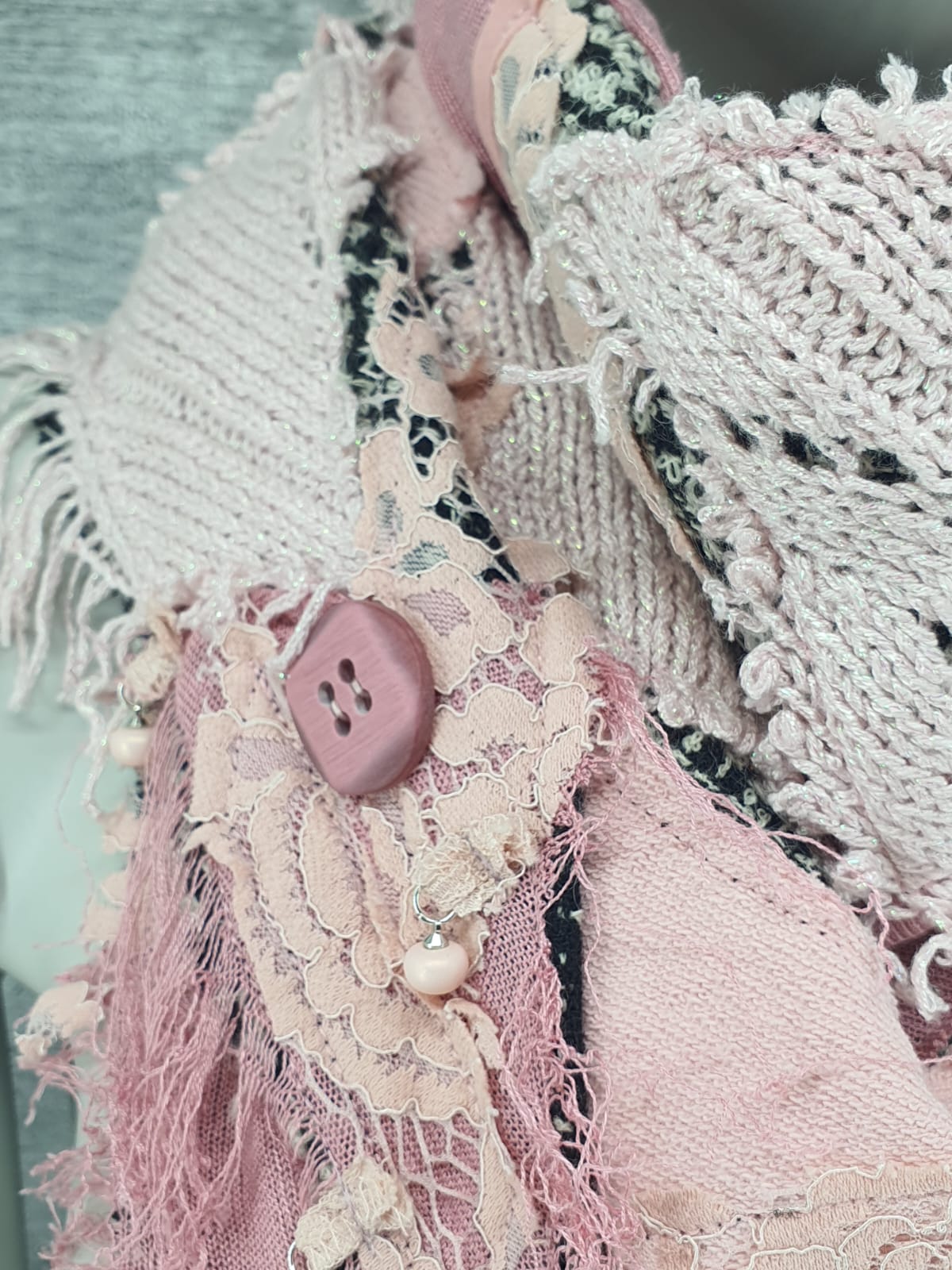 Шарф из розовых джемперов и кружева на основе из буклированной ткани, декорирован пуговицами и подвесами из бусин.