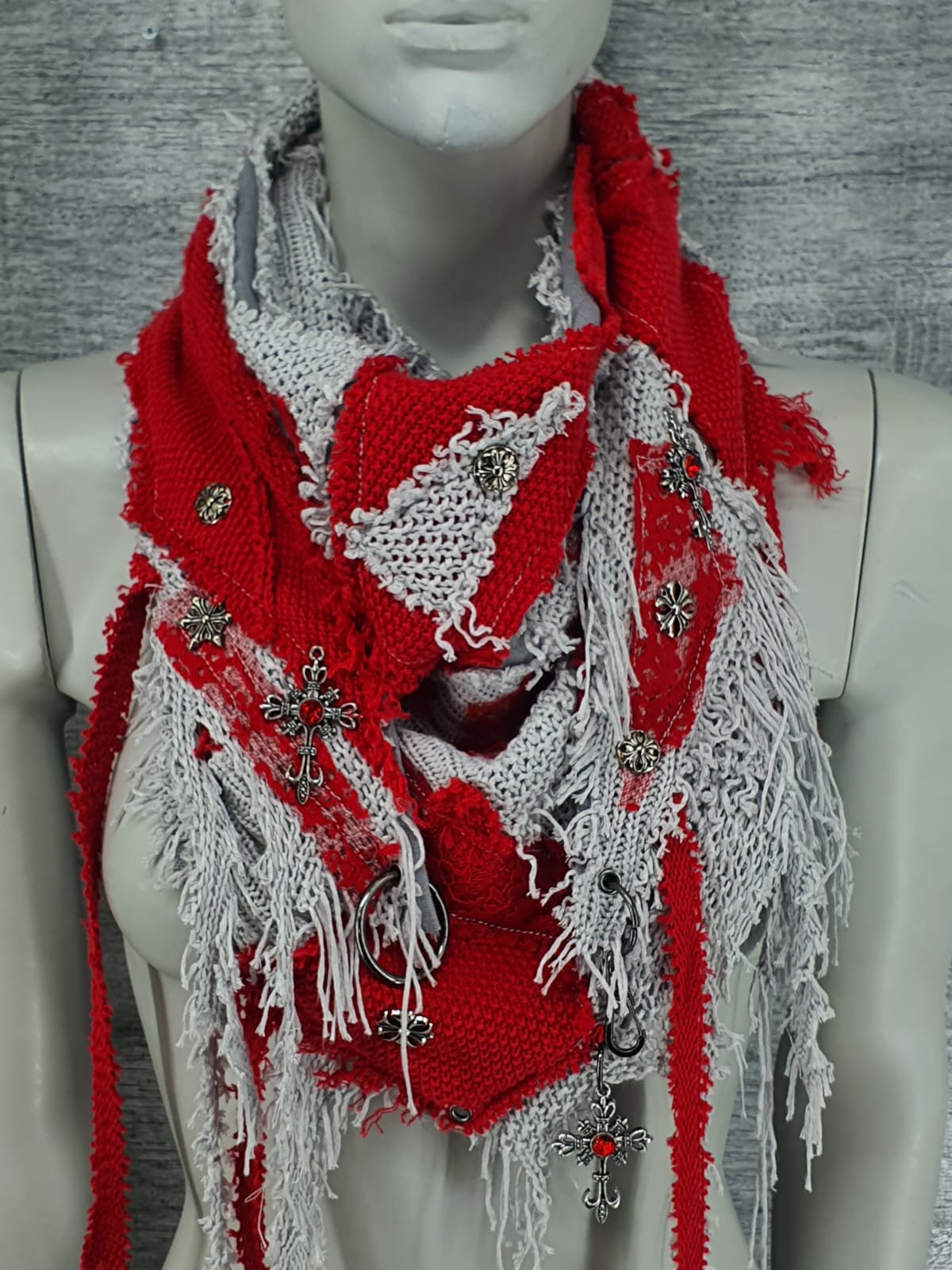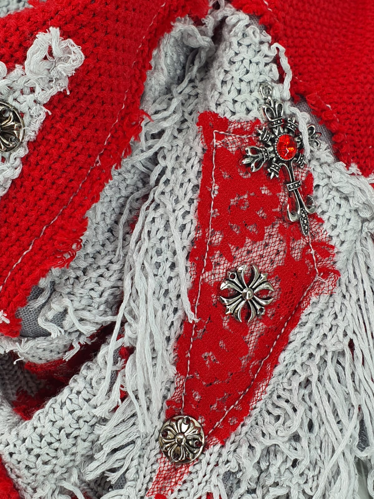 Шарф из джемперов и кружева на серой хлопковой основе, декорирован металлическими элементами и крестами.