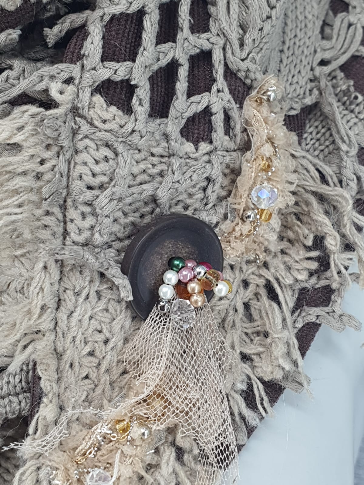 Шарф из ажургого джемпера на коричневой вельветовой основе, декорирован пуговицами и лентой с бисером и сеткой. Добавь изюминку в свой образ!