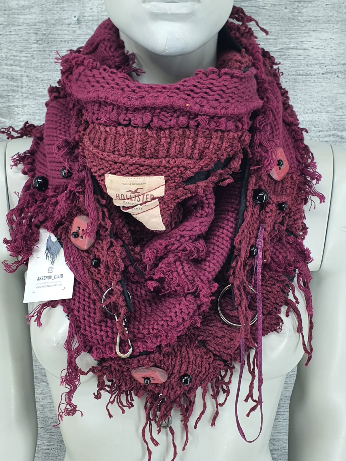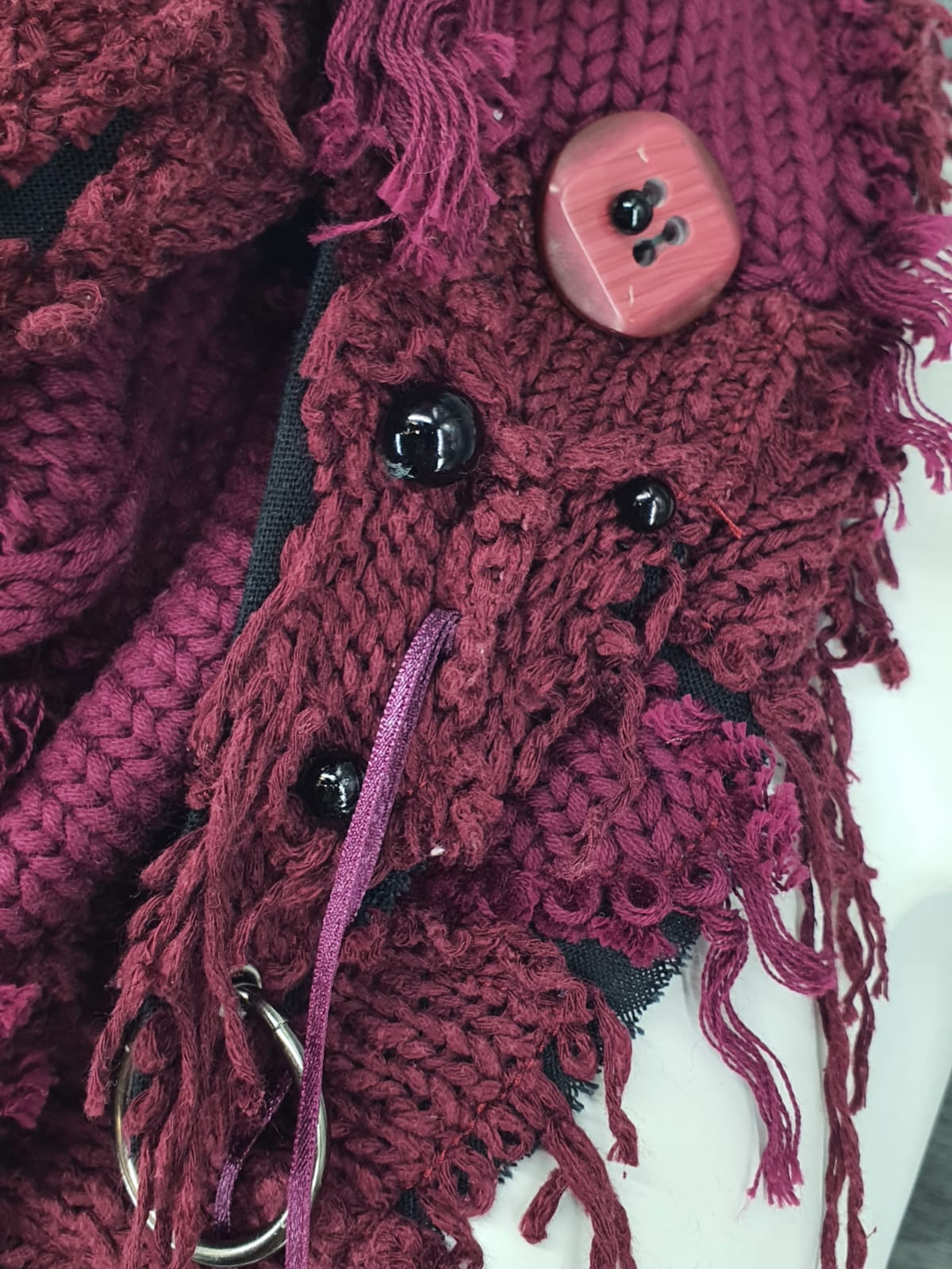 Шарф из свитера цвета марсала на чёрной хлопковой основе, декорирован пуговицами и бусинами. Цвет выдержанного вина и состоявшихся личностей.