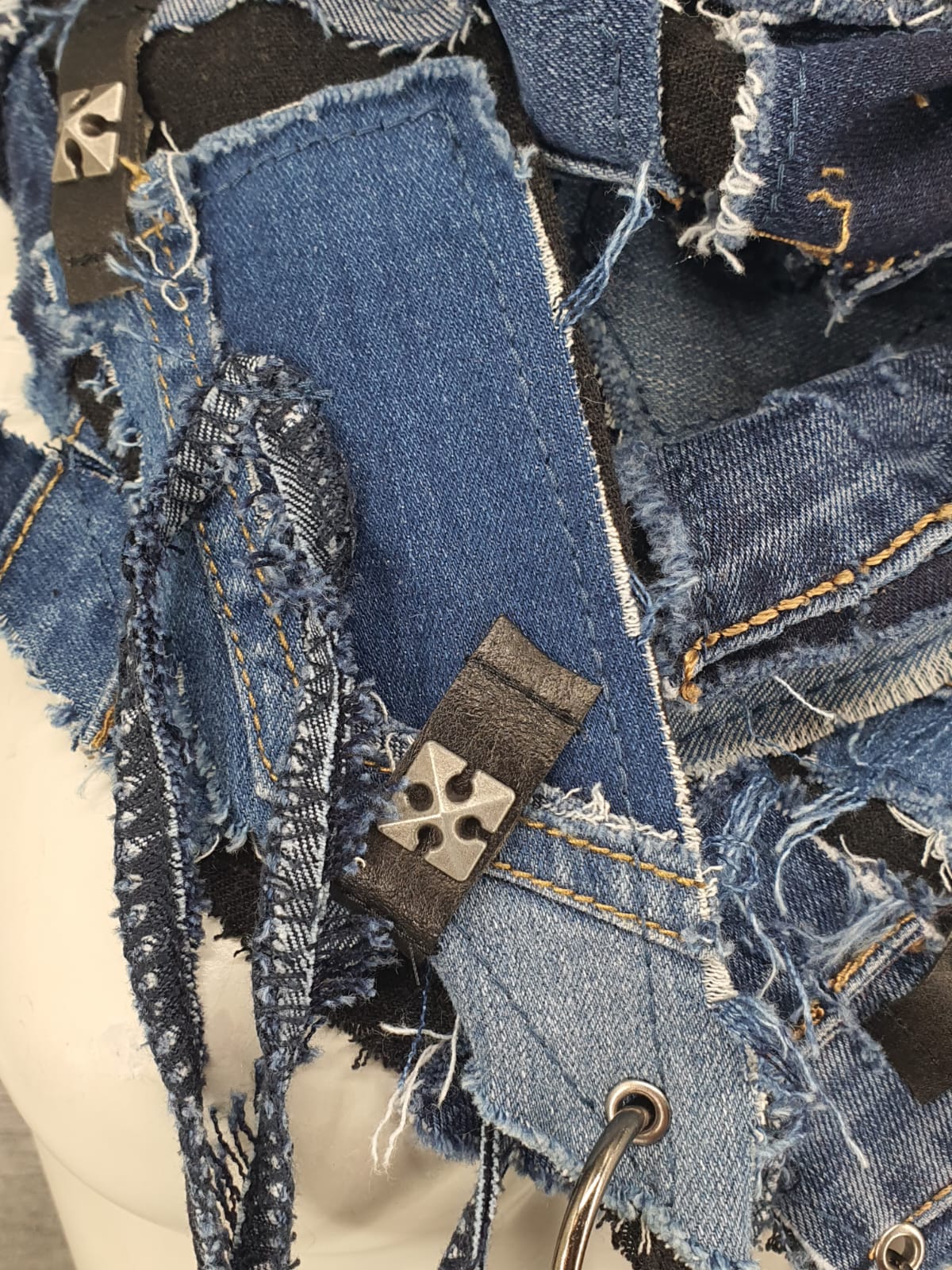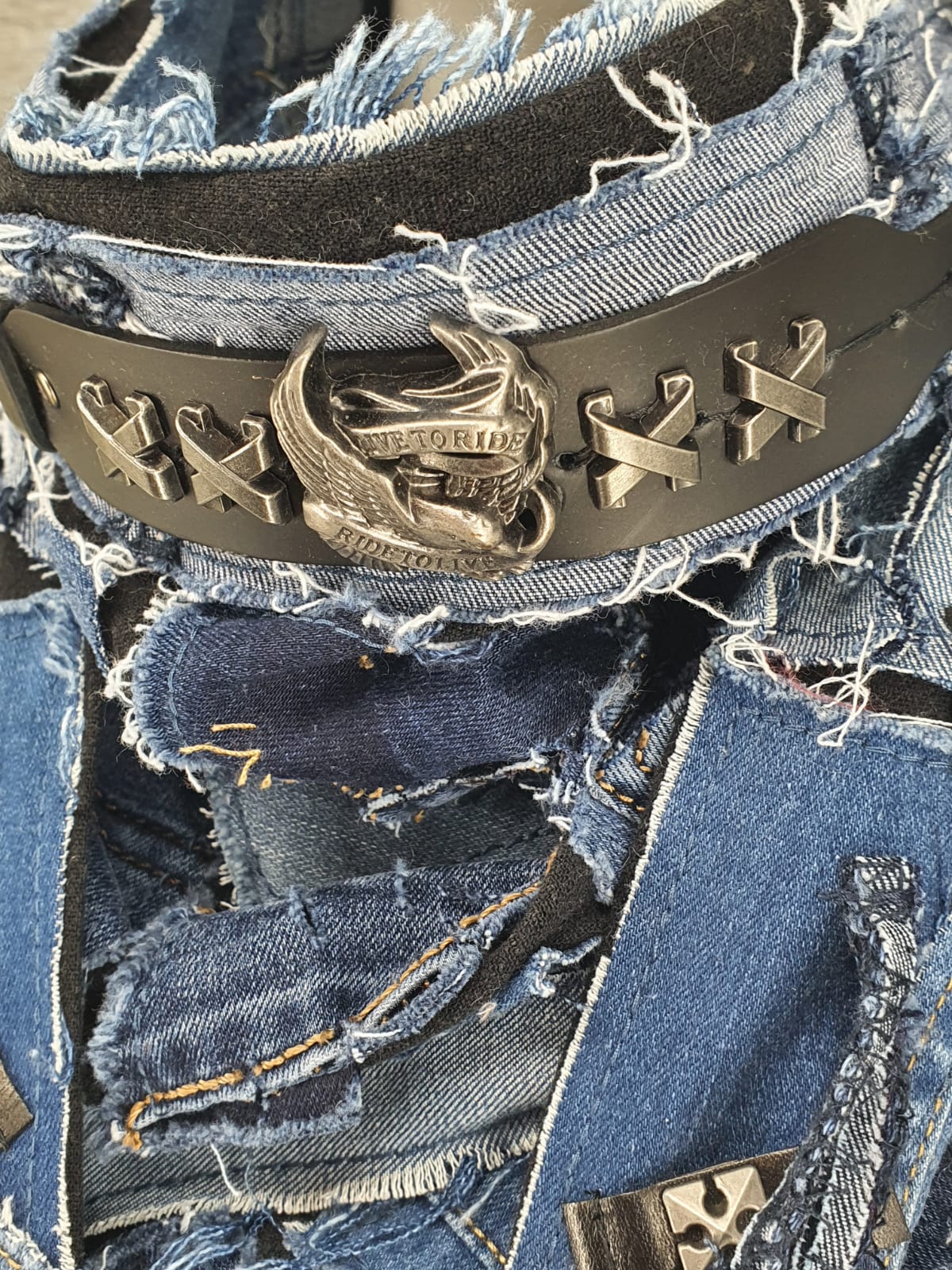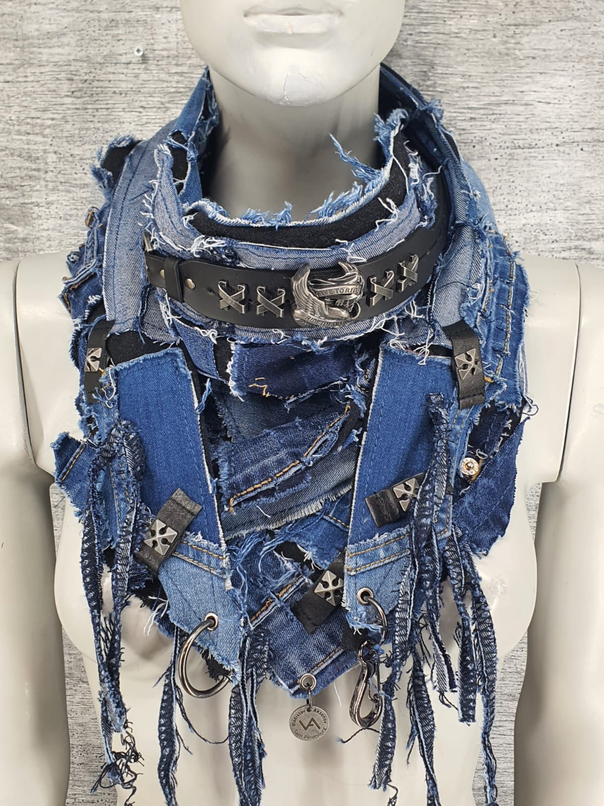 Джинсовый шарф с кожаным браслетом и нашивками. Отличный подарок для смелых, любяших скорость и путешествия.