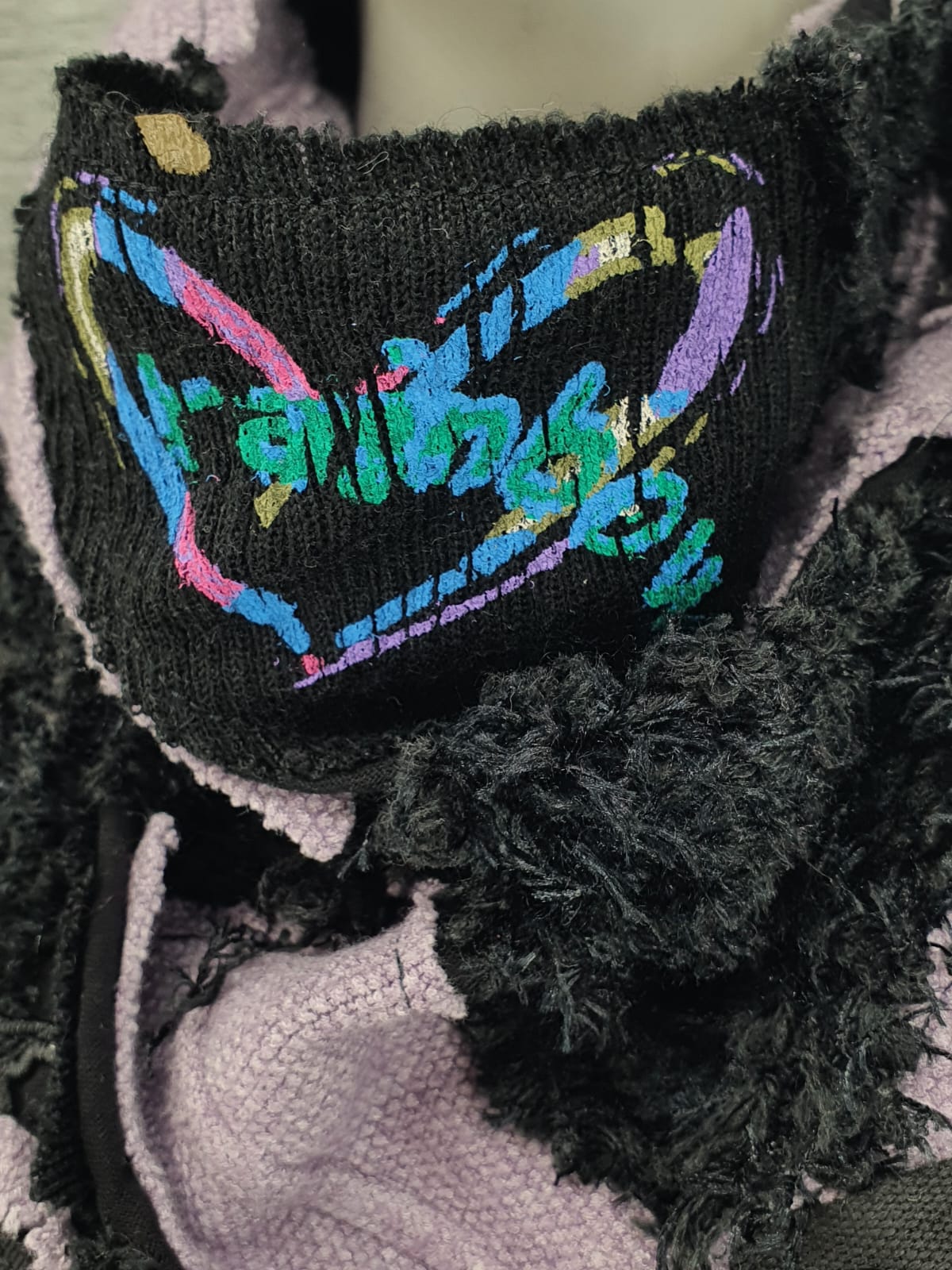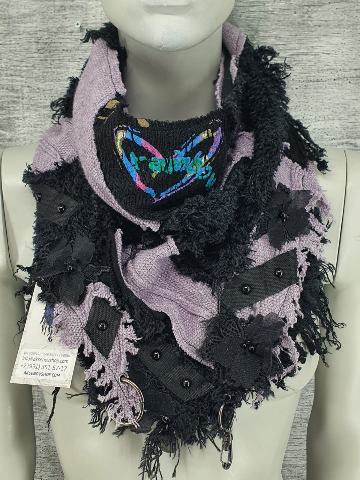 Шарф из чёрного и сиреневого джемперов на чёрной хлопковой основе, декорирован лентой и цветами.