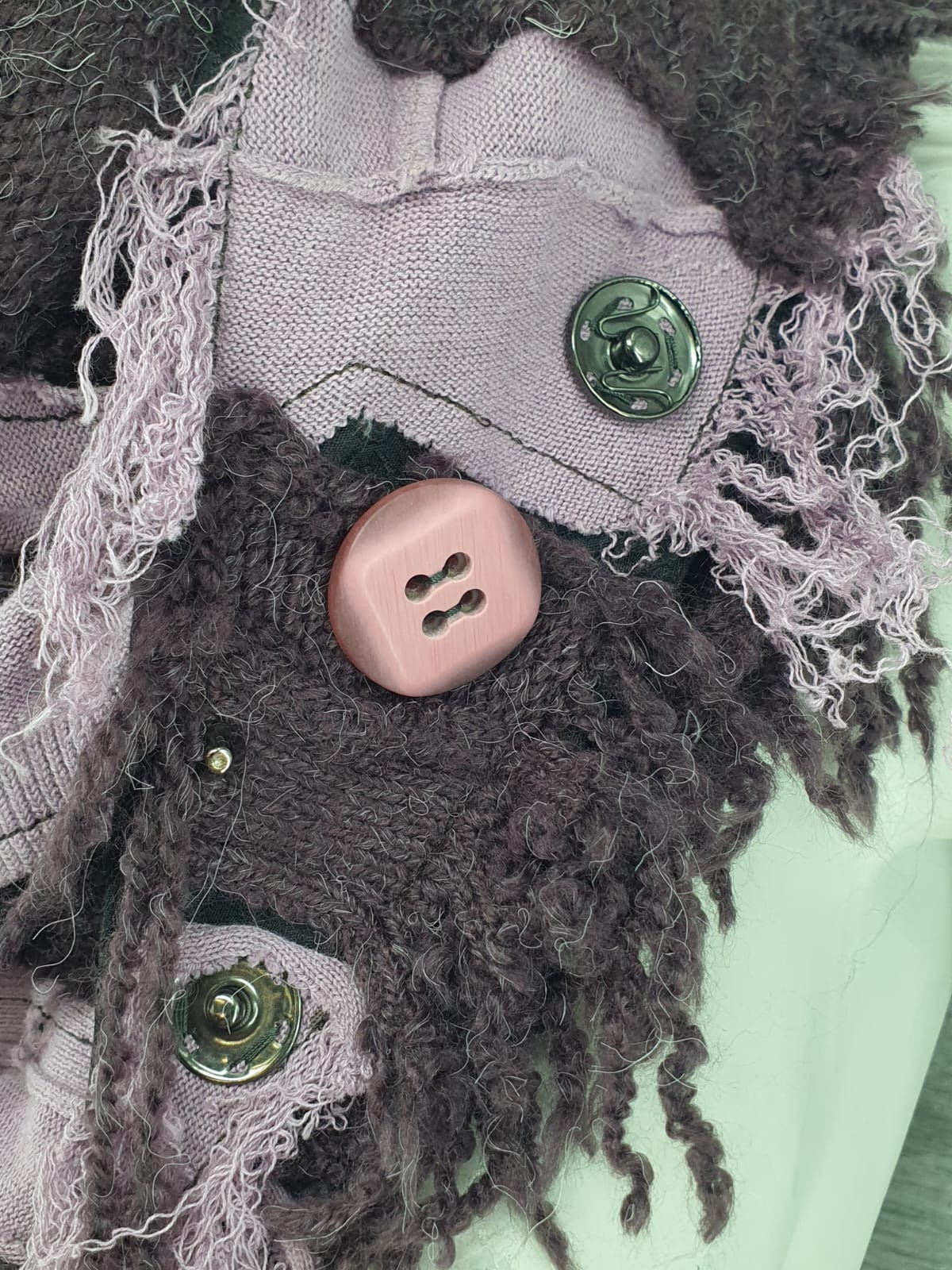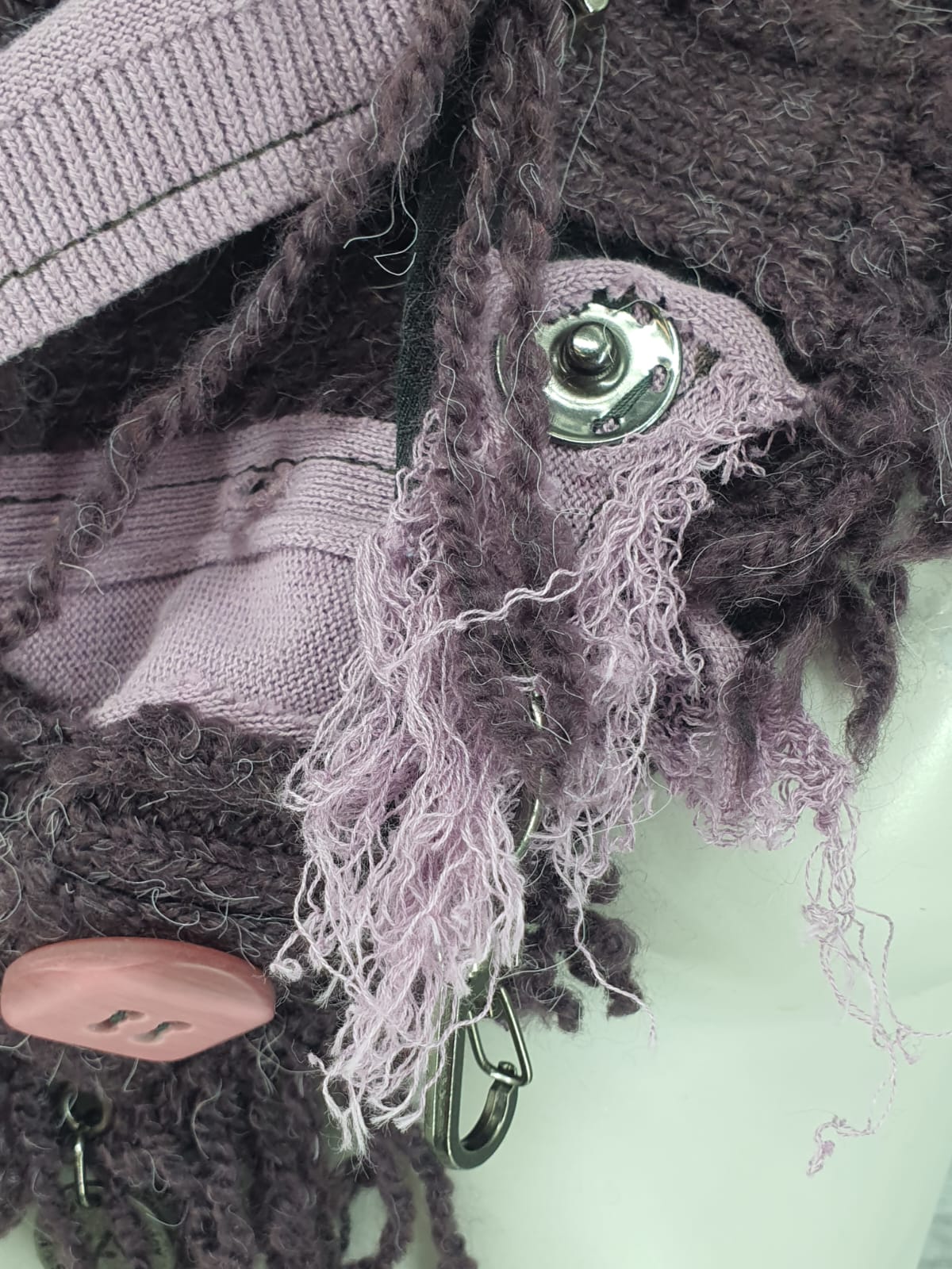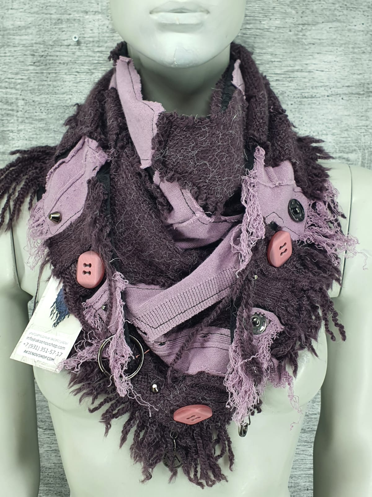 Шарф из джемперов на чёрной жаккардовой основе, декорирован пуговицами и металлическими элементами.