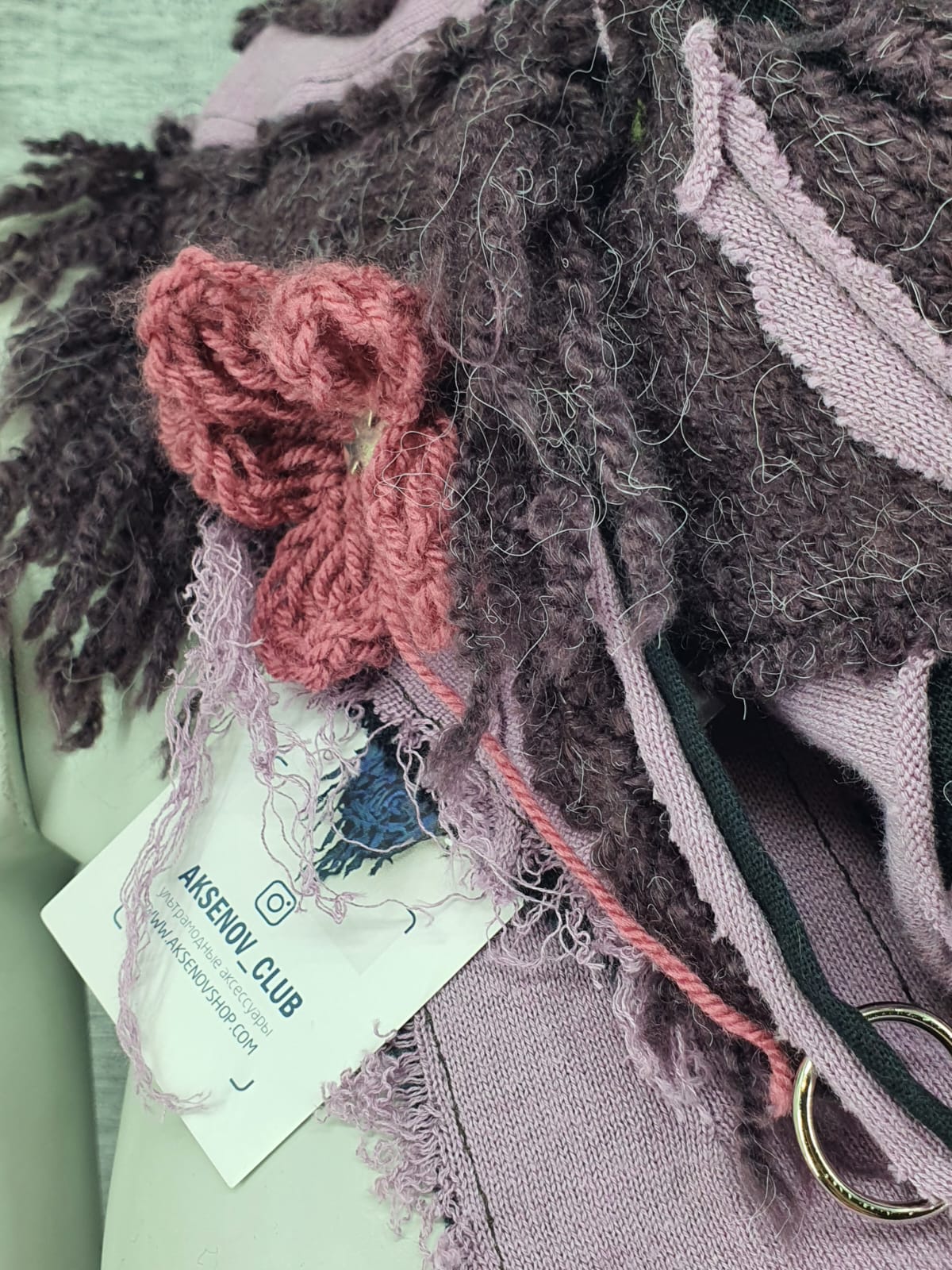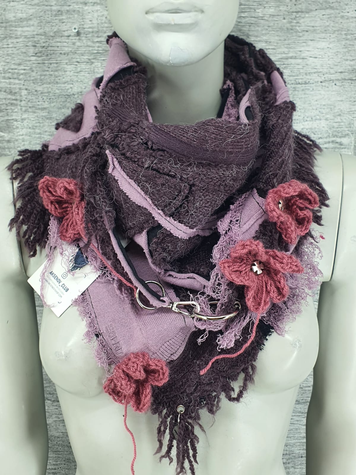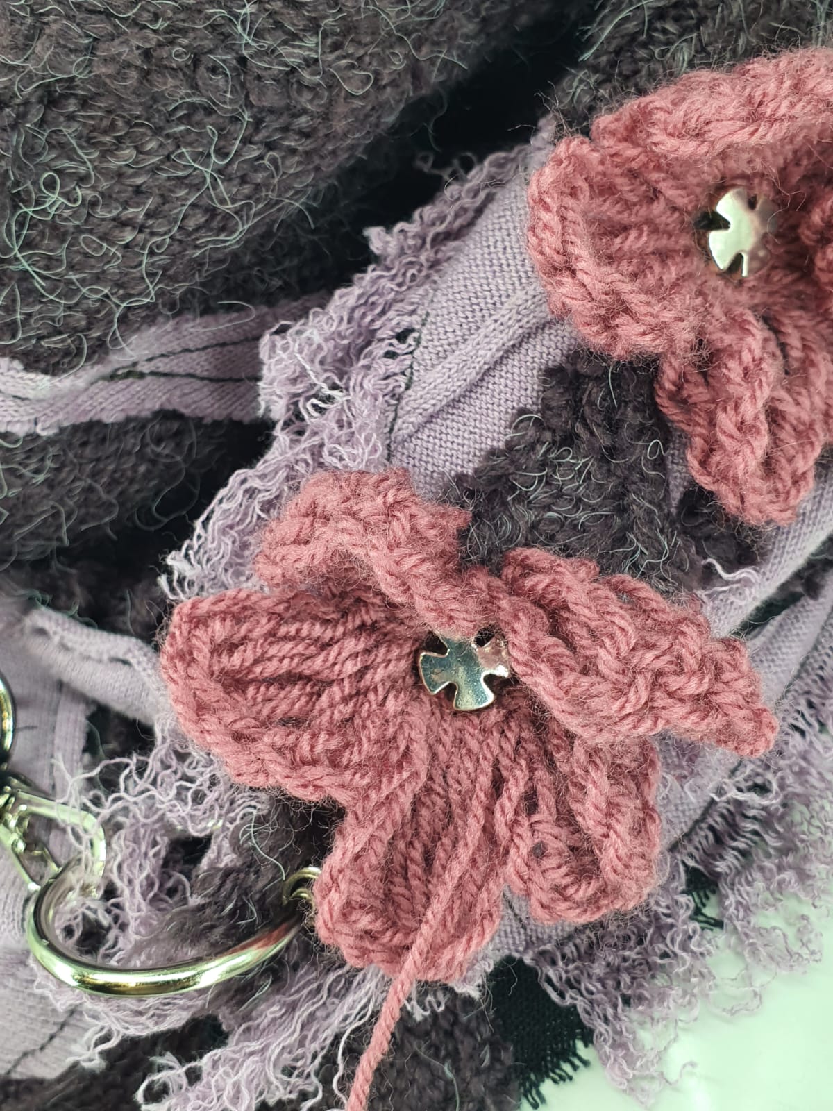Сиренево-фиолетовый шарф нв чёрной хлопковой основе, декорирован вязаными цветами и крестами.