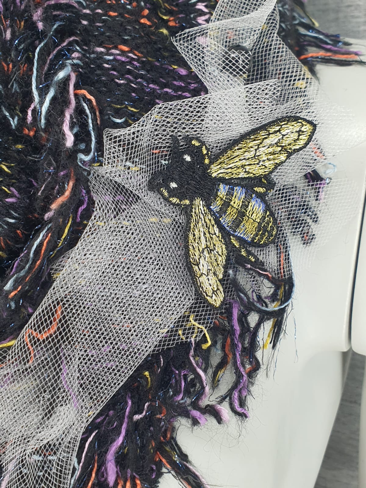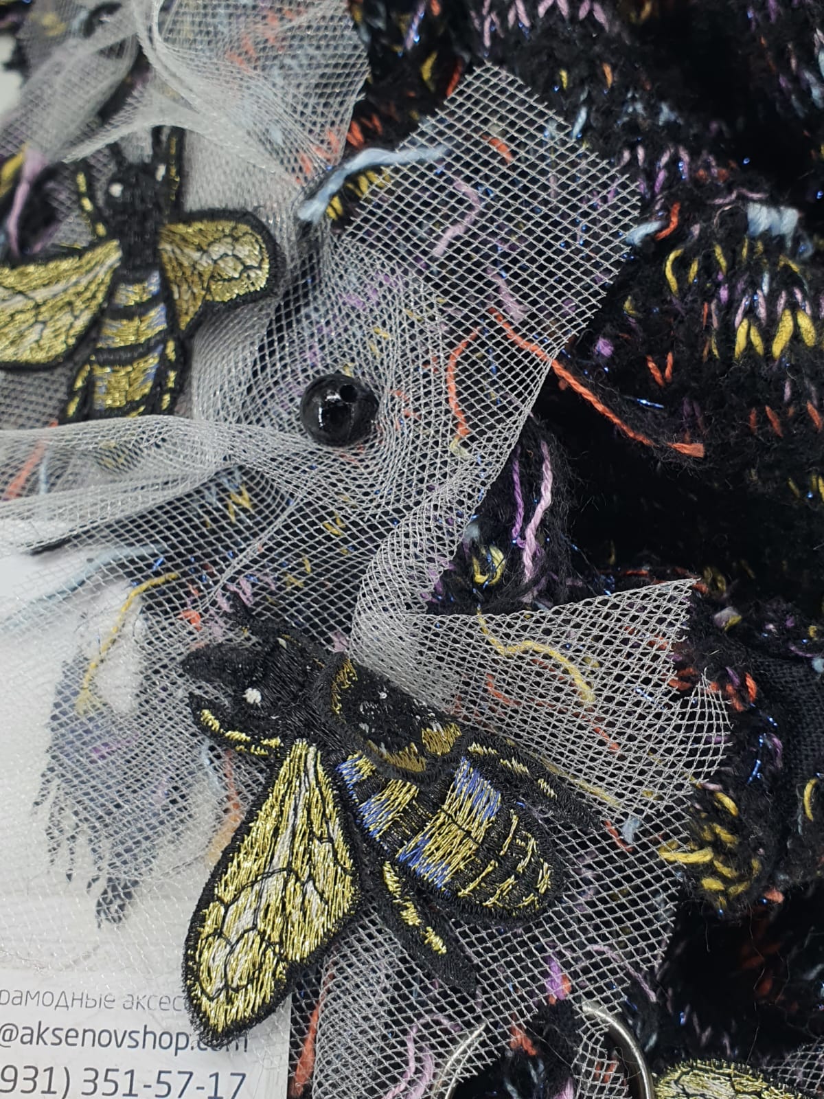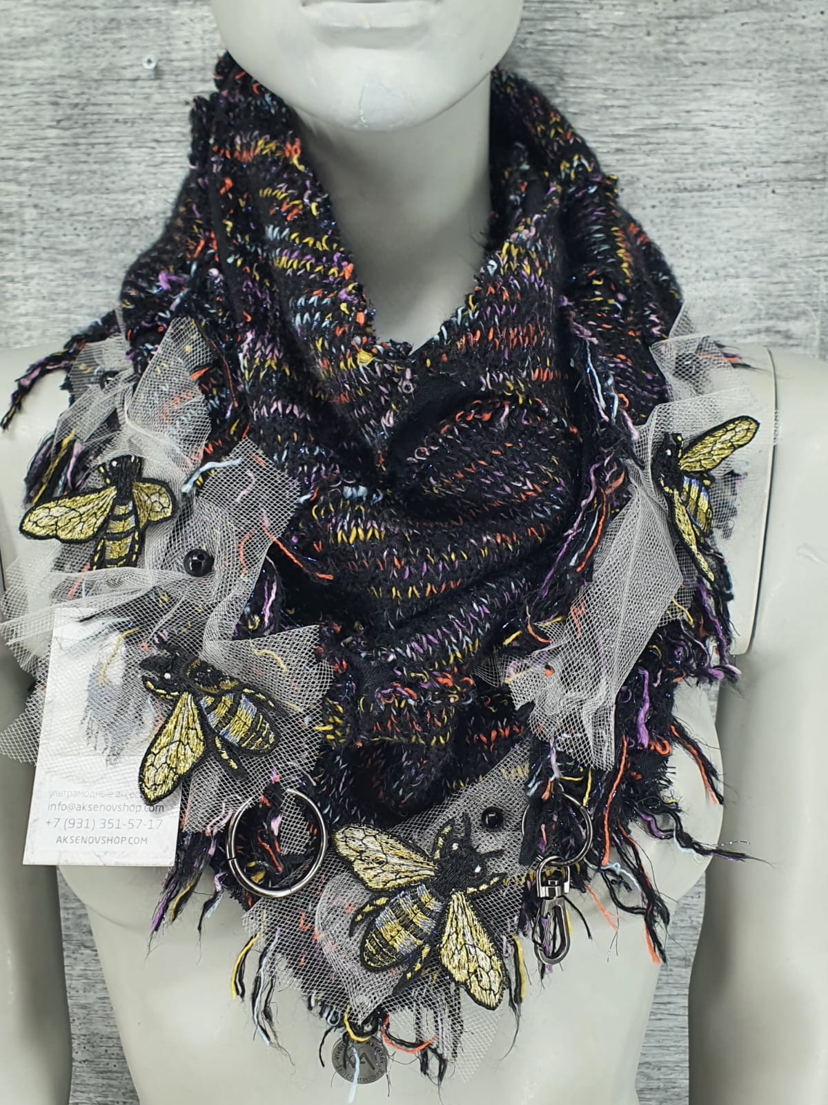 Шарф из пёстрого джемпера на чёрной хлопковой основе, декорирован белыми пуговицами и тесьмой.