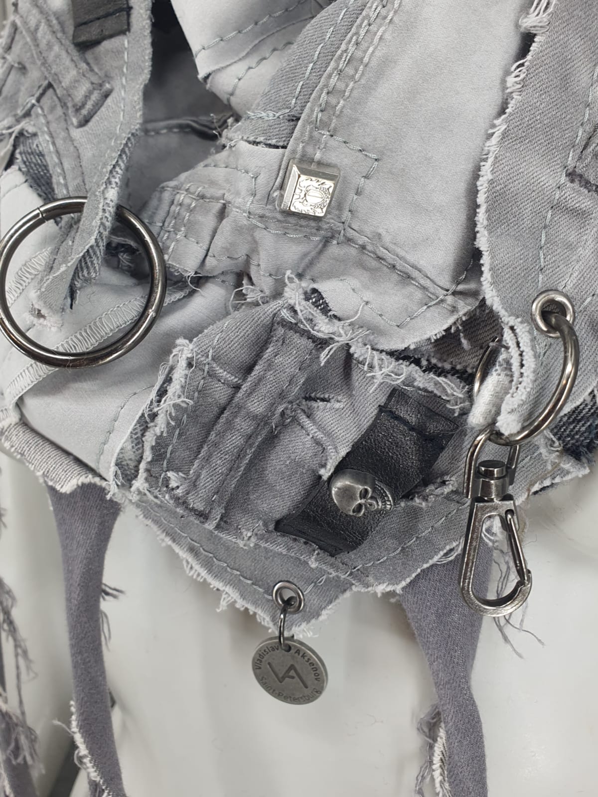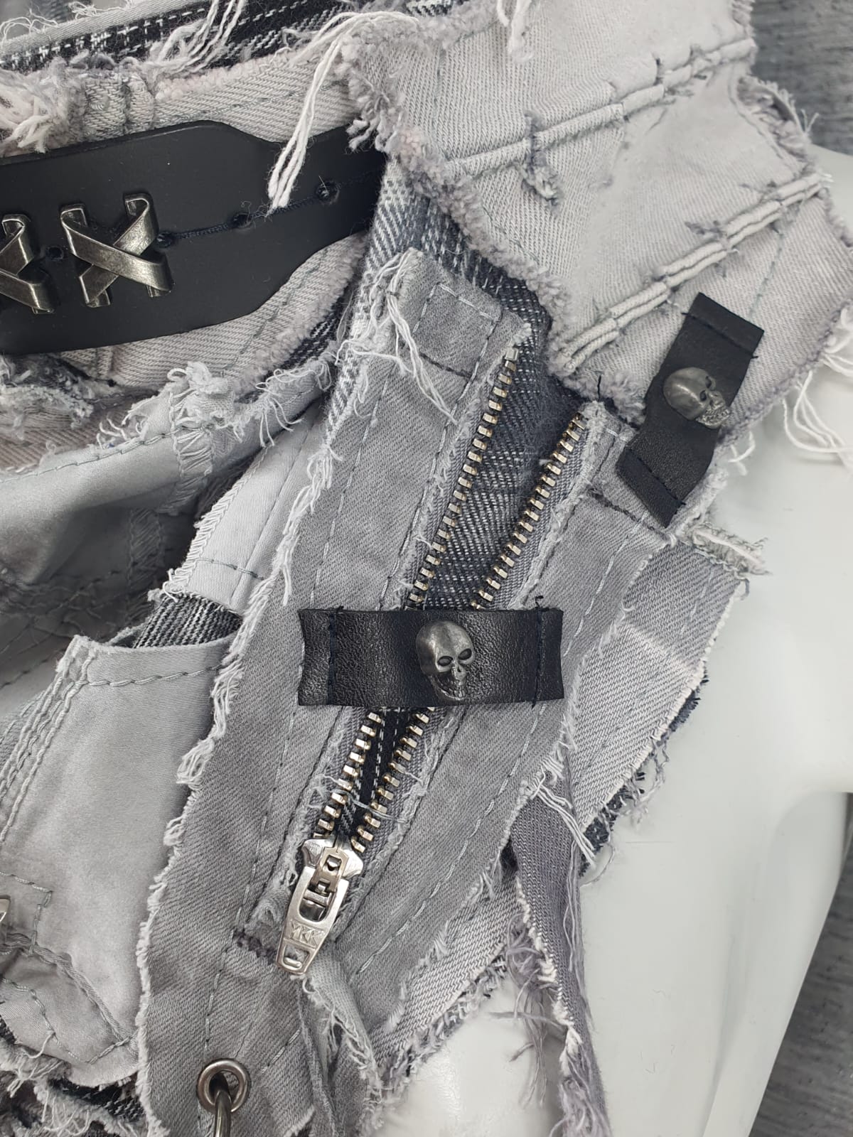 Шарф из серых джинсов на основе в клетку, декорирован кожаным браслетом и нашивками. Стильно и мужественно!