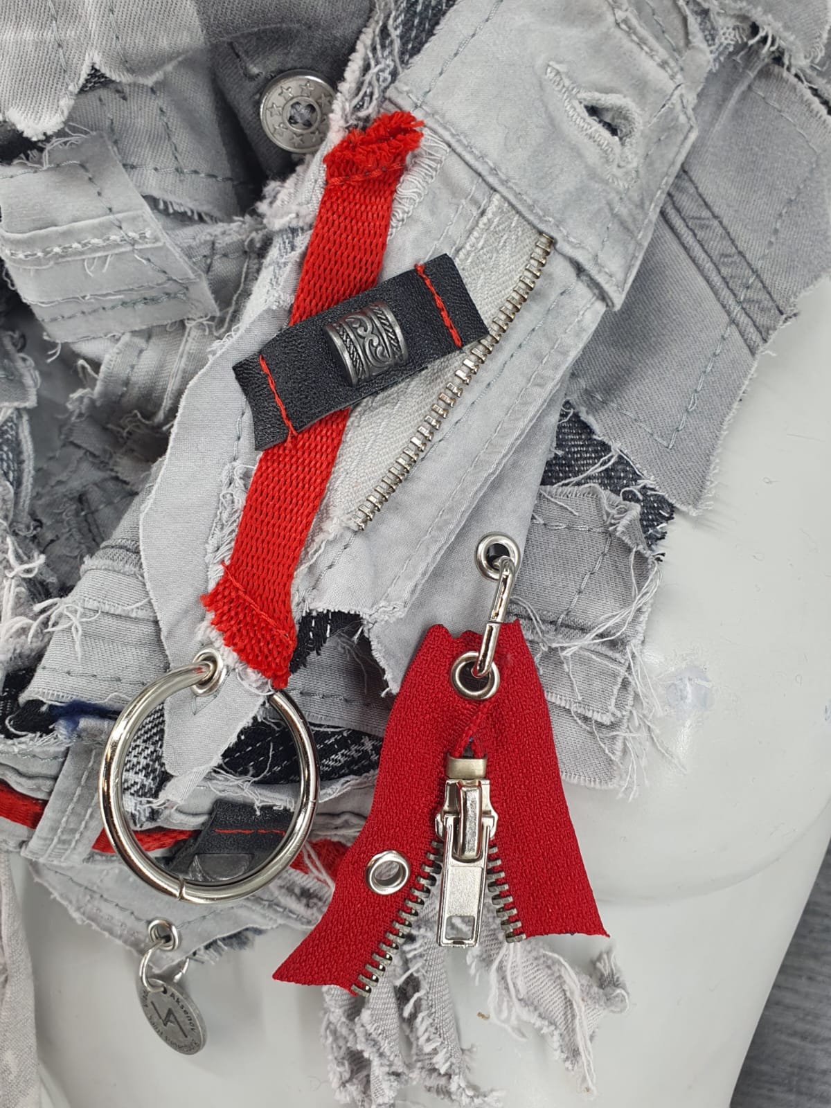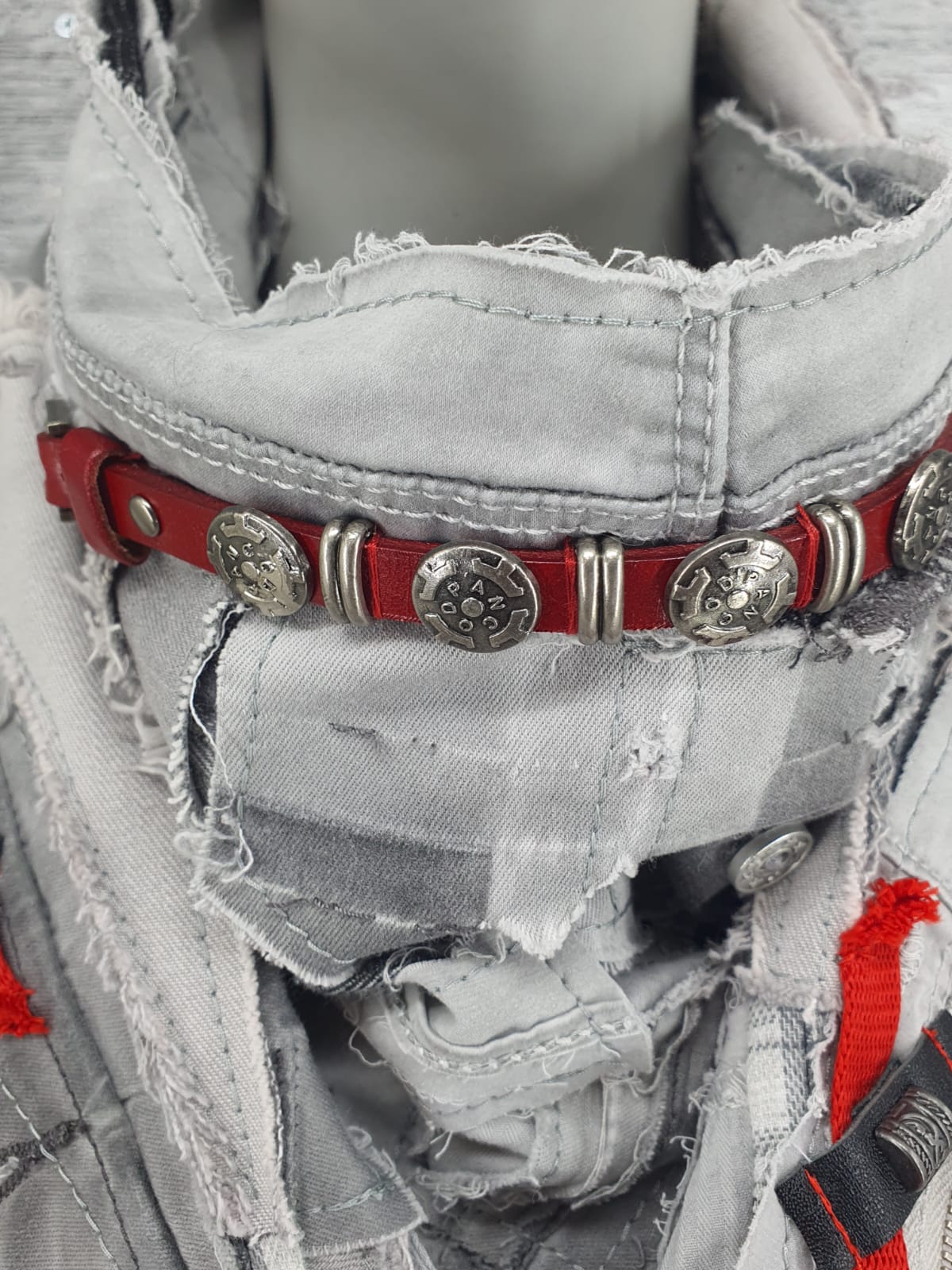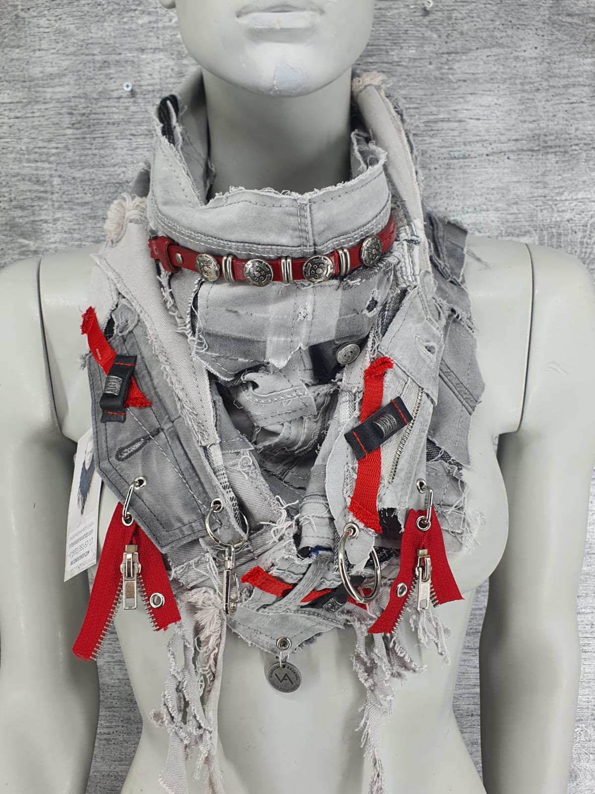Шарф из серых джинсов на основе в клетку, декорирован красным кожаным браслетом и нашивками, лентой и подвесами из молний.