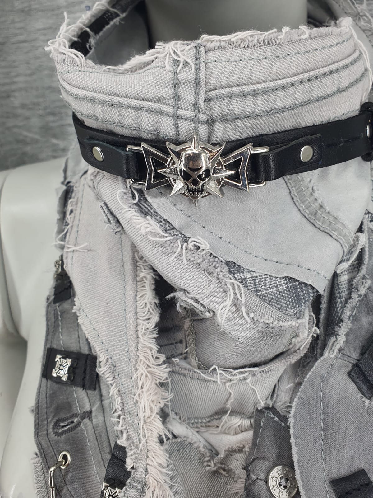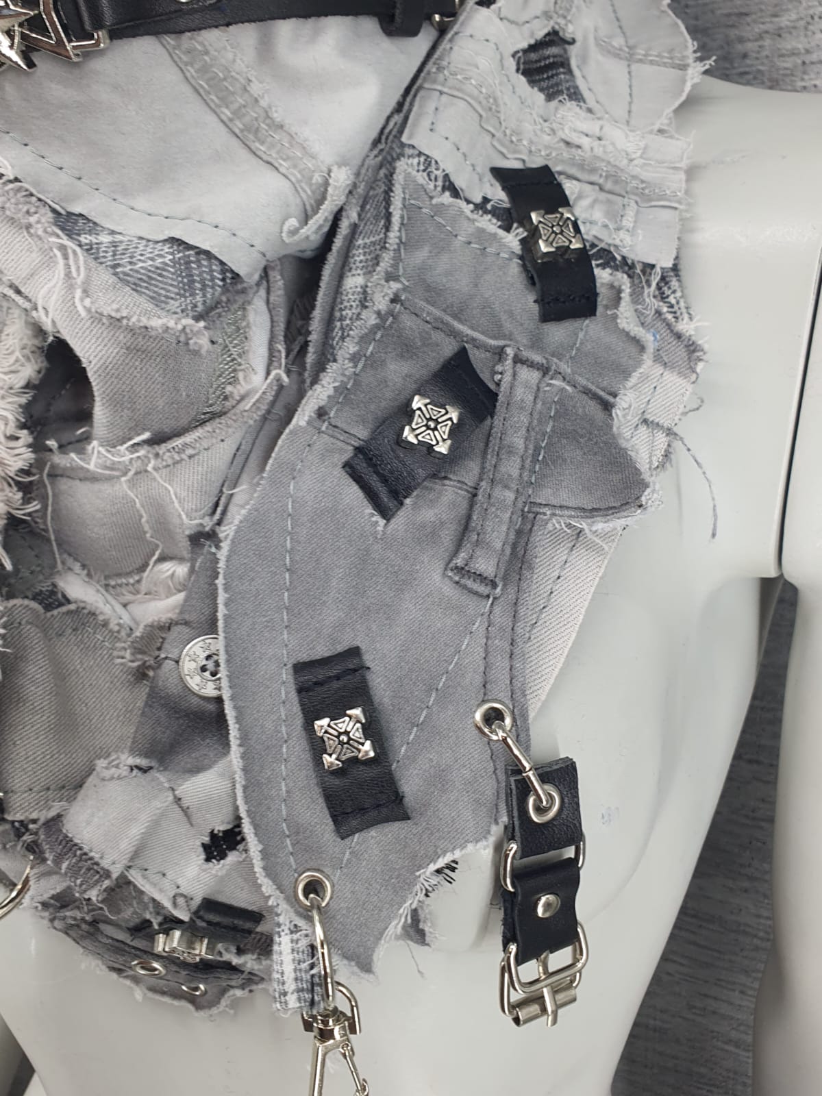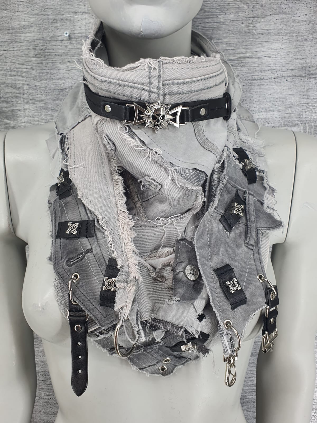 Шарф из серых джинсов на основе в клетку, декорирован кожаным браслетом, нашивками и подвесами.