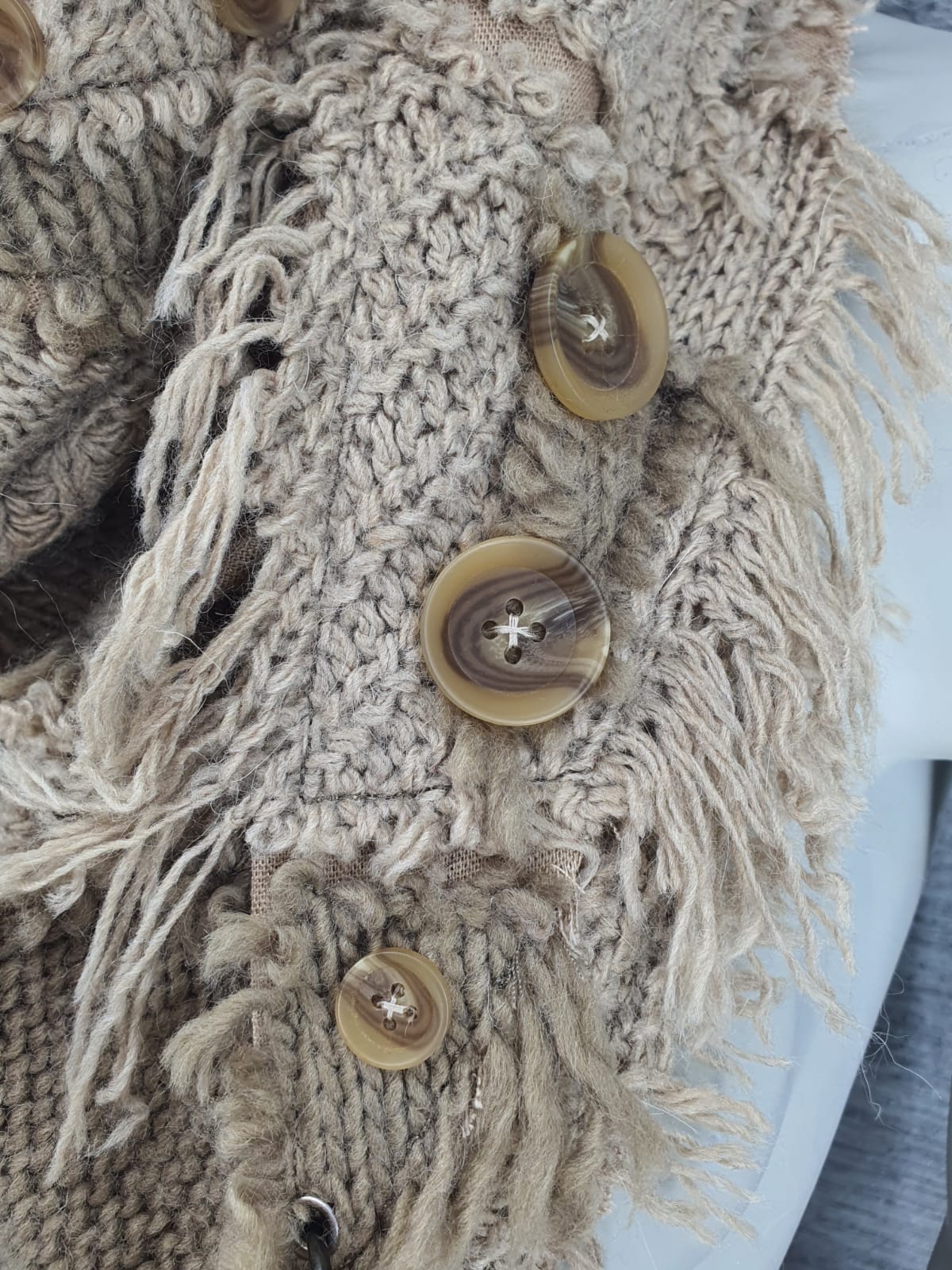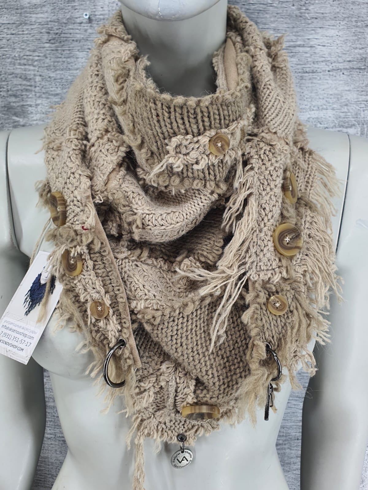 Бежевый шарф из свитера на хлопковой основе, декорирован пуговицами. Уютно и стильно, такой базовый цвет впишется в любой комплект одежды.