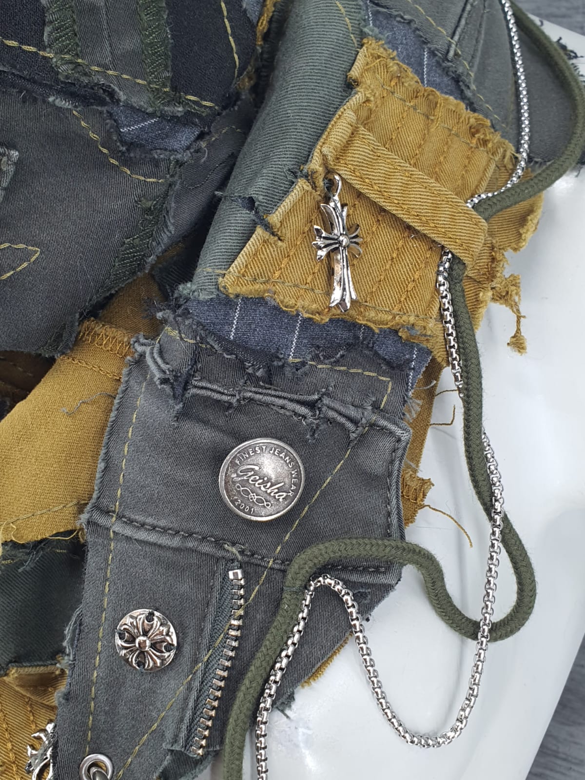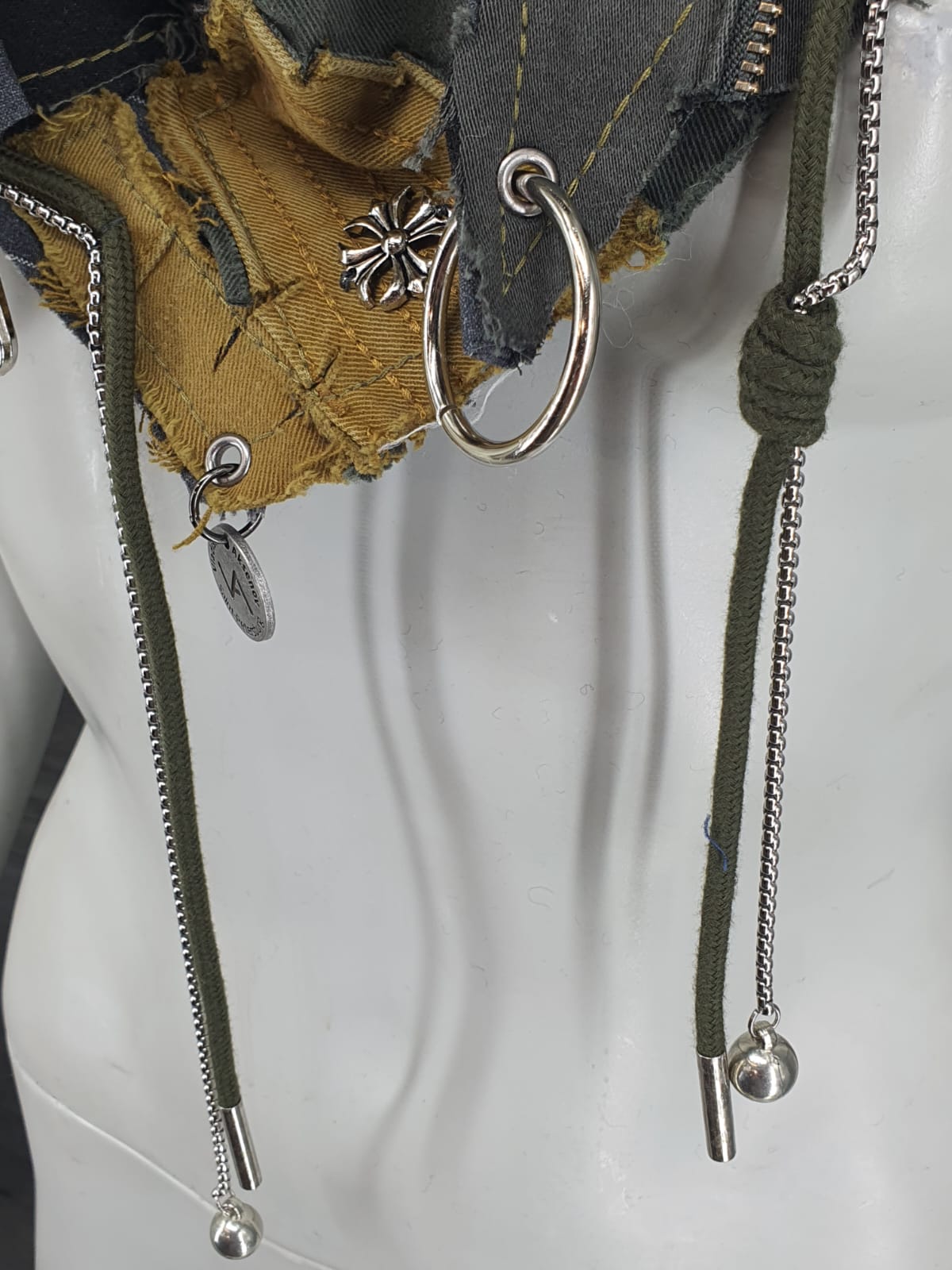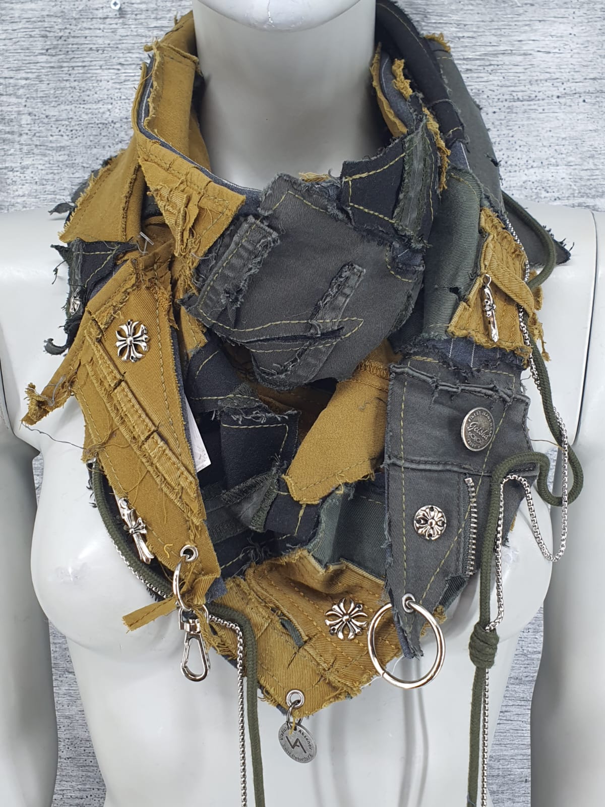 Шарф из джтнсов разных цветов на серой в полоску основе. Декорирован шнуром с цепочкой и металлическими элементами.