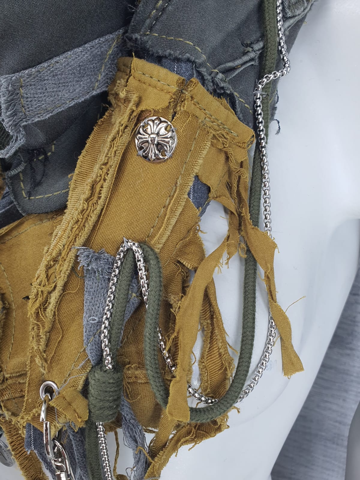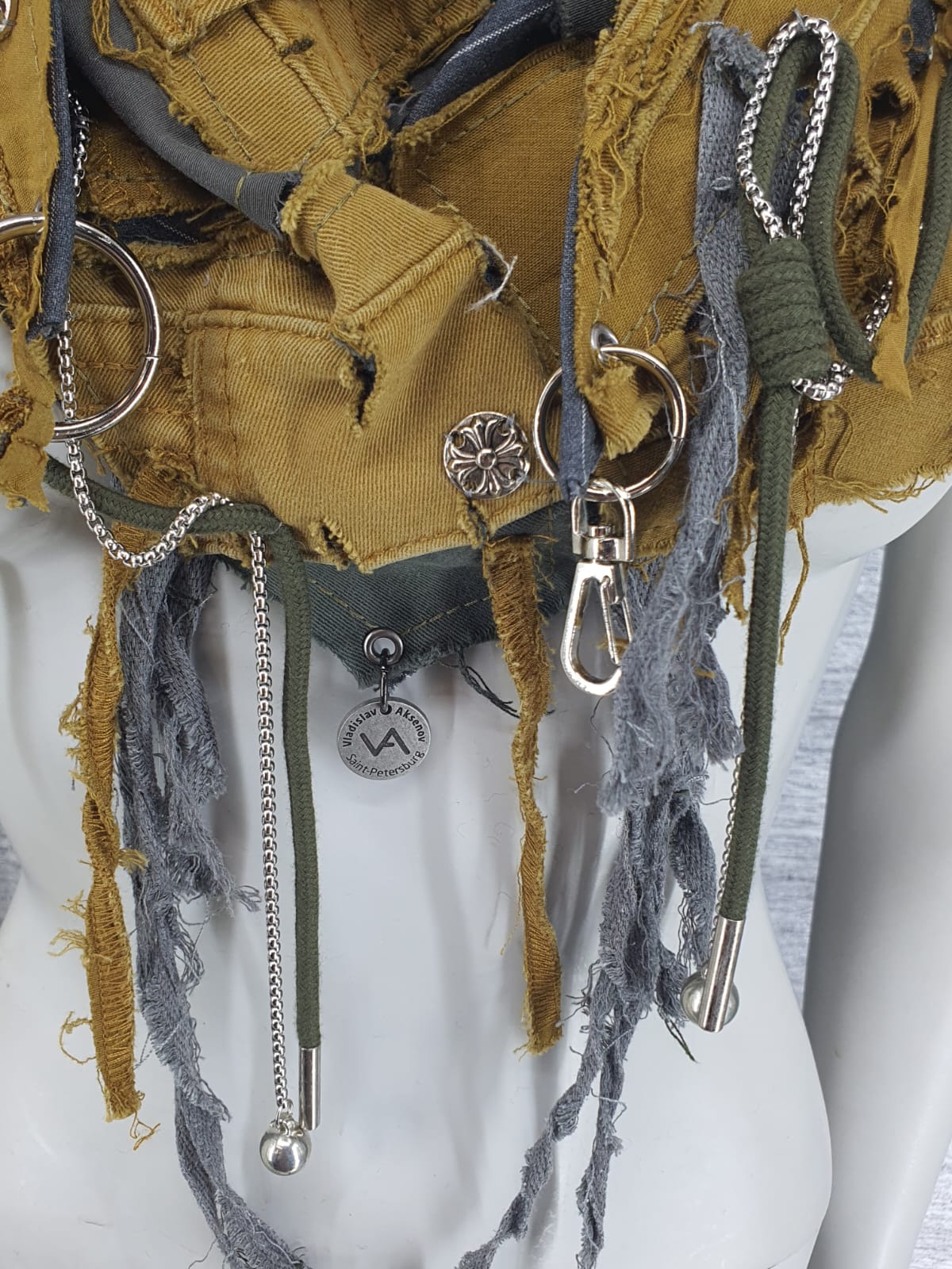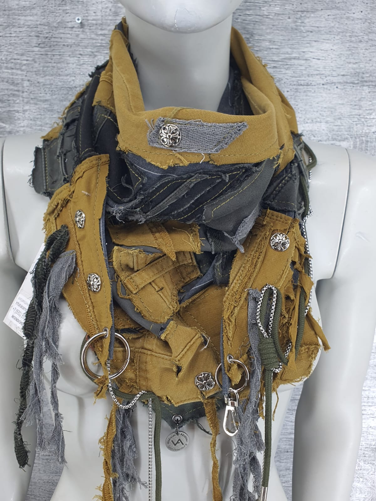 Шарф из джтнсов разных цветов на серой в полоску основе. Декорирован шнуром с цепочкой и металлическими элементами.