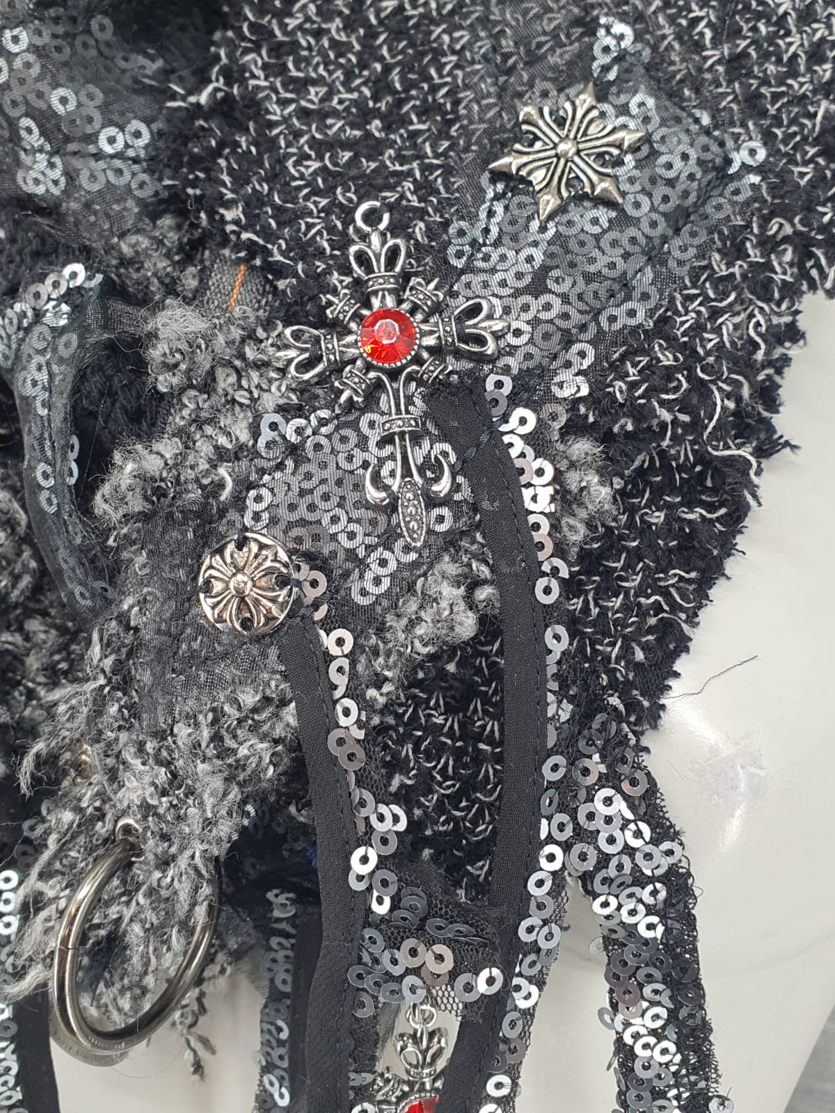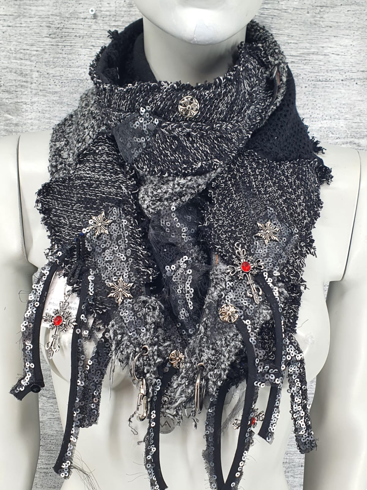 Шарф их чёрно-серых джемперов на чёрной хлопковой основе, декорирован металлическими крестами и звёздочками.