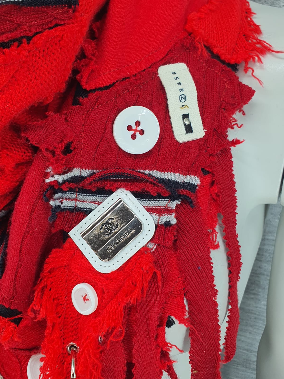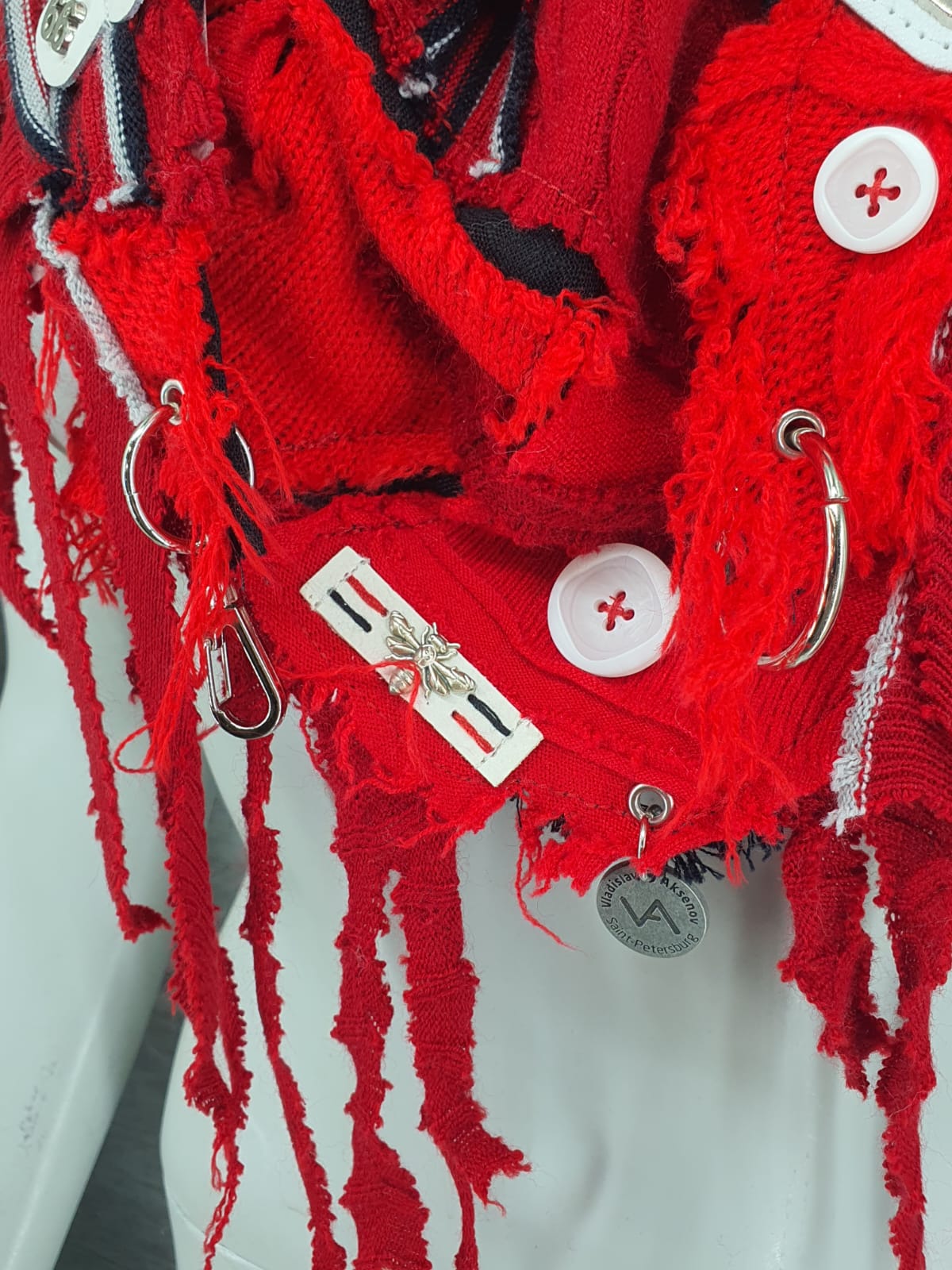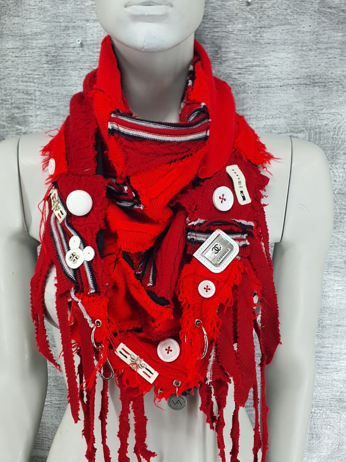 Шарф из красных джемперов на чёрной хлопковой основе, декорирован разлтчными нашивками и пуговицами. Яркий аксессуар добавит привлекательности в ваш образ.