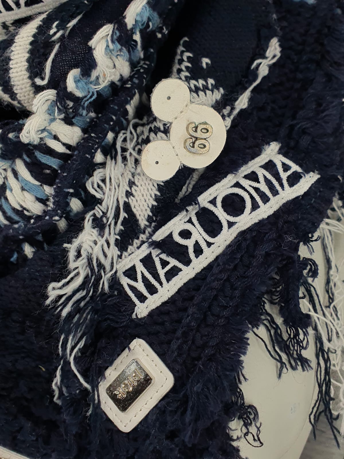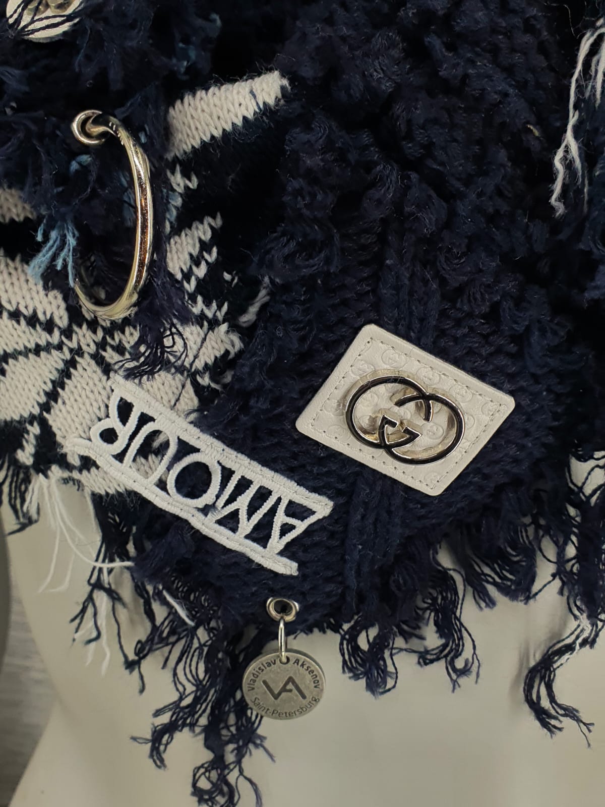 Шарф из синего свитера с принтом, на синей хлопковой основе, Декорирован нашивками и лентой с буквами. Не бойтесь Эксперементировать!
