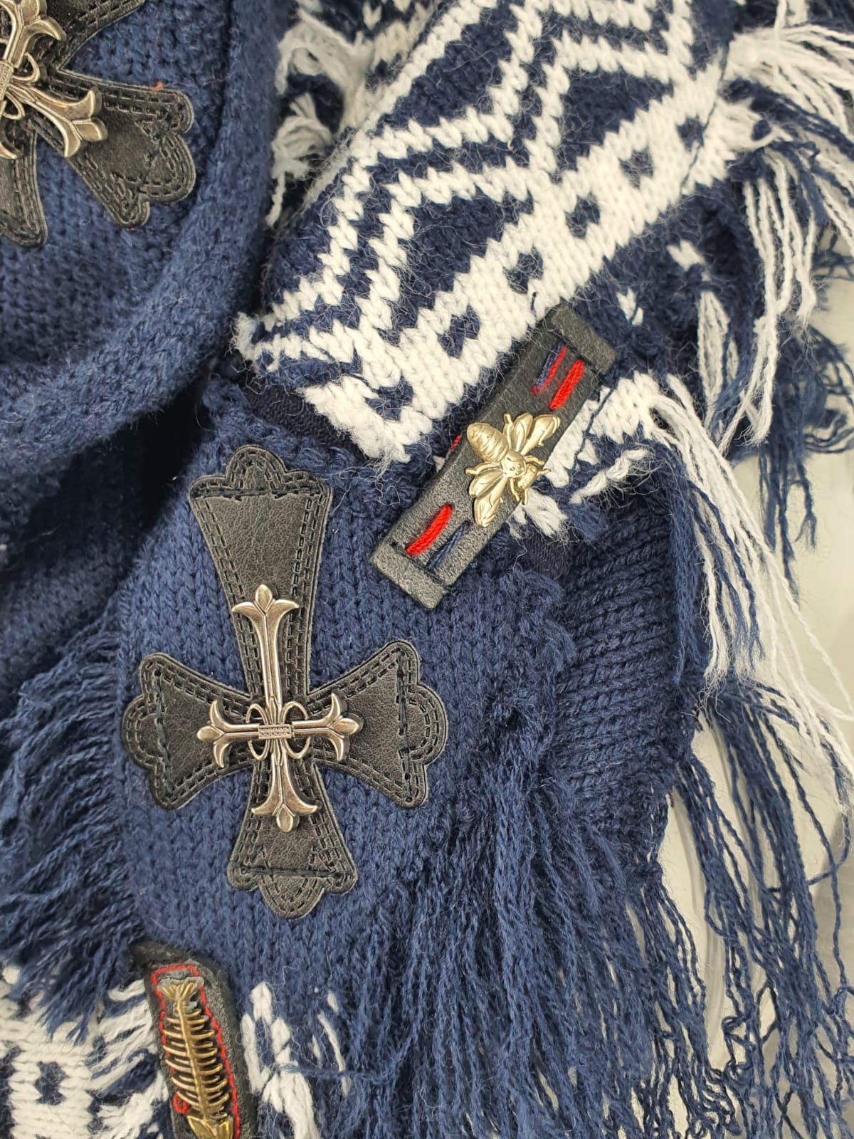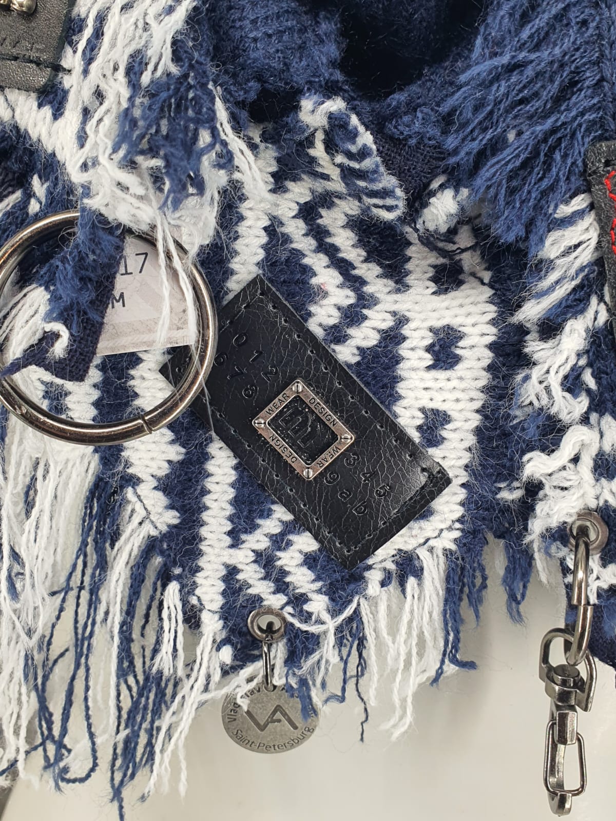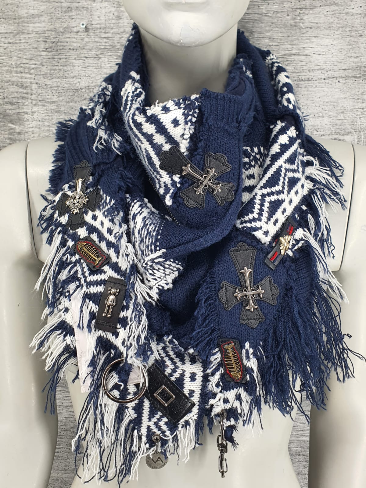 Шарф из синего свитера с принтом, на синей хлопковой основе, Декорирован нашивками. Не бойтесь экпериментов, меняйтесь!