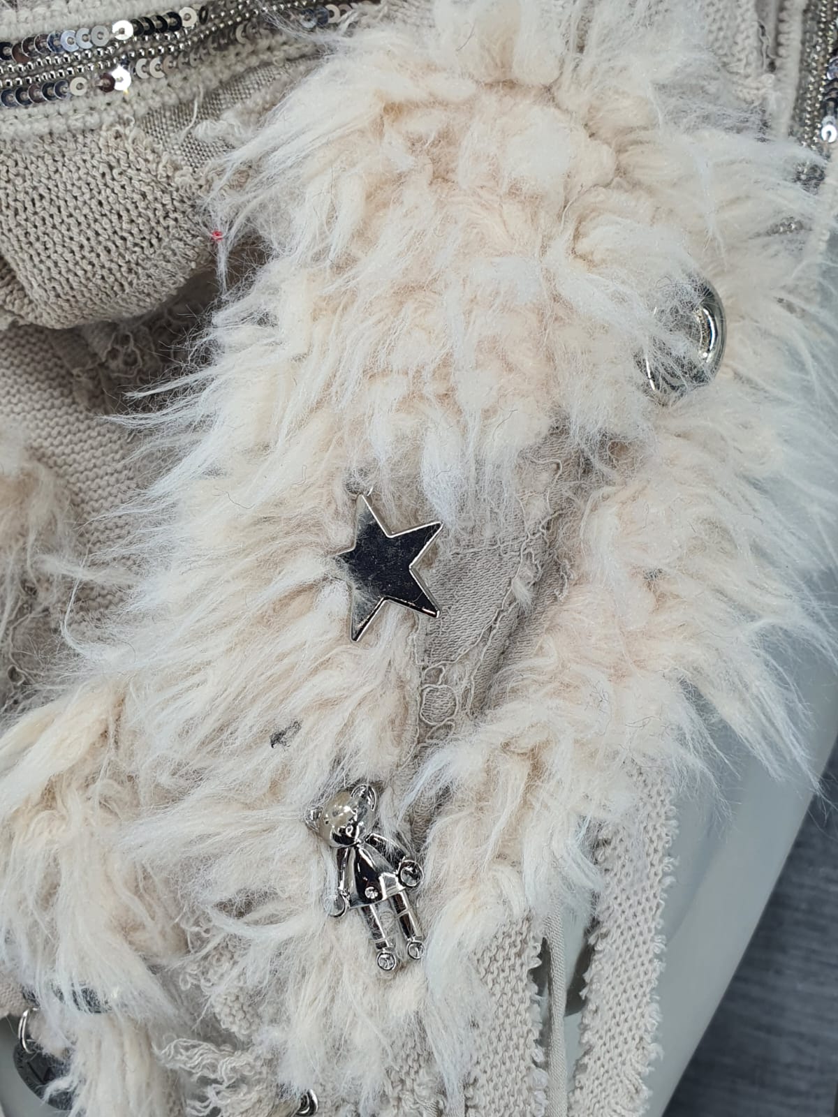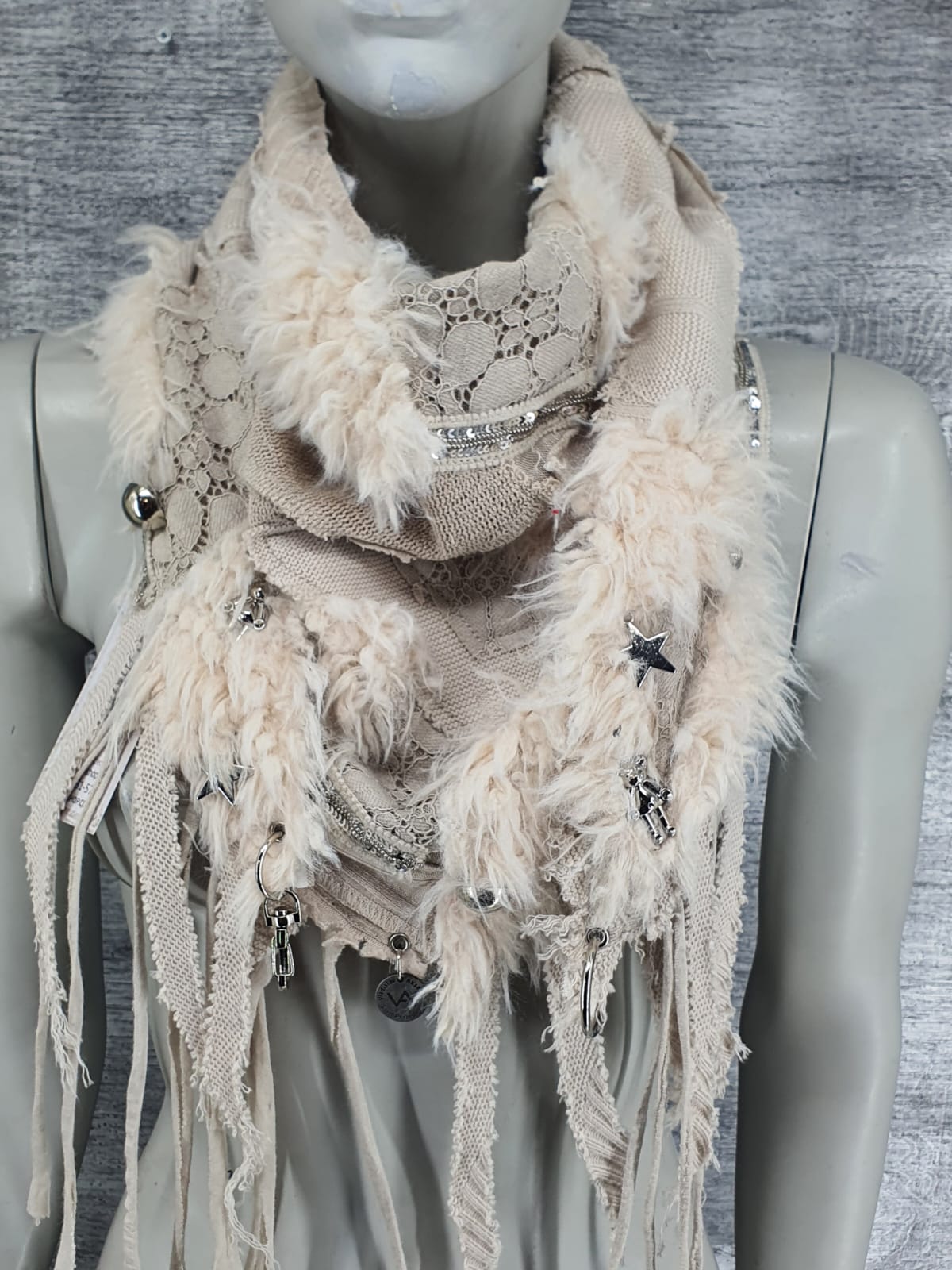 Шарф молочного цвета с мехом и кружевом на мягкой льняной основе, декорирован различными металлическими элементами.