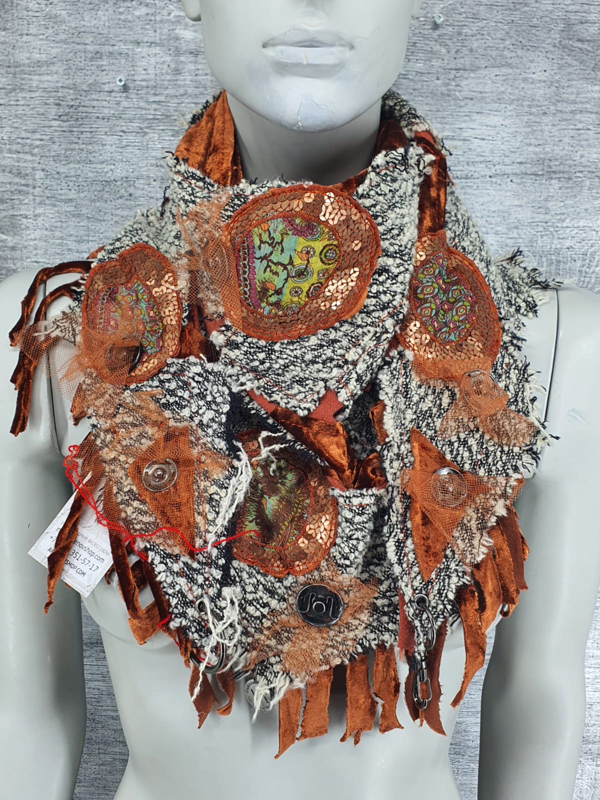 Шарф из шерстяной ткани с бархатом ня рыжей хлопковой основе, декорирован нашивками с пайетками сеткой и кнопками.