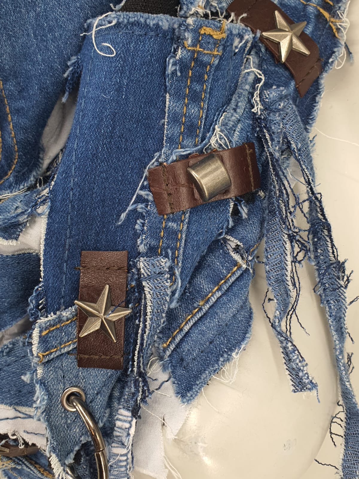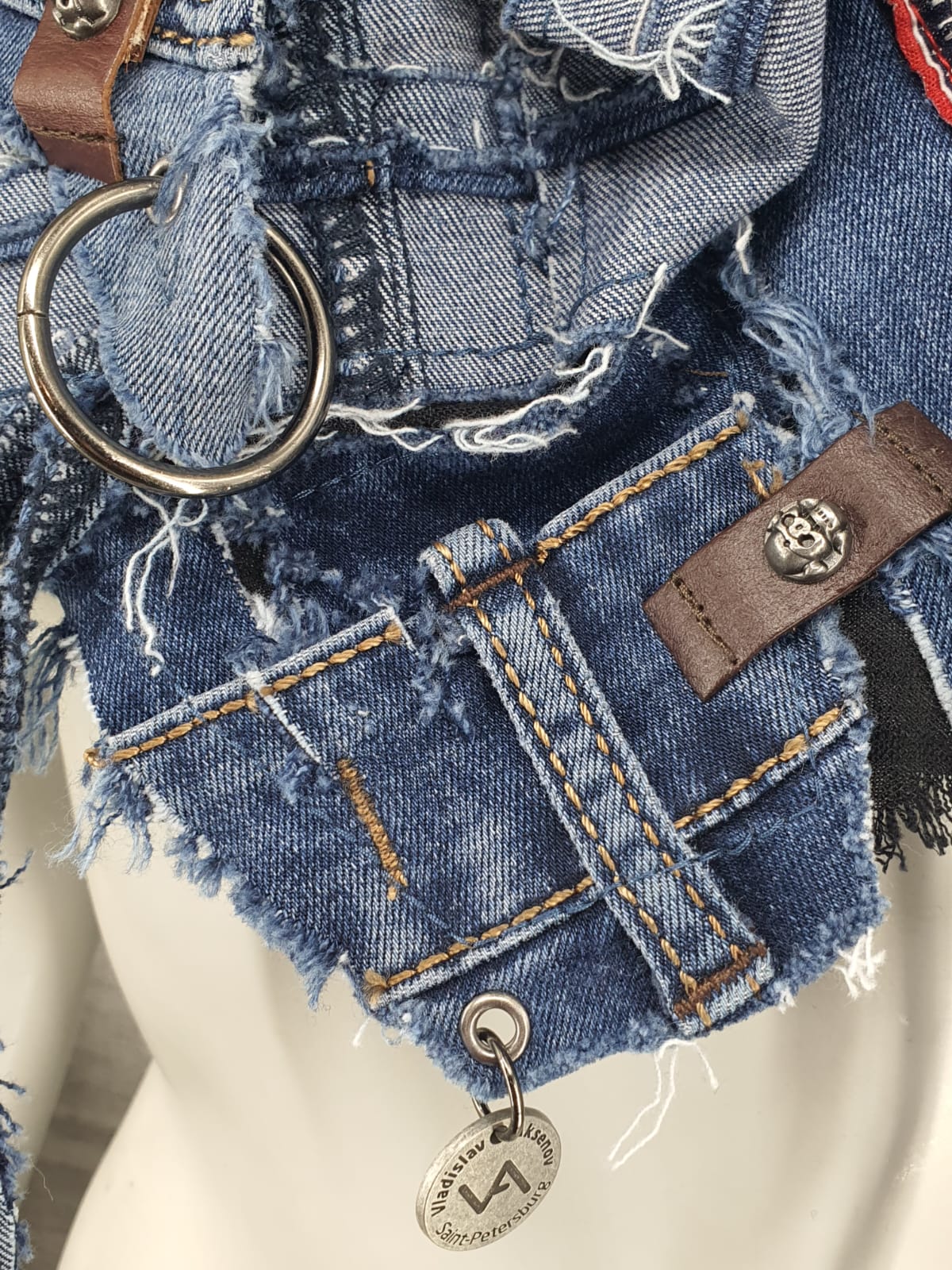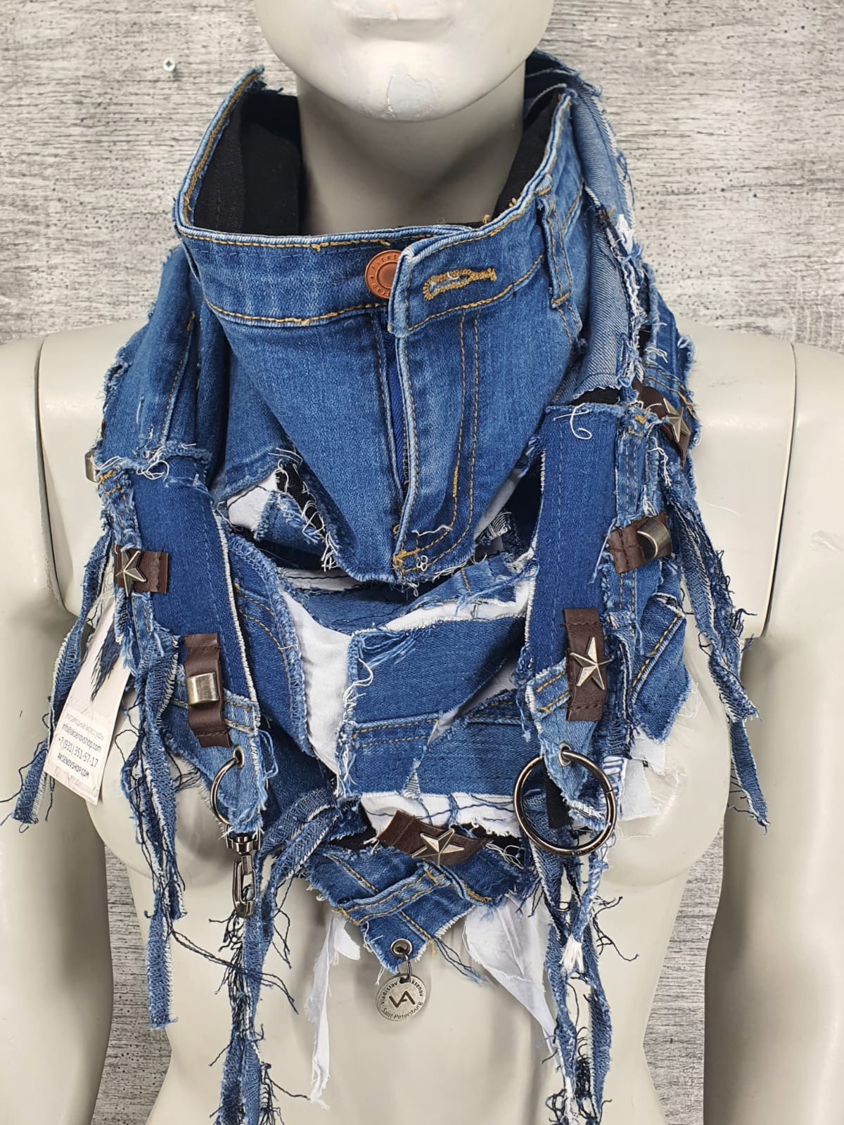 Шарф из синих джинсов на чёрной хлопковой основе, декорирован кожаными нашивками.