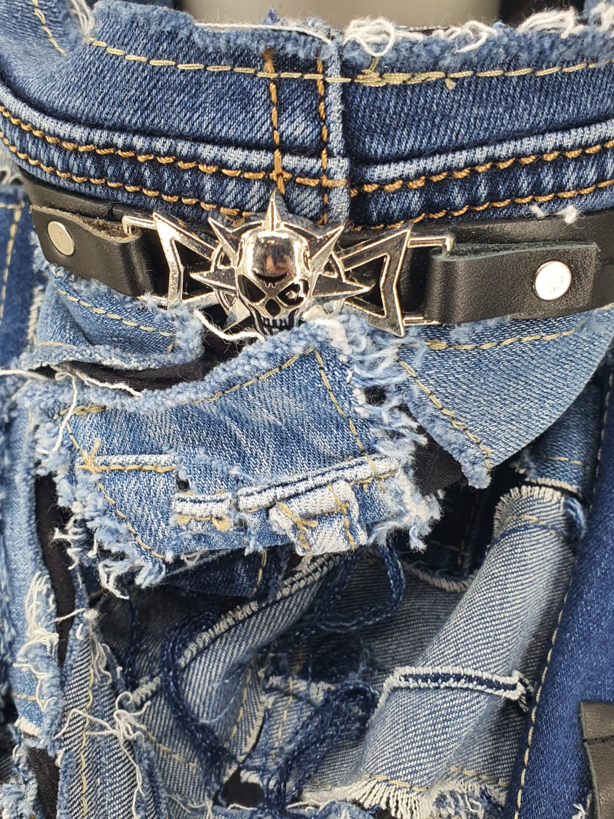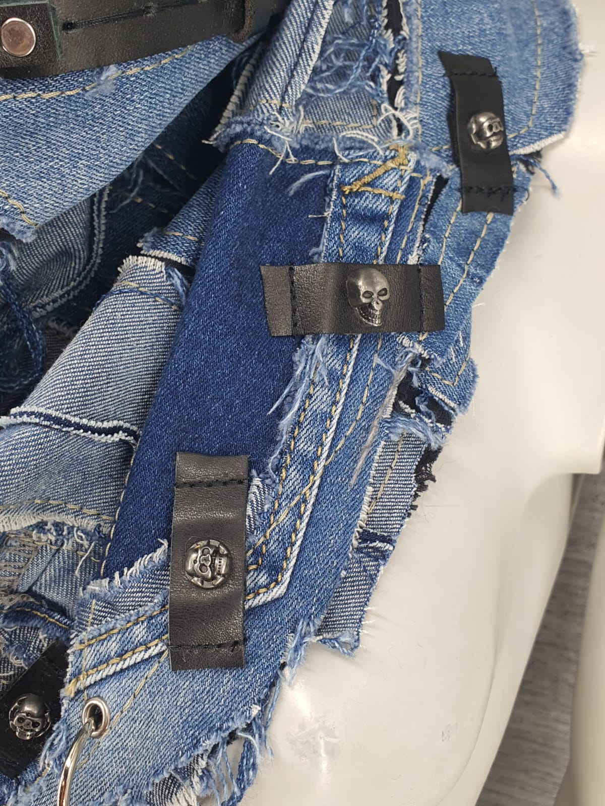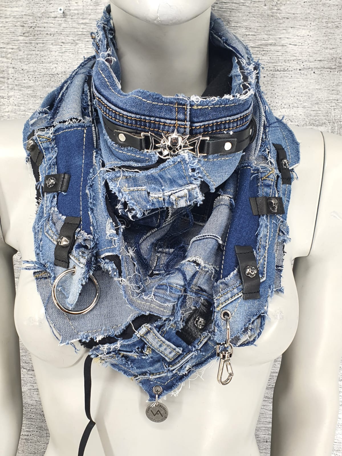 Шарф из синих джинсов на чёрной хлопковой основе, декорирован браслетом с черепом и кожаными нашивками.