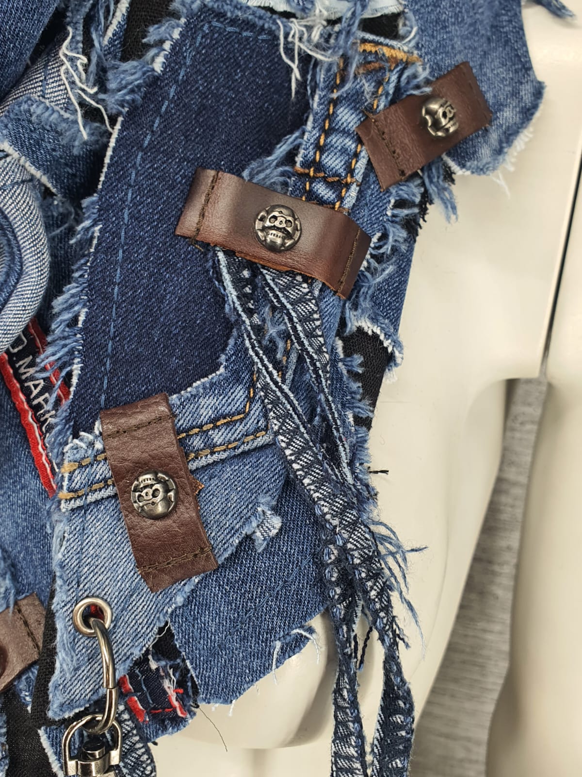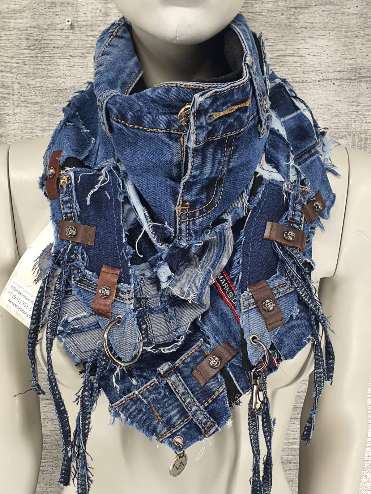 Шарф из синих джинсов на чёрной хлопковой основе, декорирован кожаными нашивками.